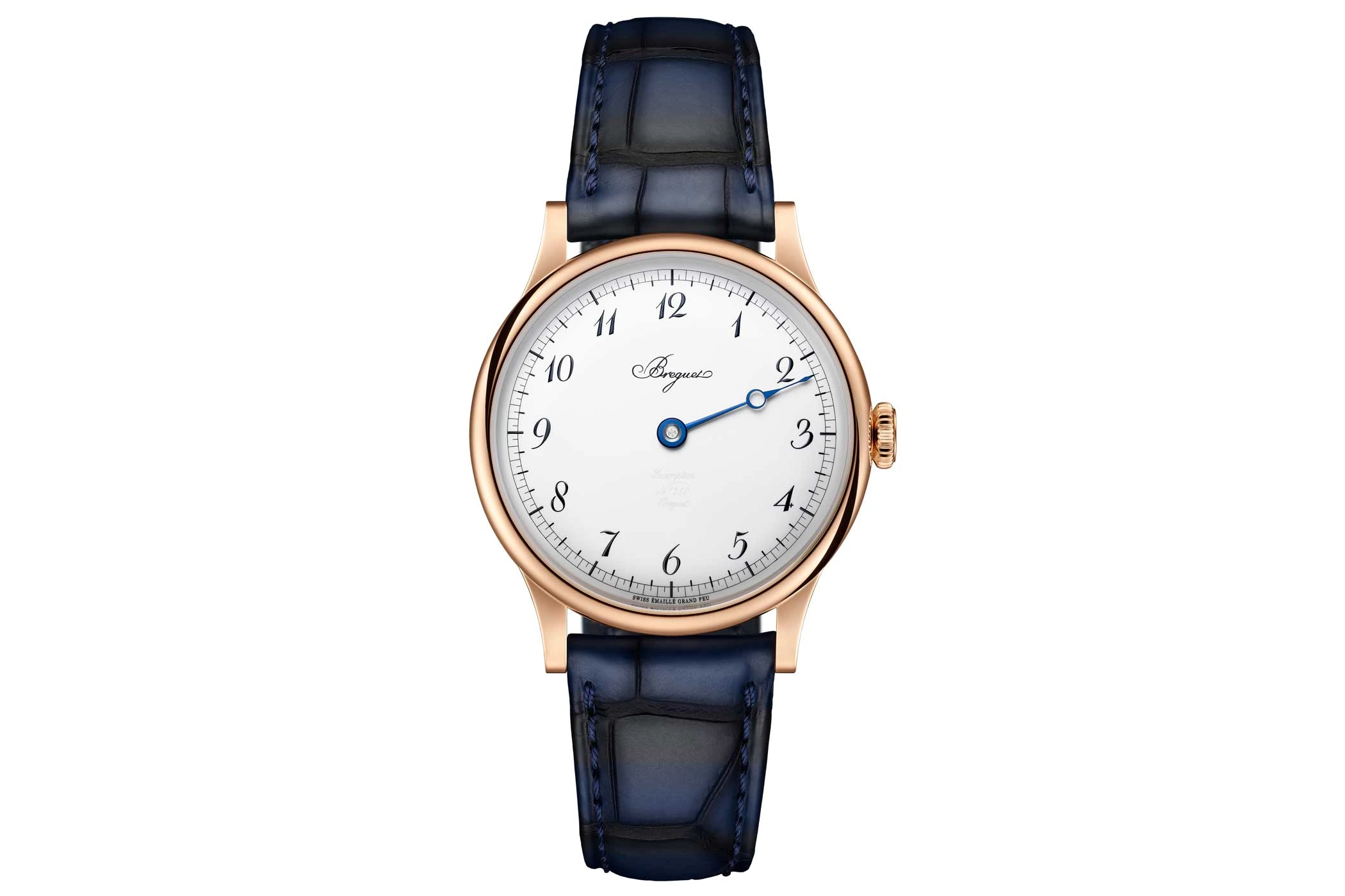 Charakteristisch für die Manufaktur sind das Grand-Feu-Emailzifferblatt mit Breguet-Ziffern und der gebläuten Breguet-Zeiger mit offener Spitze. Hinzu kommen die kaum sichtbare Signatur sowie der Zusatz „Souscription“. Beides ist nur bei passendem Lichteinfall erkennbar. Eine klassische Eisenbahnminuterie rahmt das Zifferblatt und erleichtert das Ablesen der Einzeigeruhr.