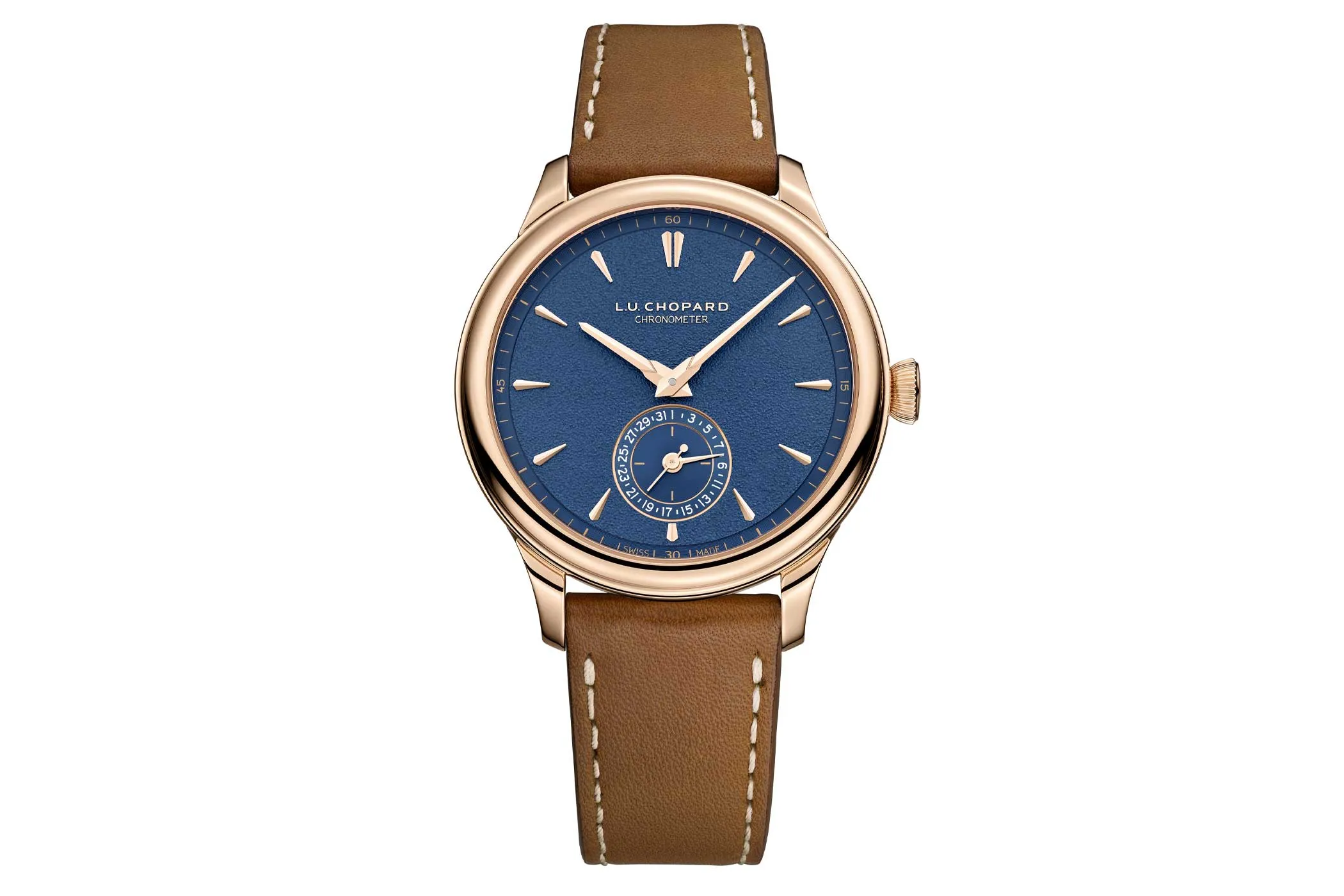 Hinsichtlich Zifferblattfarbe – ein kräftiges, galvanisch erzeugtes Blau – sowie kleine Sekunde und Datum bei 6 Uhr macht diese L.U.C. Quattro wiederum Anleihen bei der modernen Dress Watch. Dennoch wirkt das Zifferblatt überaus aufgeräumt. Möglich macht dies auch das Manufakturkaliber L.U.C 98.09-L. Es unterscheidet sich von der Vorgängerversion durch die raffinierte Verlagerung der Gangreserveanzeige vom Zifferblatt auf eine Werkbrücke, zu sehen – ebenso wie die von Hand ausgeführte Dekoration des Werks – durch den Saphirglasboden.