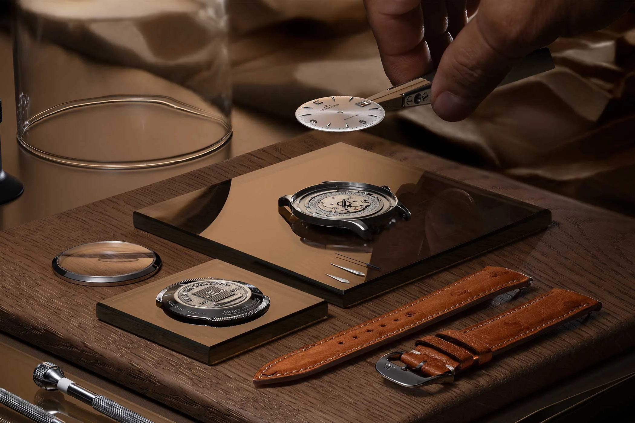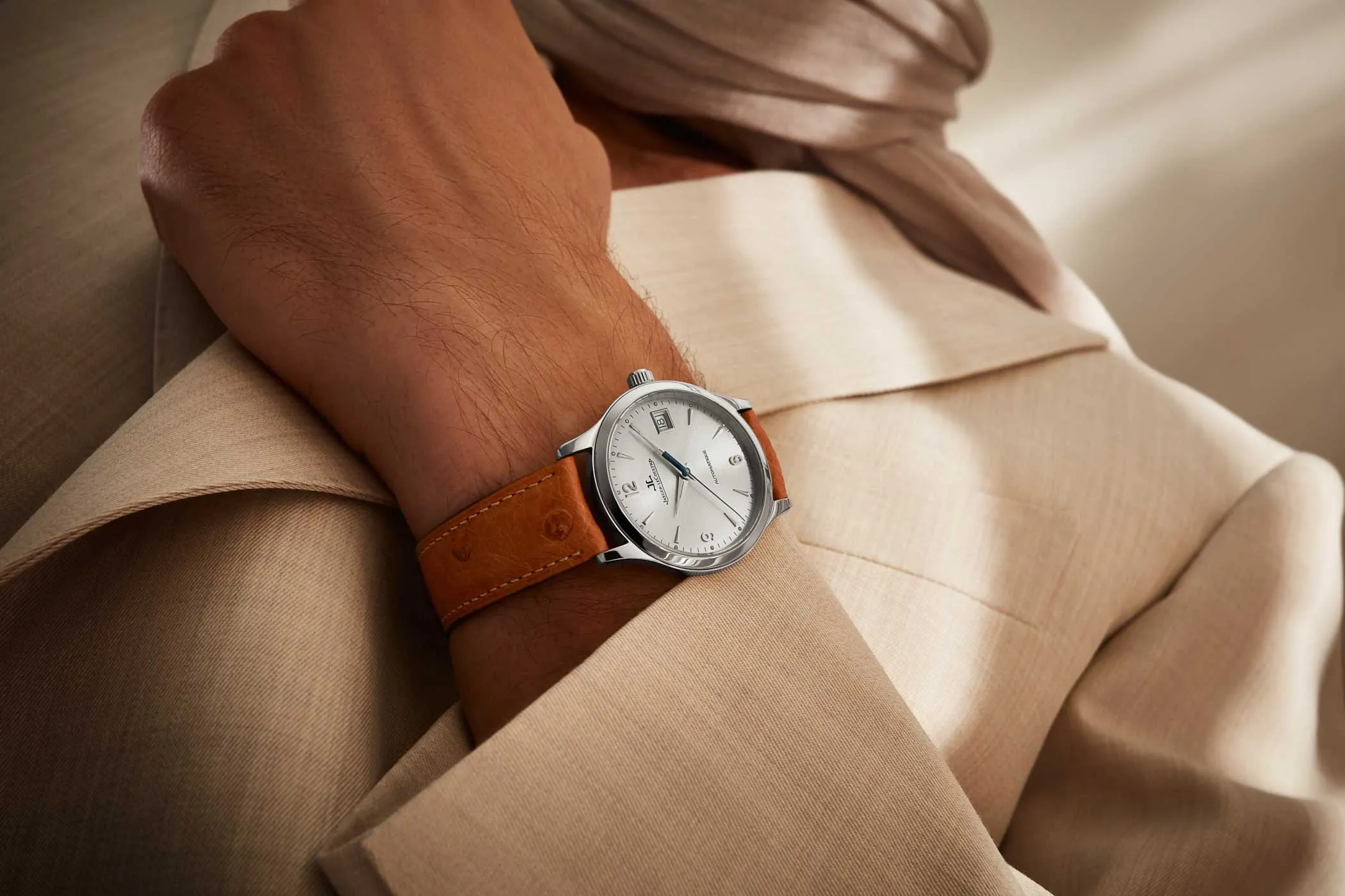 Dessen Präzision kann auf dem minimalistisch gestalteten, silberfarbenen Sonnenschliff-Zifferblatt mit applizierten Indizes und Ziffern sowie klassischen Dauphinezeigern abgelesen werden. Lediglich mit der Anzeige des Datums verletzt die Master Control Classic die Vorgaben eines klassischen Dress-Watch-Zifferblatts. Beim handgenähten Armband aus braunem Straußenleder ist die Uhr wieder ganz auf Linie.
