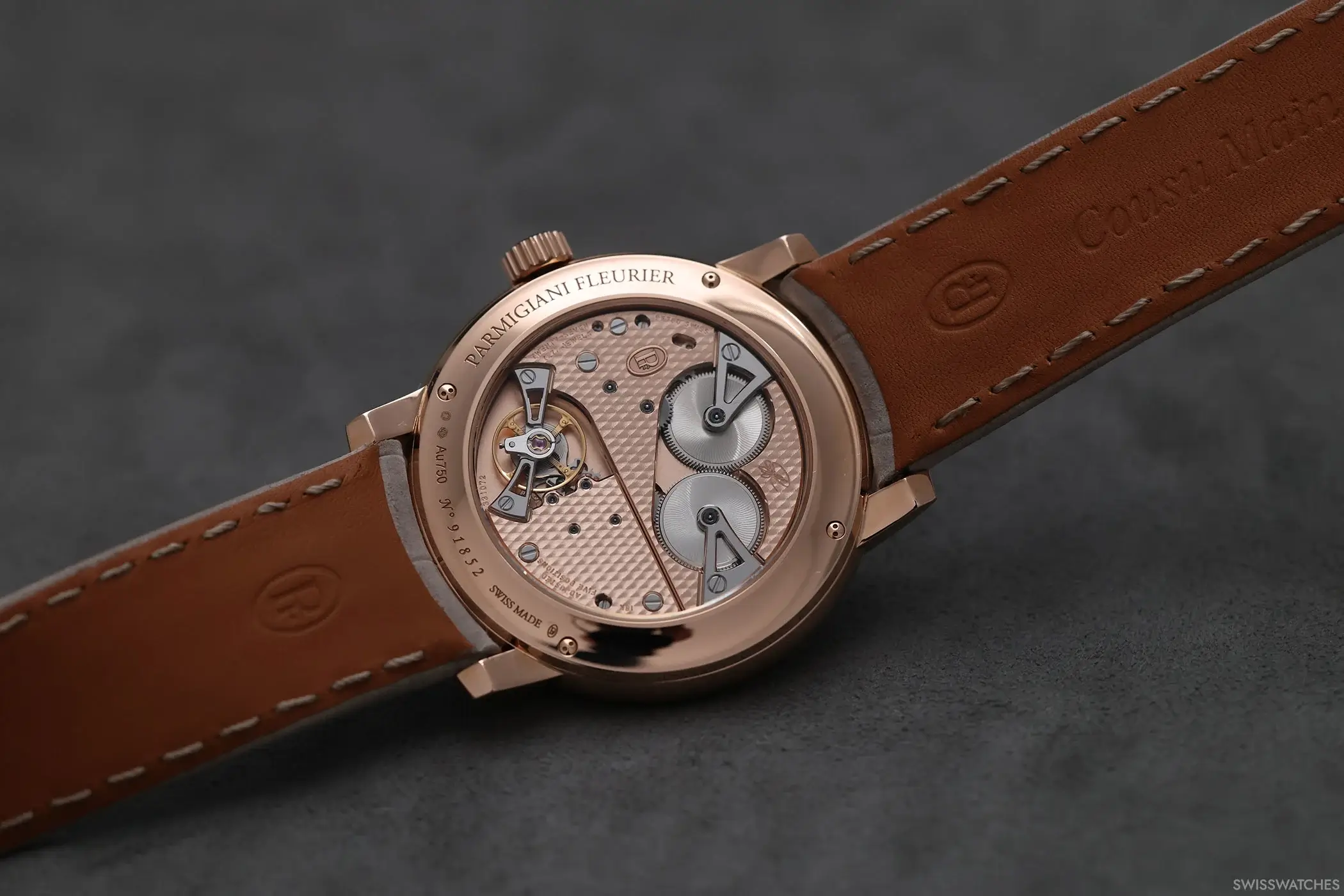 Durch den Saphirglasboden kann das Handaufzugs-Kaliber VS00 betrachtet werden. Es bietet großzügige 90 Stunden Gangreserve und besteht aus 144 Komponenten.