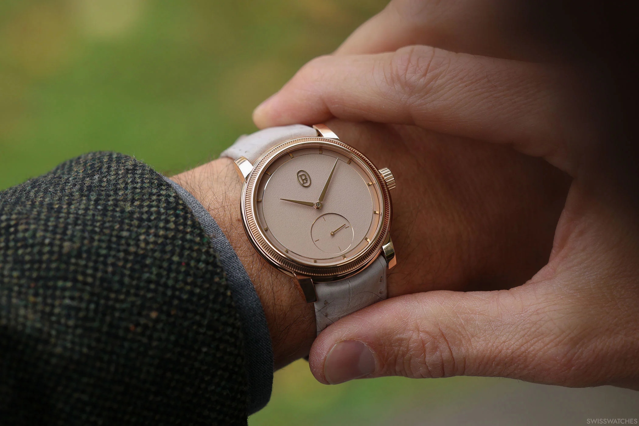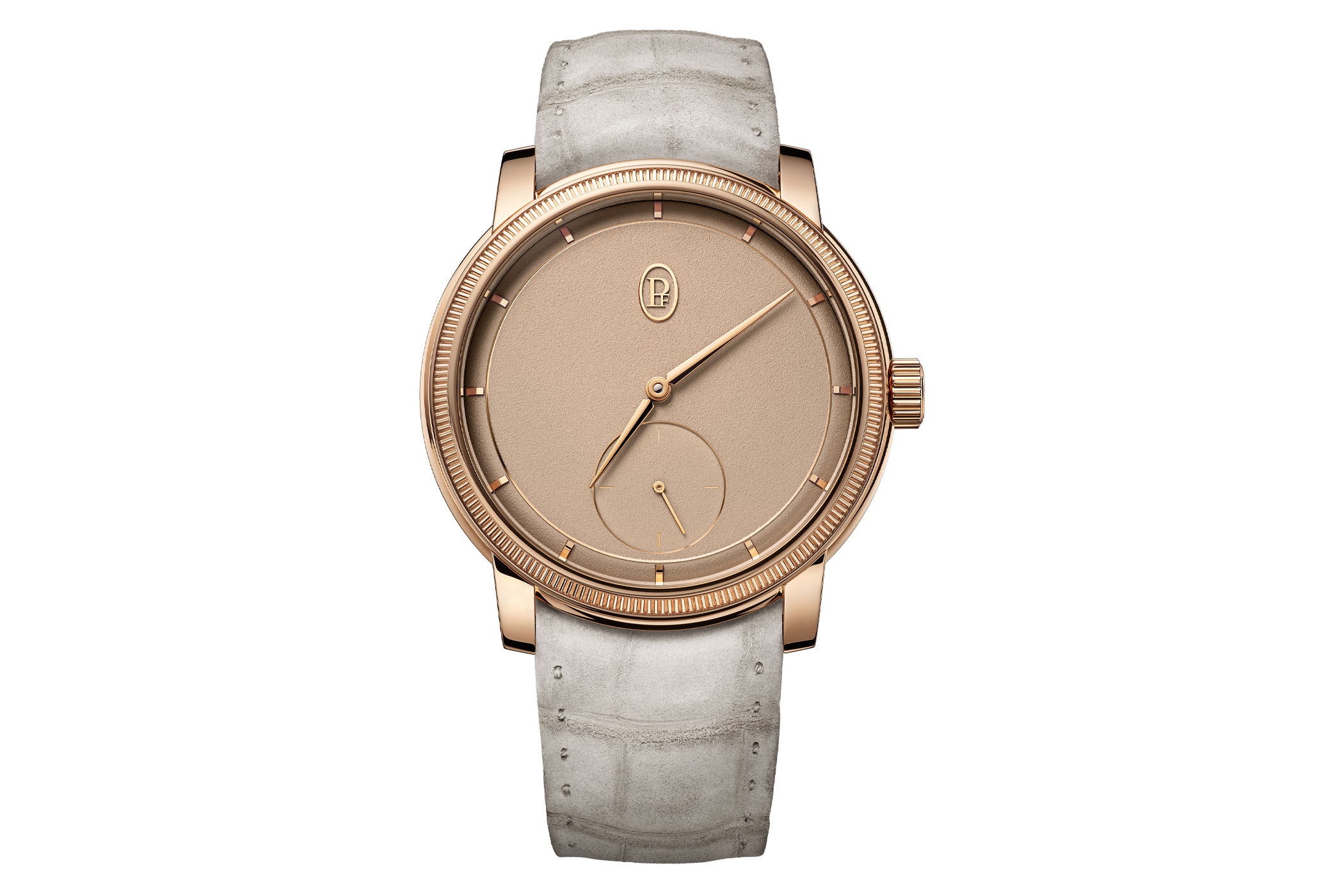 Das handgekörnte goldene Zifferblatt in der zurückhaltenden Farbgebung Dune ist mit den kurzen applizierten Indizes und den schlichten Zeigern aus Roségold sowie der minimalistischen kleinen Sekunde auf das absolut Wesentliche reduziert. Damit erfüllt sie ihre Bestimmung, als Anzuguhr das Outfit des Trägers unaufdringlich zu unterstreichen, und steht ganz in der Tradition der männlichen Eleganz vergangener Zeiten.