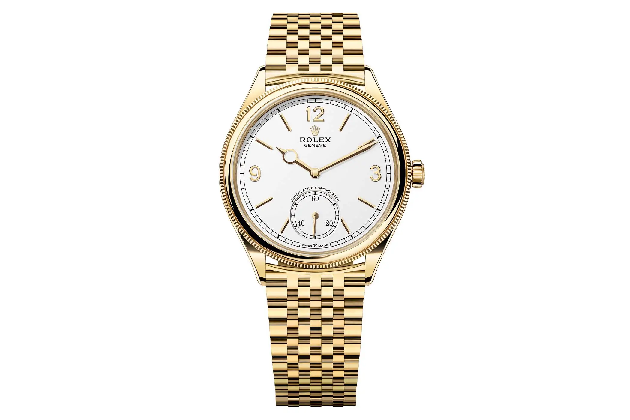 Mit dem Metallband, welches Rolex Settimo – der Siebte – nennt, betritt Rolex das Feld der modernen Dress Watches. Das gilt auch für die Lünette, welche sich in einen fein geriffelten unteren Teil und einen bombierten oberen Teil gliedert. Bei Durchmesser und Höhe des bis fünf bar wasserdichten Gehäuses – 39 x 9,5 Millimeter – bewegt sich die 1908 wieder auf gesichert, klassischem Terrain und interpretiert vorbildlich den Eleganz-Auftrag dieser jungen Rolex-Linie.