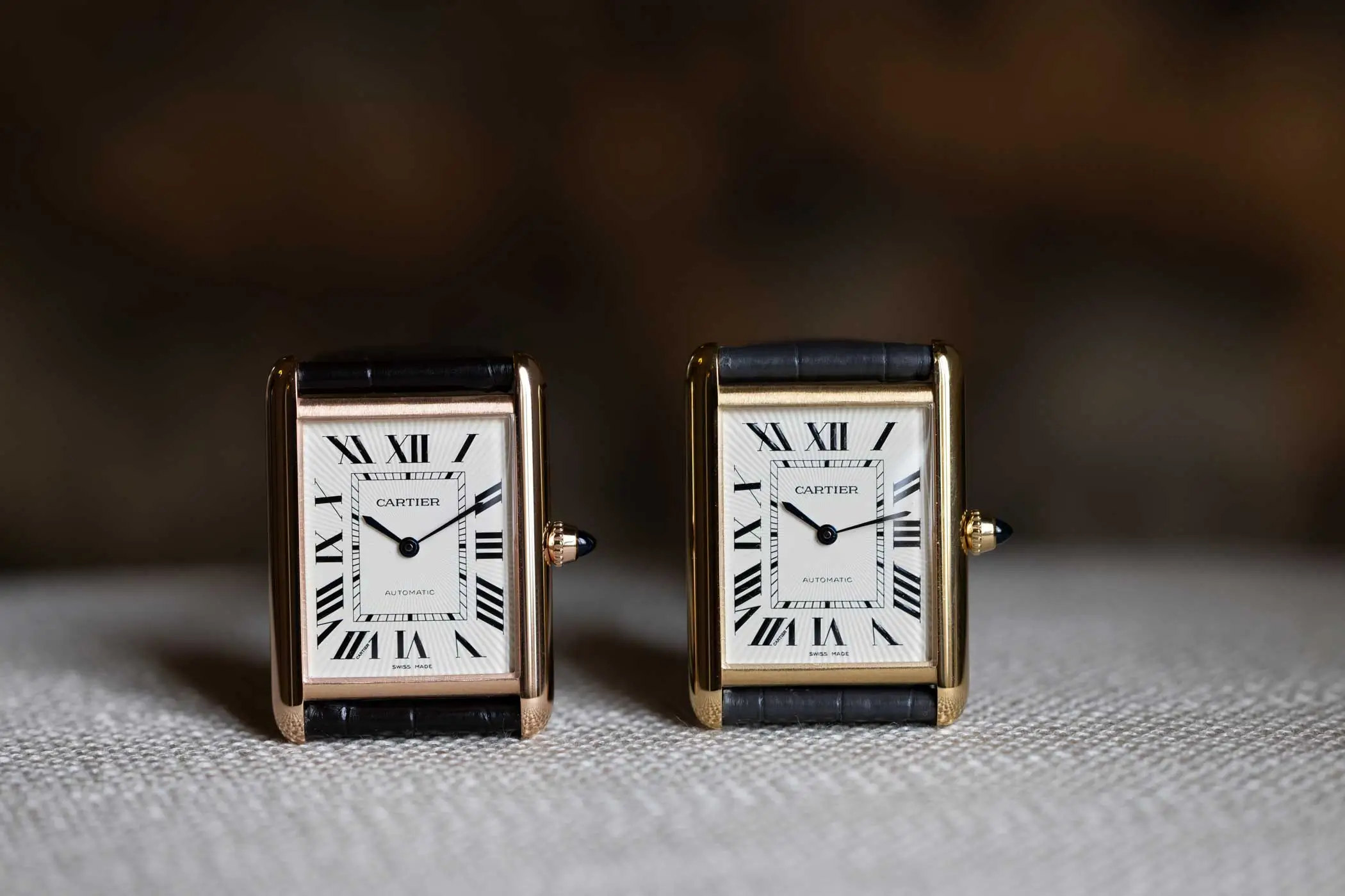 Wie bei Cartier üblich, besitzen auch die größeren Varianten eine kannelierte Aufzugskrone mit Cabochon. Die abgerundeten Brancards (französisch für Trage, Bahre oder Rahmen) sind poliert, während das Gehäuse und die Lünette eine matte Satinierung aufweisen. Beide Varianten zeigen die klassischen Tank-Merkmale: ein Flinqué-Zifferblatt, Eisenbahnminuterie, römische Ziffern sowie gebläute, schwertförmige Zeiger.