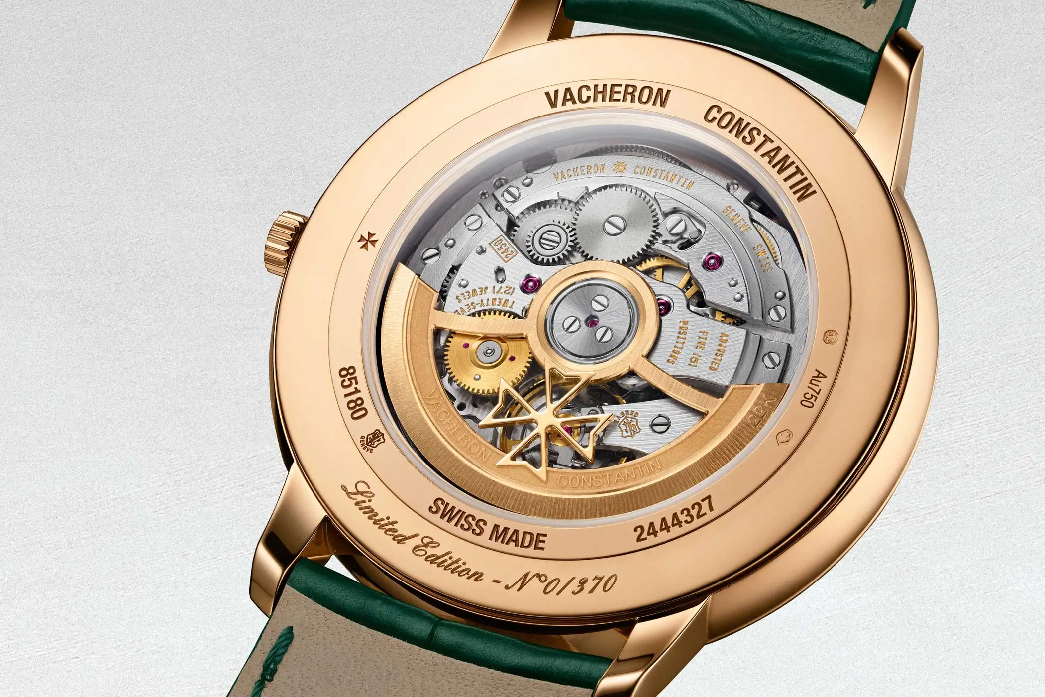 Für mechanische Präzision sorgt das automatische Manufakturkaliber 2450 Q6/270 mit 40 Stunden Gangreserve und den Funktionen Stunden, Minuten, zentrale Sekunde und Datum. Durch den Gehäuseboden aus Saphirglas lassen sich die Brücken mit dem „Côte unique“-Zierschliff, das Jubiläumsemblem und die durchbrochene Schwungmasse aus 22-karätigem Gold mit Malteserkreuz betrachten.
