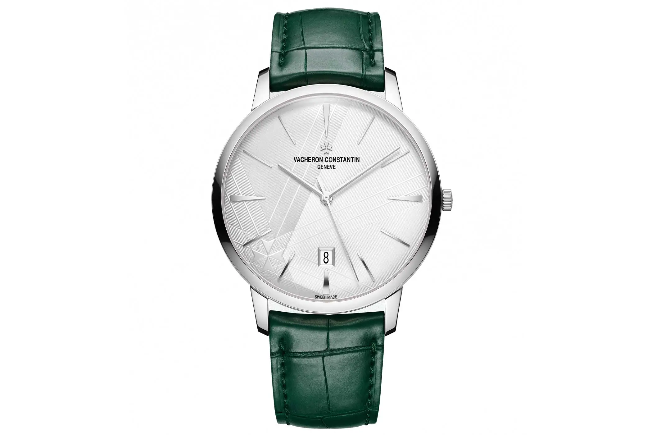 Es bietet den Rahmen für das leicht gewölbte, silberfarbene Jubiläums-Zifferblatt, welches sein schlichtes Design überaus geschickt mit einem dezenten Malteserkreuz-Motiv kombiniert – dem Emblem von Vacheron Constantin seit 1880. Das hebt in keiner Weise die gestalterische Reduktion auf. Diese wird unterstrichen durch applizierte Indizes sowie drei schlichte Zeiger aus Weißgold. Bei 6 Uhr ist das zurückhaltende Datumsfenster platziert.