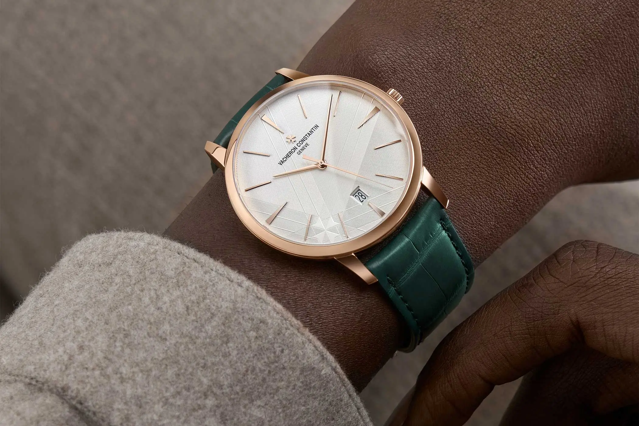 Getragen wird die Patrimony Automatik an einem eleganten, dunkelgrünen Alligatorlederband mit einer goldenen Dornschließe.