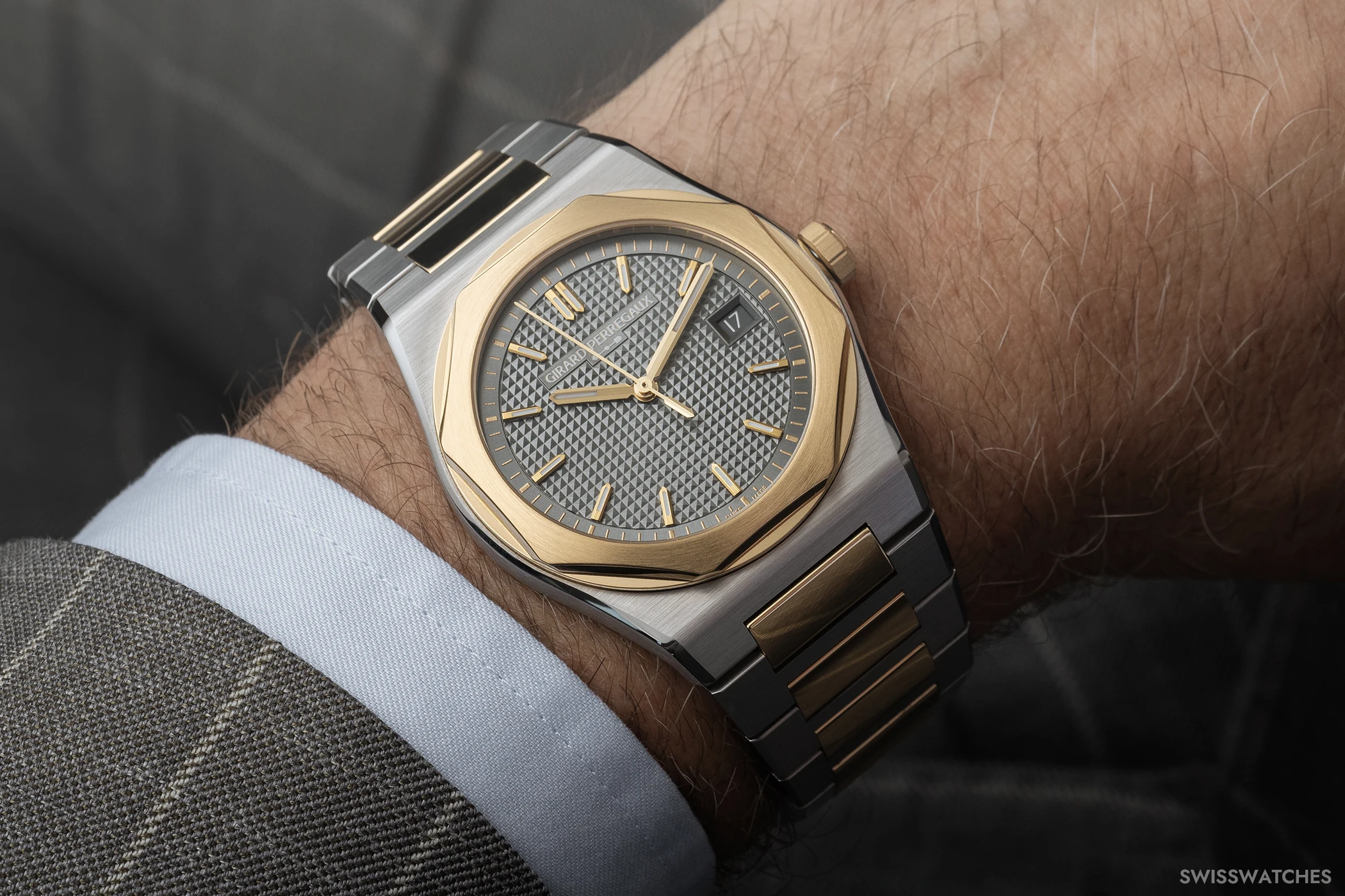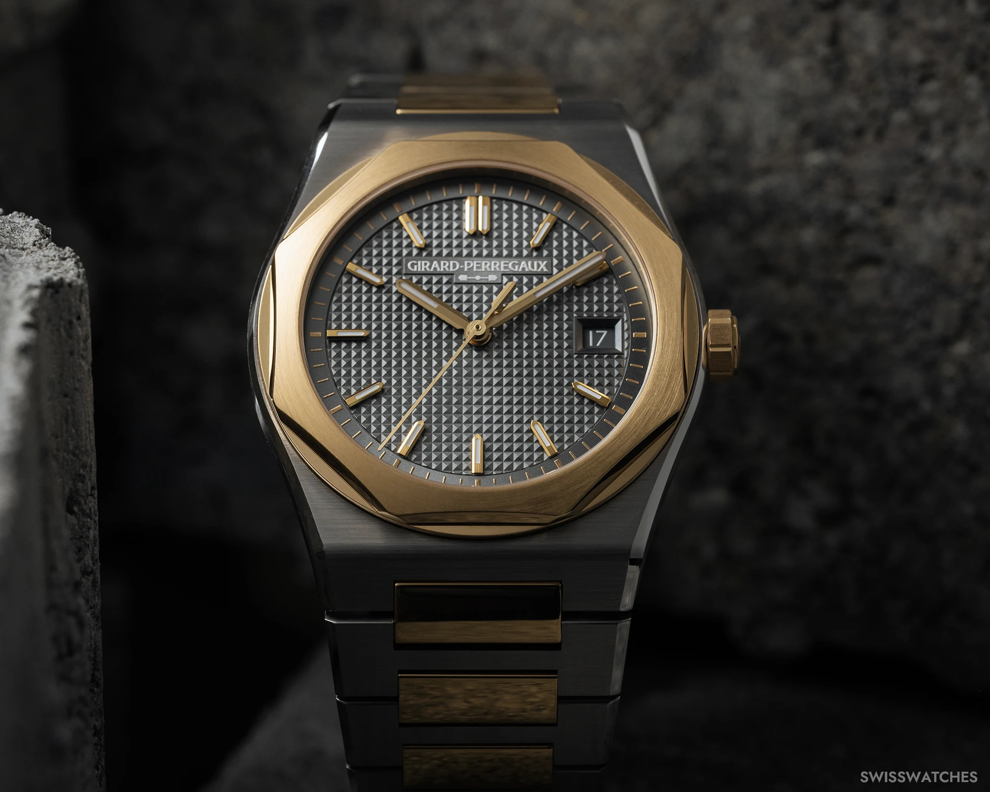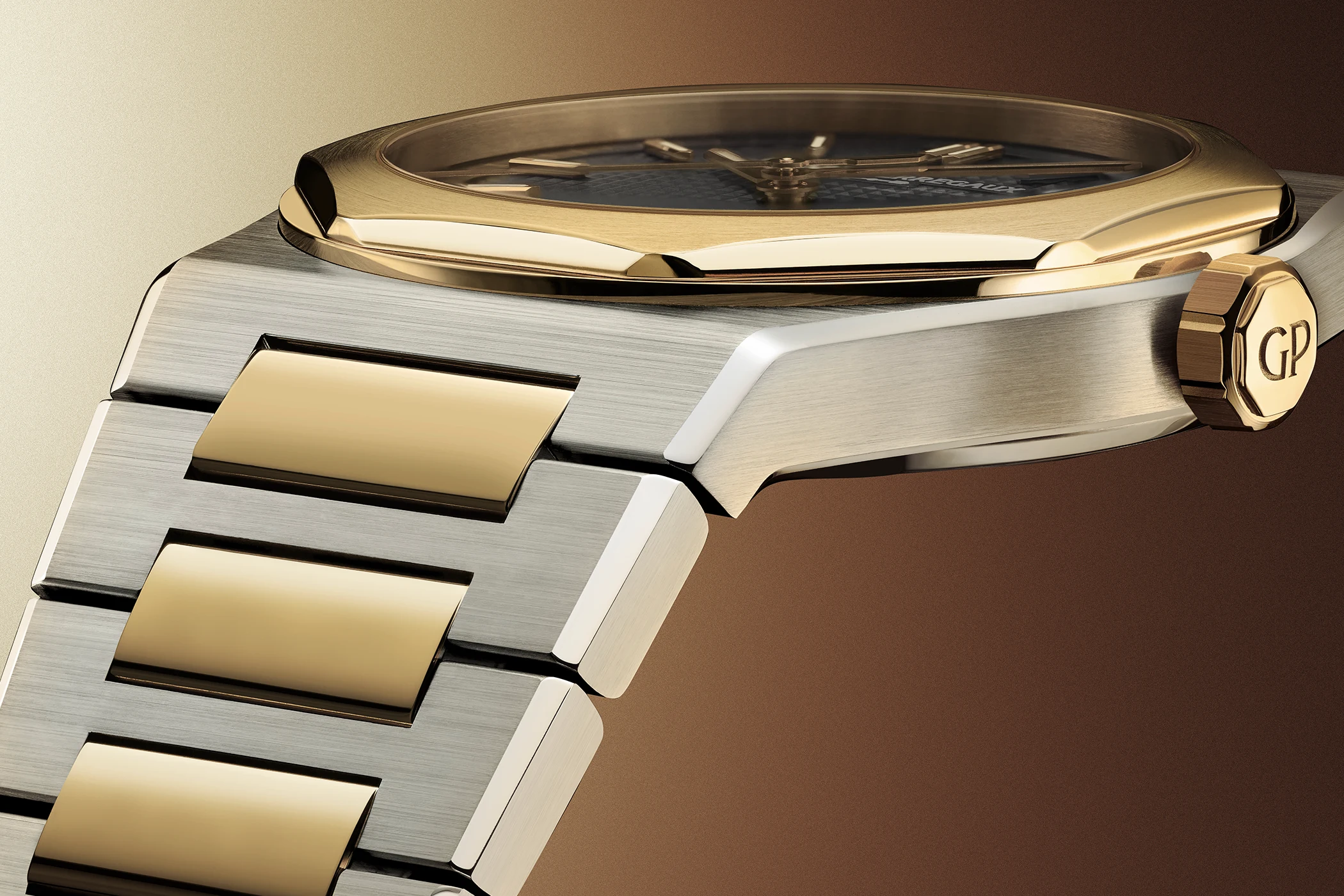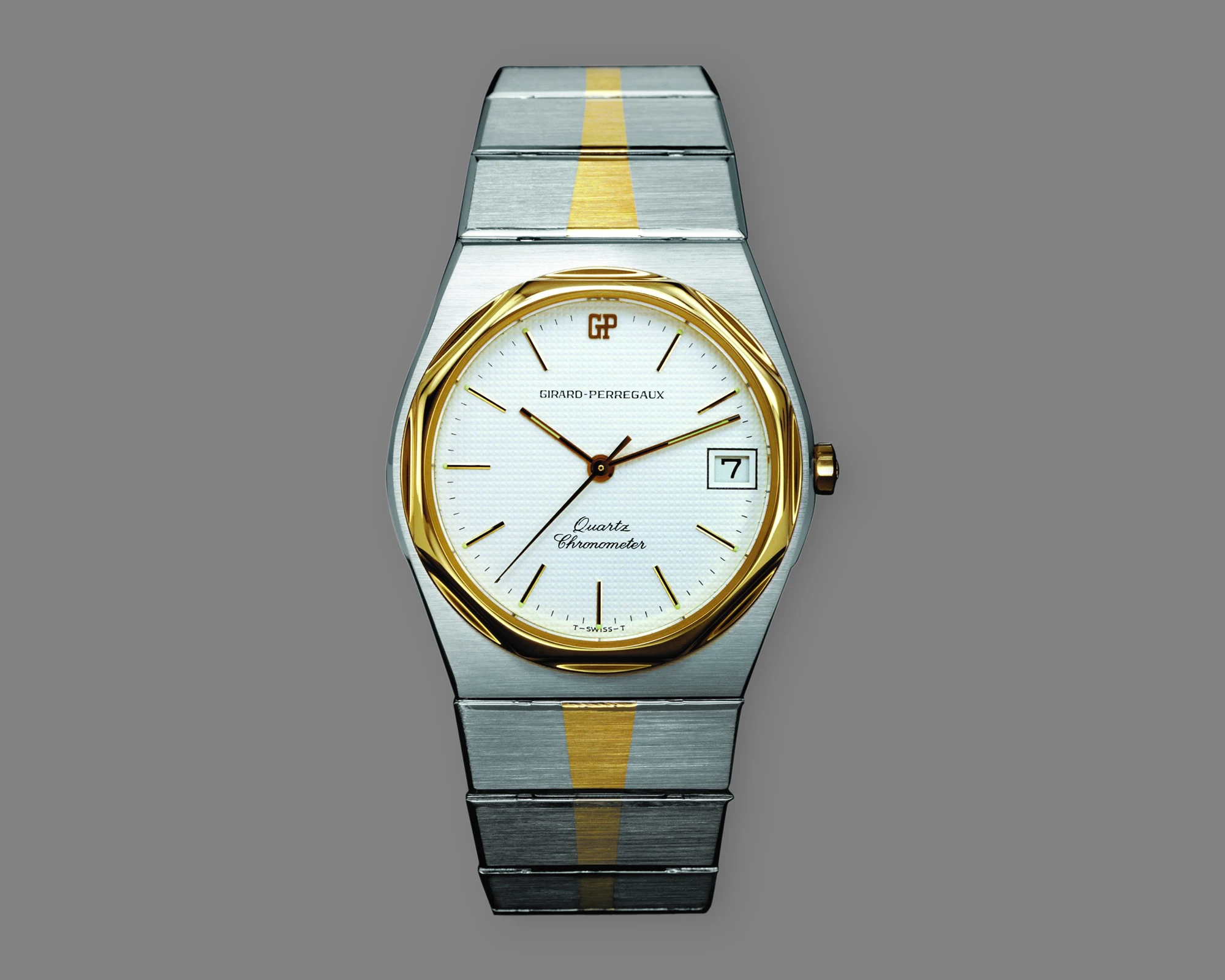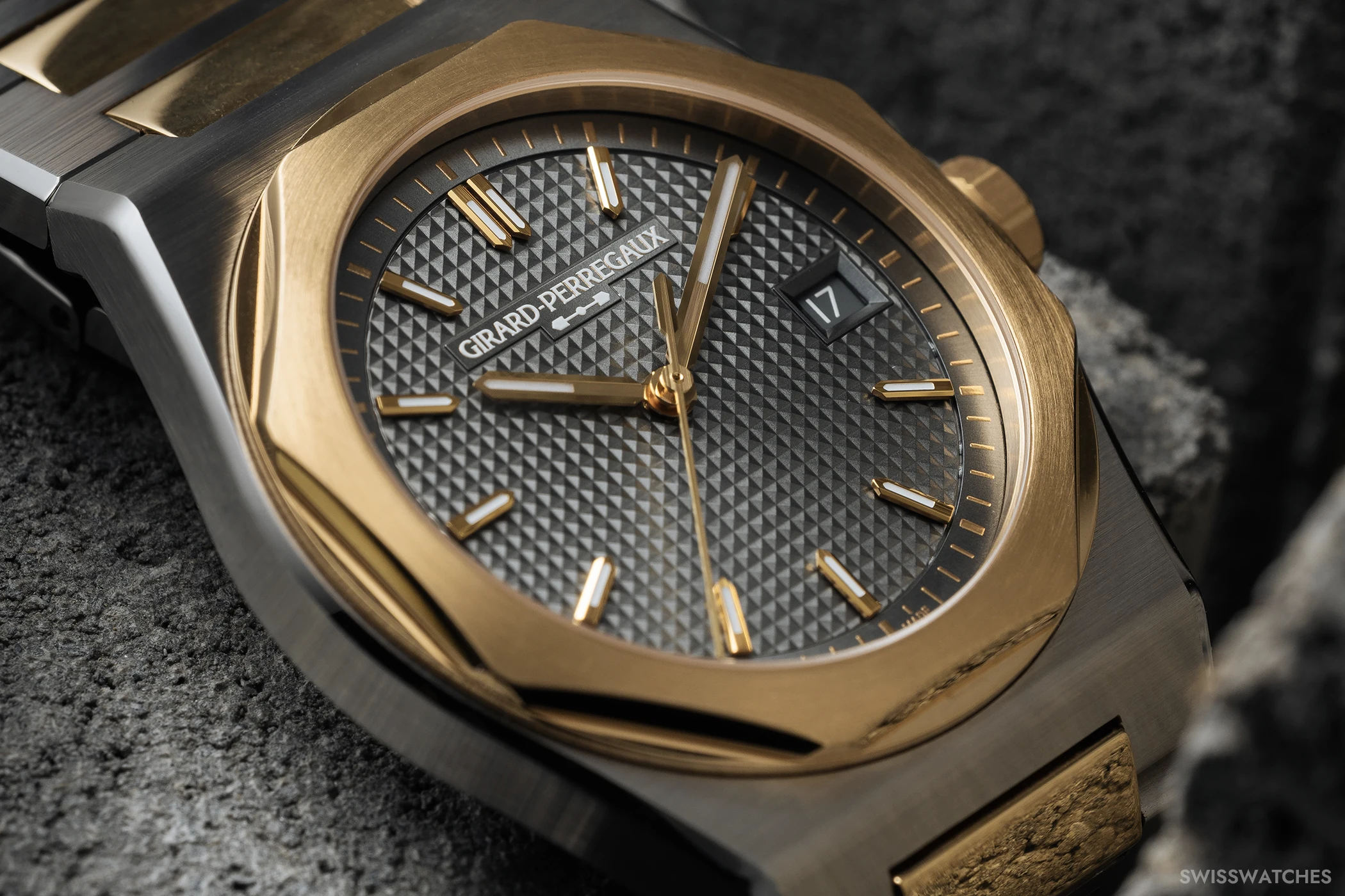 Vor dem Hintergrund dieser Entwicklungen stellte Girard-Perregaux im Jahr 1975 seine Antwort auf die Royal Oak vor: Die Laureato kennzeichnete sich durch ein flaches, tonneauförmiges Edelstahlgehäuse, in das ein Bi-Color-Metallarmband integriert war. Auf dem Zifferblatt sorgte ein Clous-de-Paris-Muster – ein Designelement, das auch heute noch ein fester Bestandteil der Linie ist – im Zusammenspiel mit schlichten Stabindizes und Zeigern für Akzente. Stilprägend war allerdings vor allem die achteckige Lünette, die durch ihre polierten Flächen für ein besonderes Erscheinungsbild sorgte.