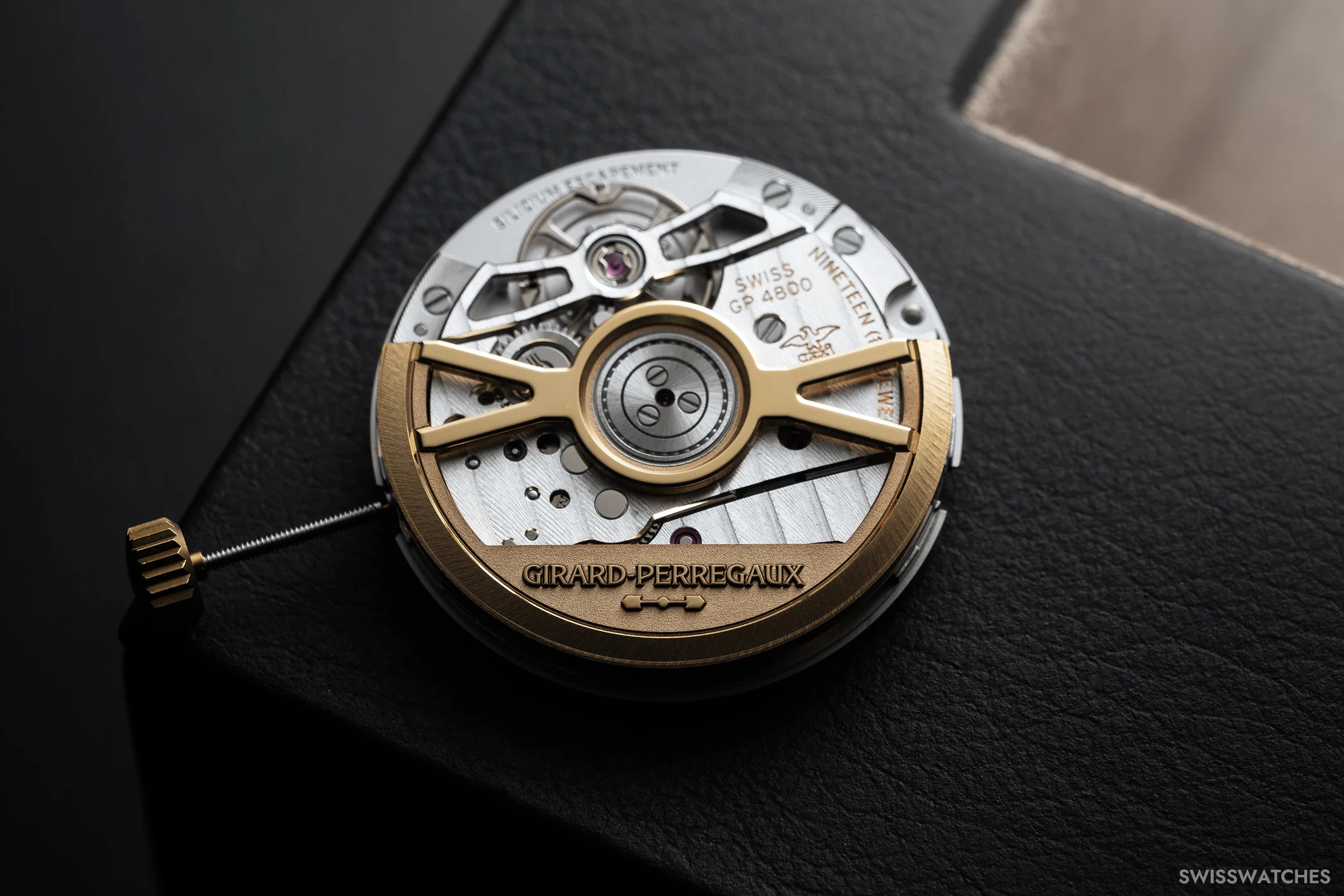 Um dies zu ermöglichen, führte die Marke einige wesentliche Verbesserungen durch: Zum einen setzt Girard-Perregaux bei Anker und Ankerrad nunmehr auf Silizium – ein Material, das sich durch seine amagnetischen Eigenschaften, geringes Gewicht und glatte, reibungsarme Oberflächen ideal für die Hemmung eignet. Es minimiert Kraftverluste, erhöht die Ganggenauigkeit und reduziert den Wartungsbedarf, was die Langlebigkeit des Werks deutlich verbessert. Zum anderen verfügt das Kaliber GP4800 nunmehr über eine rückerfreie Feinregulierung mit vier versenkten Weißgoldschrauben, die eine präzise Einstellung am Unruhreif ermöglichen und wodurch die Marke funktional zu Werken von Rolex, Patek Philippe und Audemars Piguet aufschließt. Im Gegensatz zur klassischen Rückerregulierung bleibt die Spiralfeder dabei unverändert in ihrer Länge, was den Schwerpunkt stabil hält und die Ganggenauigkeit erhöht.