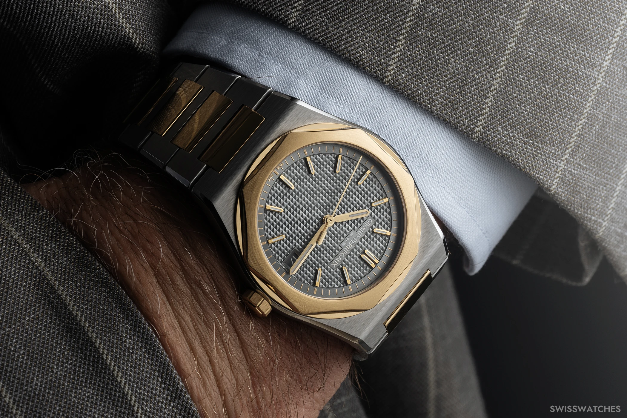 Ein zentrales Merkmal der sportlichen Stahluhren der 1970er Jahre, das auch der Girard-Perregaux Laureato Fifty innewohnt, ist das integrierte Armband. Das neue Modell folgt dieser Designschule: Das Gehäuseprofil geht nahtlos in die äußeren Glieder des Armbands über, die sich zum Handgelenk hin deutlich verjüngen. Die H-förmigen Glieder aus Edelstahl wurden im Vergleich zu früheren Modellen verkürzt. Zudem fällt nun eine vergrößerte, facettierte Übergangsfase entlang der Gehäuseflanke auf, die sich entlang der Seiten jedes Armbandglieds fortsetzt. Die Hauptglieder bestehen aus satiniertem Edelstahl, während die hochglanzpolierten Zwischenglieder aus Gelbgold gefertigt sind.
