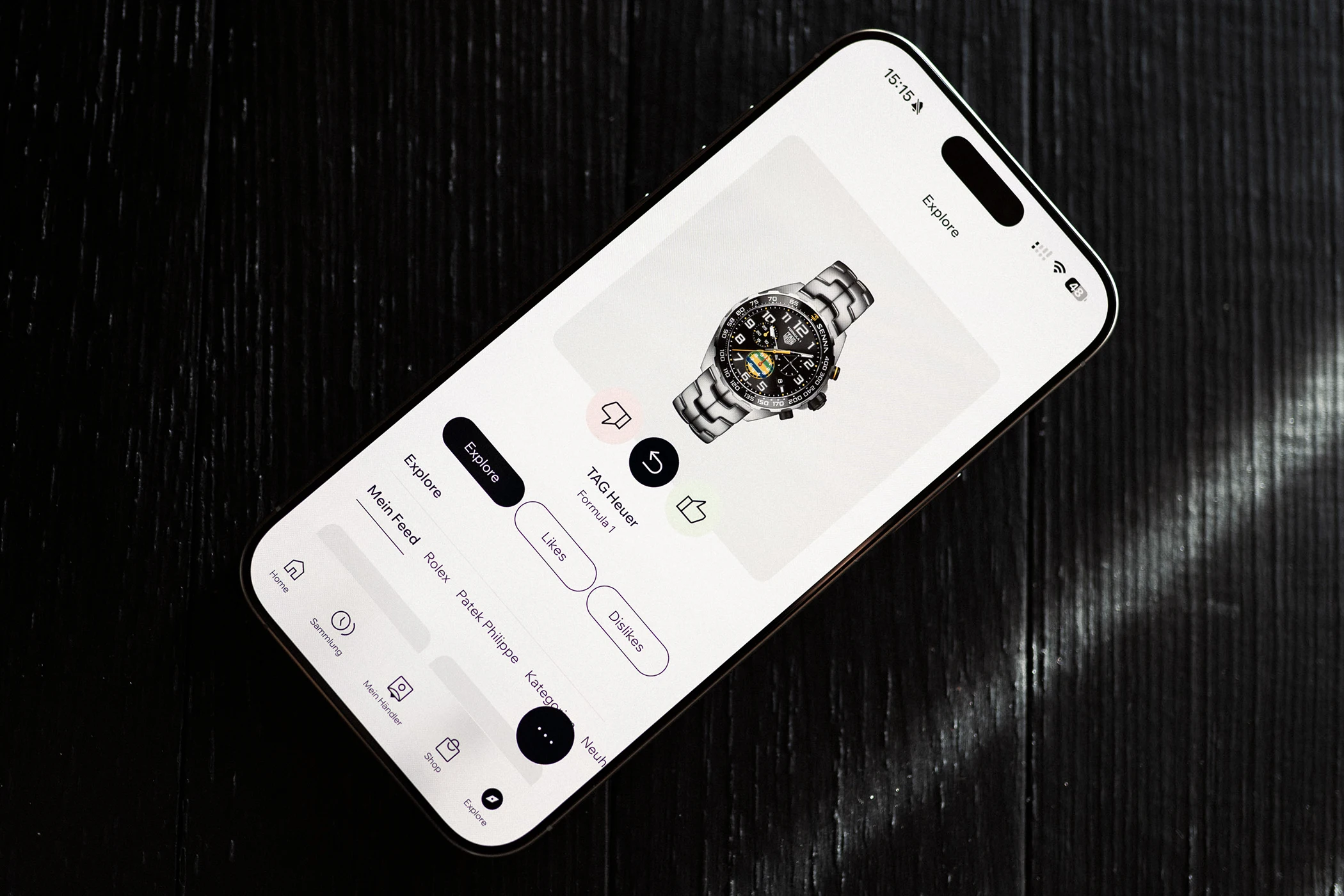Hinter dem fünften und damit letzten Bereich mit dem Namen Explore verbirgt sich eine Art Minispiel, das dem Nutzer durch Wischen ermöglicht, Modelle zu bewerten. Dies erfolgt über das Wischen einer Uhr nach links, was ein „Dislike“ und damit das Missfallen einer Uhr zum Ausdruck bringt, oder nach rechts, wodurch man mit einem „Like“ markiert, dass eine Uhr den eigenen Vorstellungen entspricht. Diese Likes und Dislikes bilden schließlich den individualisierten Feed, der sich aus den im Minigame gezeigten Präferenzen des Nutzers zusammensetzt. Gekoppelt an diese Wischfunktion ist der Shop: Wird eine Uhr gelikt und ist ein entsprechendes Inserat im Händler-Shop vorhanden, verweist die App automatisch darauf – mit der Möglichkeit, das Angebot direkt im Shop aufzurufen. Zudem hat man in Explore die Möglichkeit, Zeitmesser nach verschiedenen Kategorien zu durchsuchen – etwa nach Überbegriffen wie „Meistgesammelt“, „Am beliebtesten“ oder „Für die Ewigkeit“ sowie nach Neuheiten, beliebten Marken oder kürzlich eingestellten Modellen.