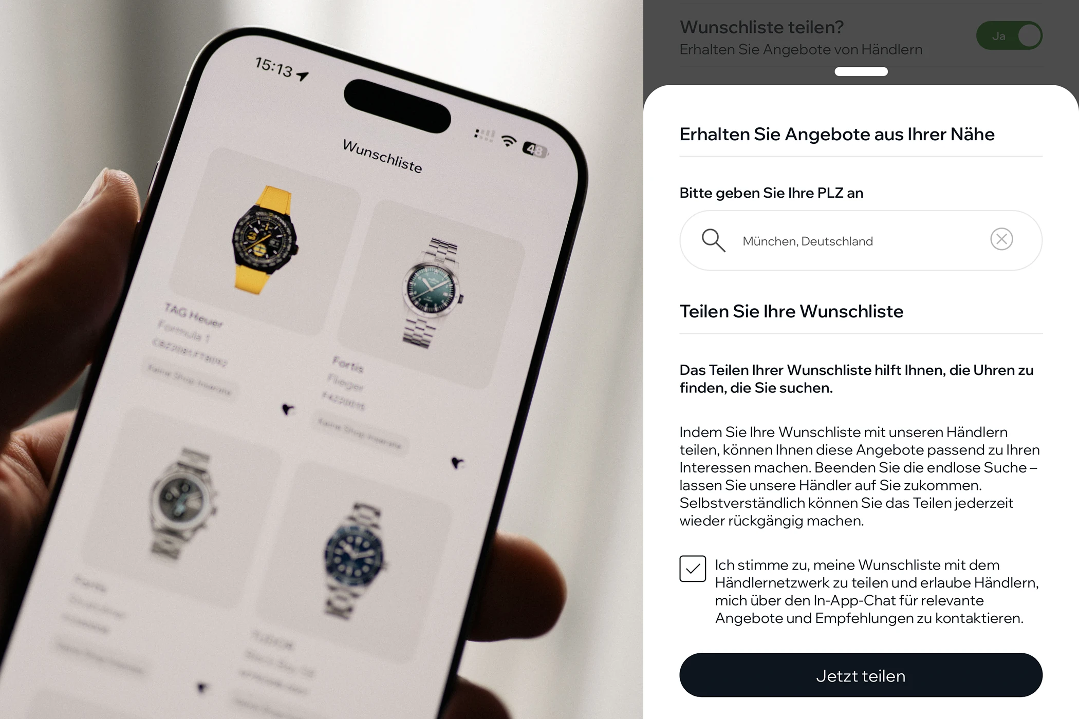 Einerseits werden durch die Verknüpfung dem Händler Informationen über die eigene Wunschliste sowie Likes und Dislikes aus dem Bereich „Explore“ – dazu gleich mehr – mitgeteilt. Diese Angaben sind notwendig, um sich mit dem Händler zu verbinden. Andererseits besteht die optionale Möglichkeit, Informationen über die zuvor in der App angelegte Uhrensammlung mit dem Händler zu teilen und ihm damit Einsicht in diese zu gewähren.