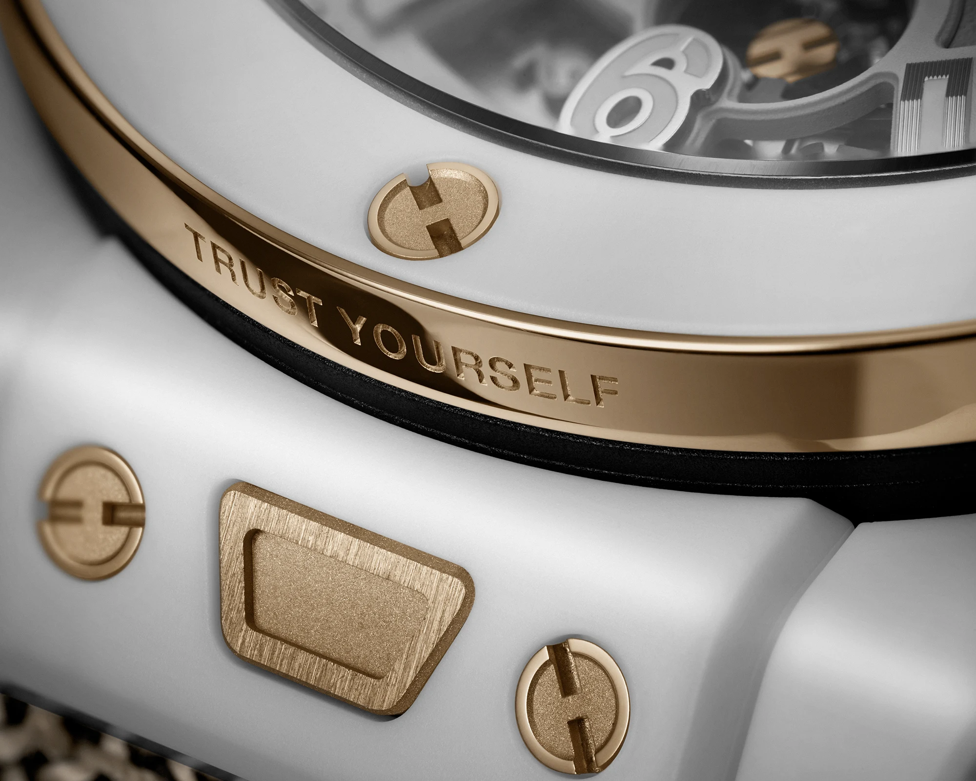 Die Big Bang Reloaded Kylian Mbappé verfolgt einen ganz anderen Ansatz. Auch sie hat einen Durchmesser von 44 Millimetern, doch die Materialauswahl – polierte weiße Keramik und 18-karätiges King Gold – vermittelt einen völlig anderen Eindruck: Die Uhr wirkt heller, markanter und moderner. Während das Bolt-Modell eine Geschichte von Tradition und Rekorden erzählt, konzentriert sich das Mbappé-Modell auf den mentalen Aspekt. Dementsprechend trägt die Lünette bei 6 Uhr die Gravur „Trust Yourself“ – die Maxime, die Hublot als Kern seiner sportlichen und öffentlichen Identität präsentiert. Hinzu kommt die goldfarbene Zahl 10, die gleichzeitig auf seine Rückennummer, seine Identität und seine Glückszahl verweist. Das skelettierte Zifferblatt aus anthrazitfarbenem Ruthenium mit weißen Akzenten verleiht der Uhr einen klaren, technischen Look.