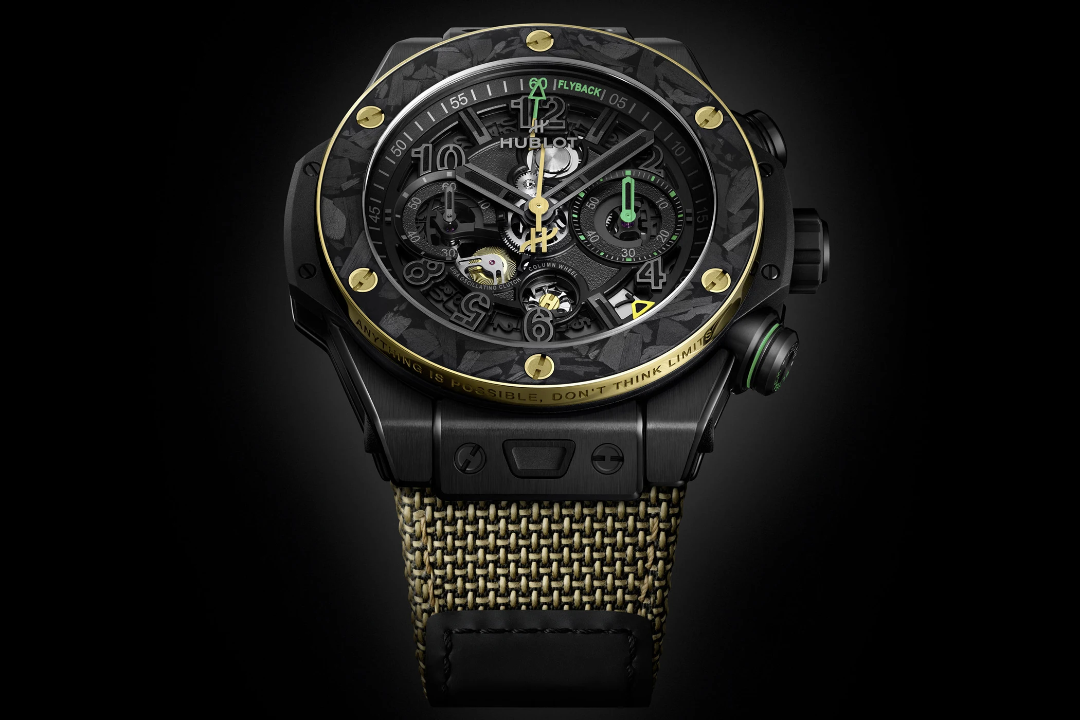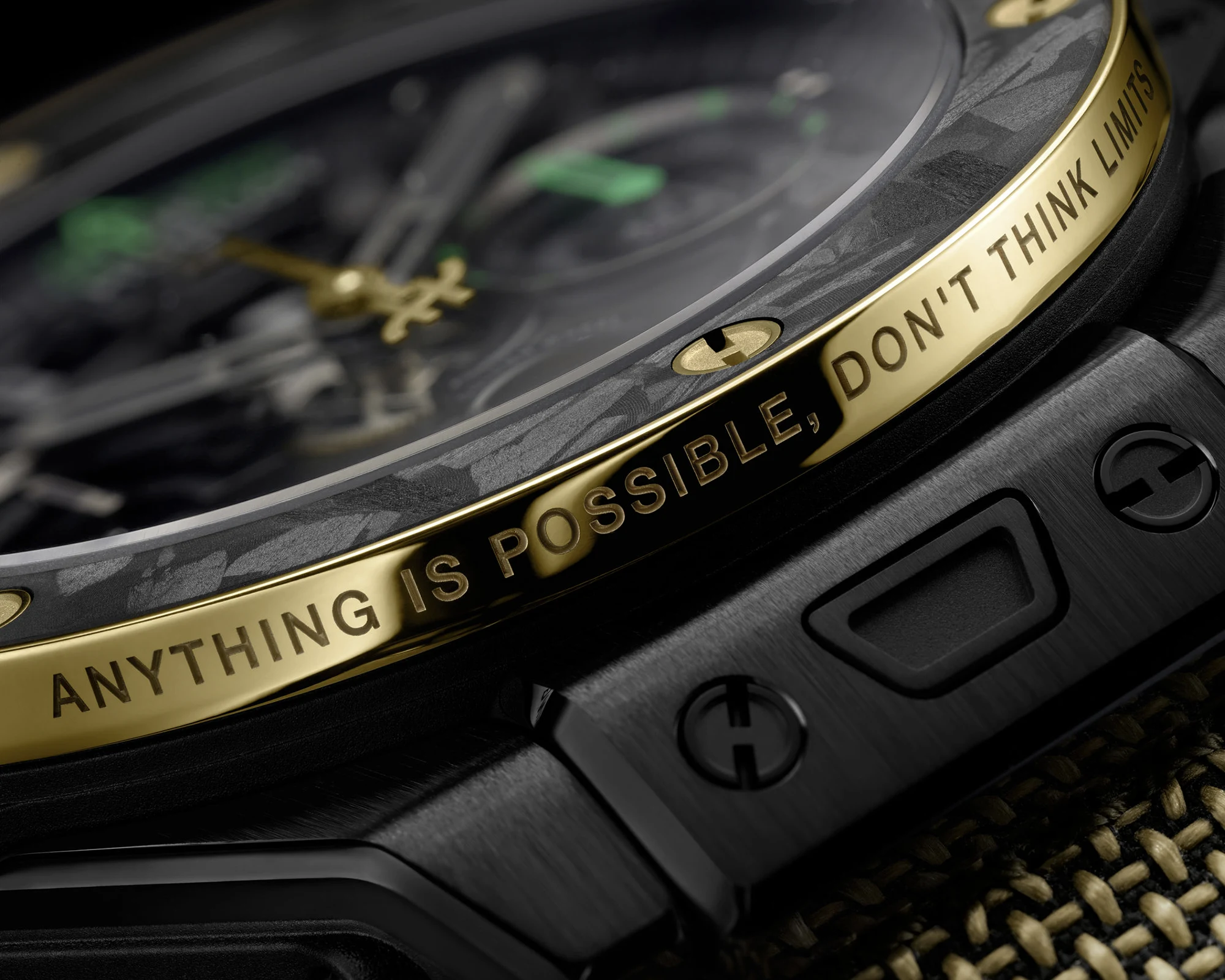 Die Big Bang Reloaded Usain Bolt ist ganz auf die Symbolik des schnellsten Mannes der Welt zugeschnitten: Das 44-Millimeter-Gehäuse aus schwarzer Keramik und Carbon wird durch Akzente aus Gelbgold hervorgehoben, während grüne und gelbe Details bewusst auf die Farben der jamaikanischen Flagge verweisen. Die Big Bang Reloaded wird besonders interessant, wenn Hublot die Personalisierung bis ins kleinste Detail treibt: Dreht man die Uhr gedanklich, bilden die Ziffern zwischen 6 und 8 Uhr eine „958“ – ein direkter Verweis auf Bolts Weltrekordzeit von 9,58 Sekunden über 100 Meter aus dem Jahr 2009. Passend zu diesem Thema ist der Chronographenzeiger wie ein Blitz geformt, und auf dem Gehäuseboden ist sogar originale Erde von seinem Trainingsplatz in Jamaika sichtbar integriert. Hinzu kommt die Gravur seines Mottos „Anything is Possible, Don’t Think Limits“ auf der Lünette.