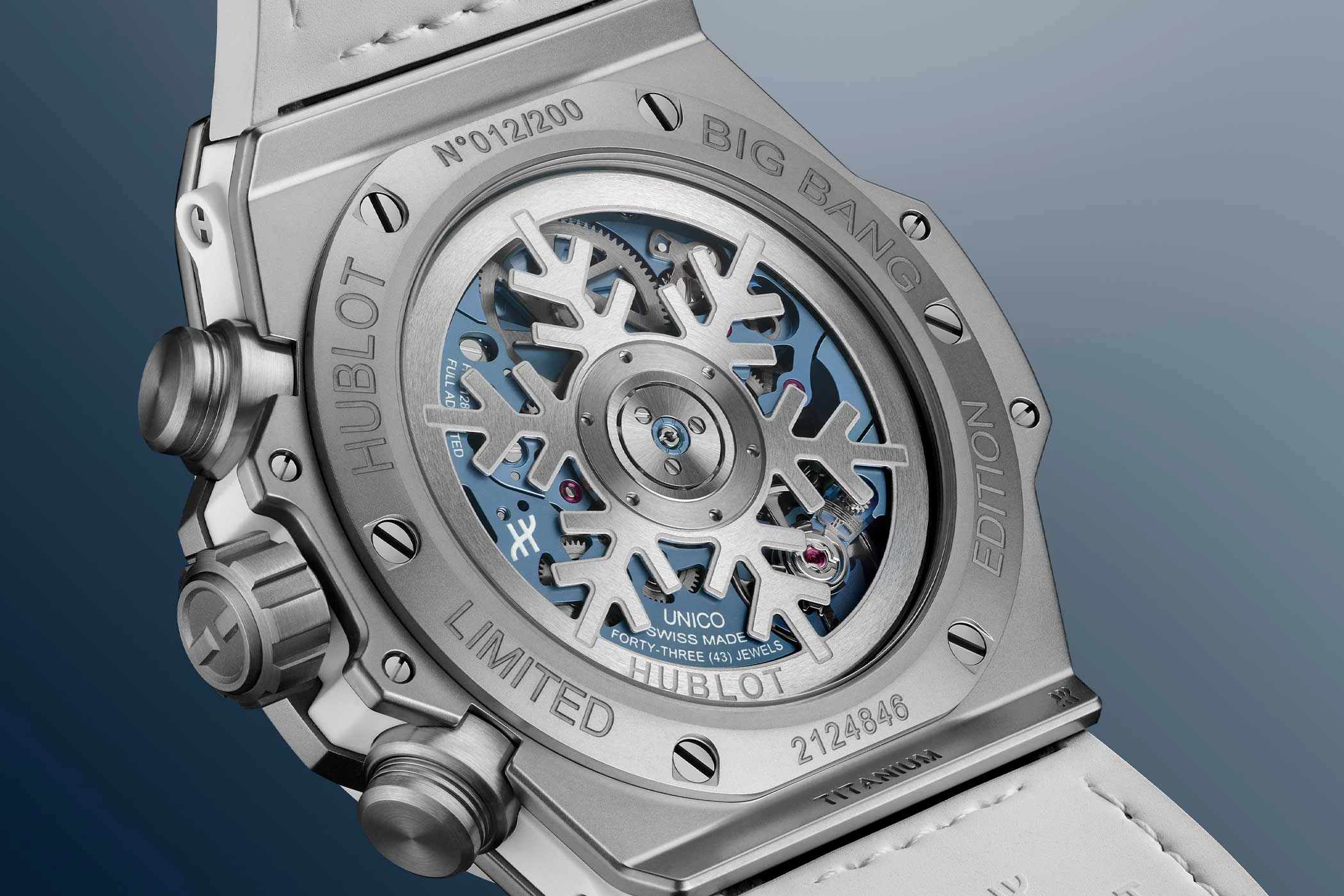 Im Inneren der neuen Winter-Editionen arbeitet das hauseigene Unico-Automatikkaliber HUB1280 mit Flyback-Chronograph, zifferblattseitigem Säulenrad, Siliziumhemmung, Wolfram-Rotor in Schneeflockenform und stattlicher 72 Stunden Gangreserve.