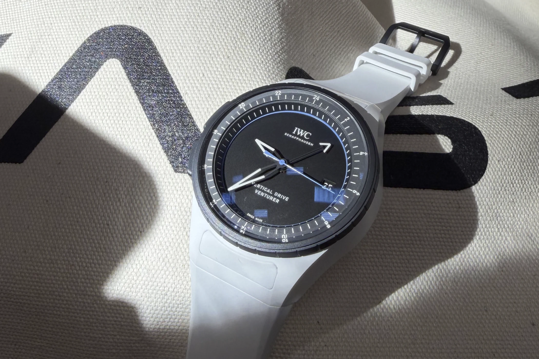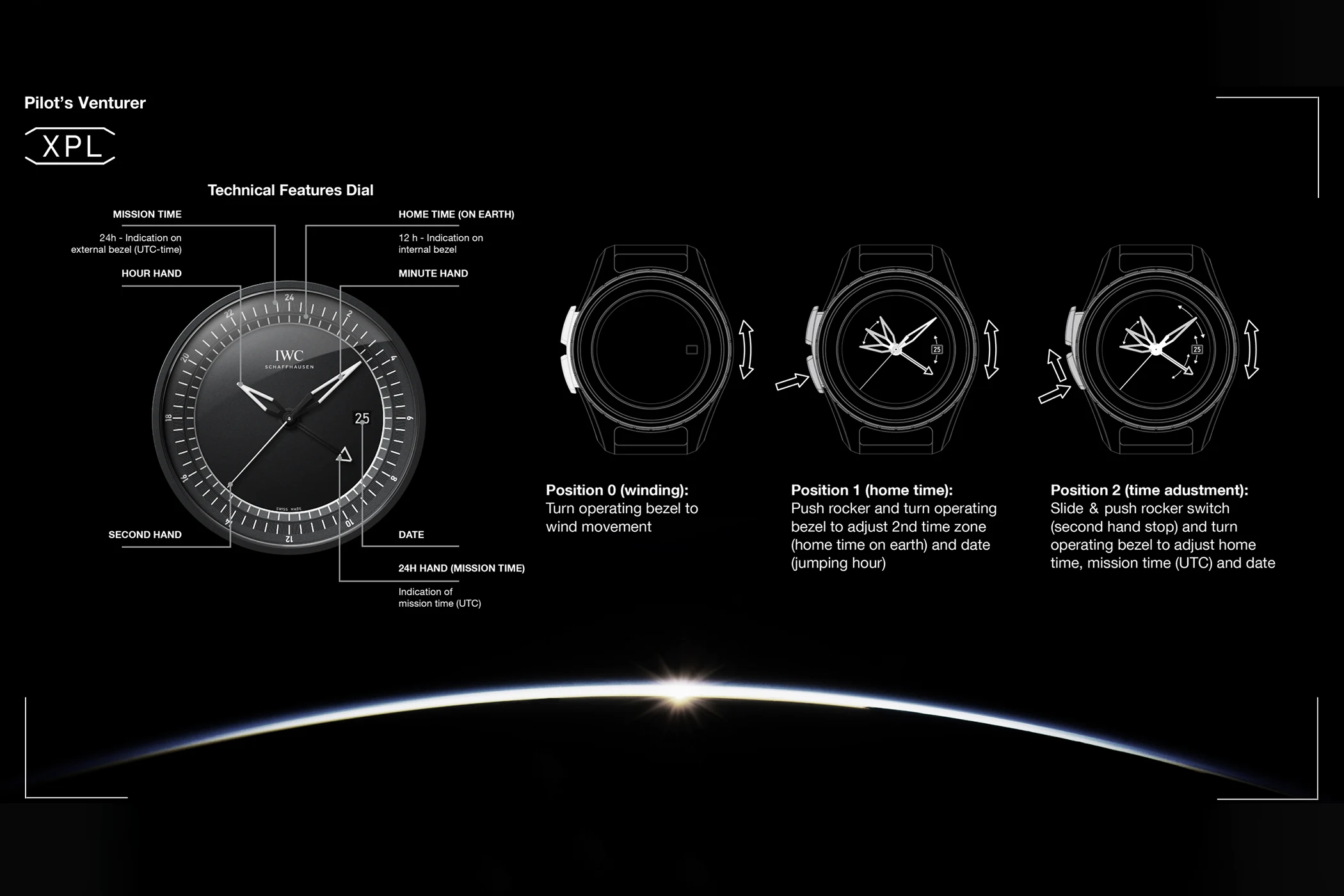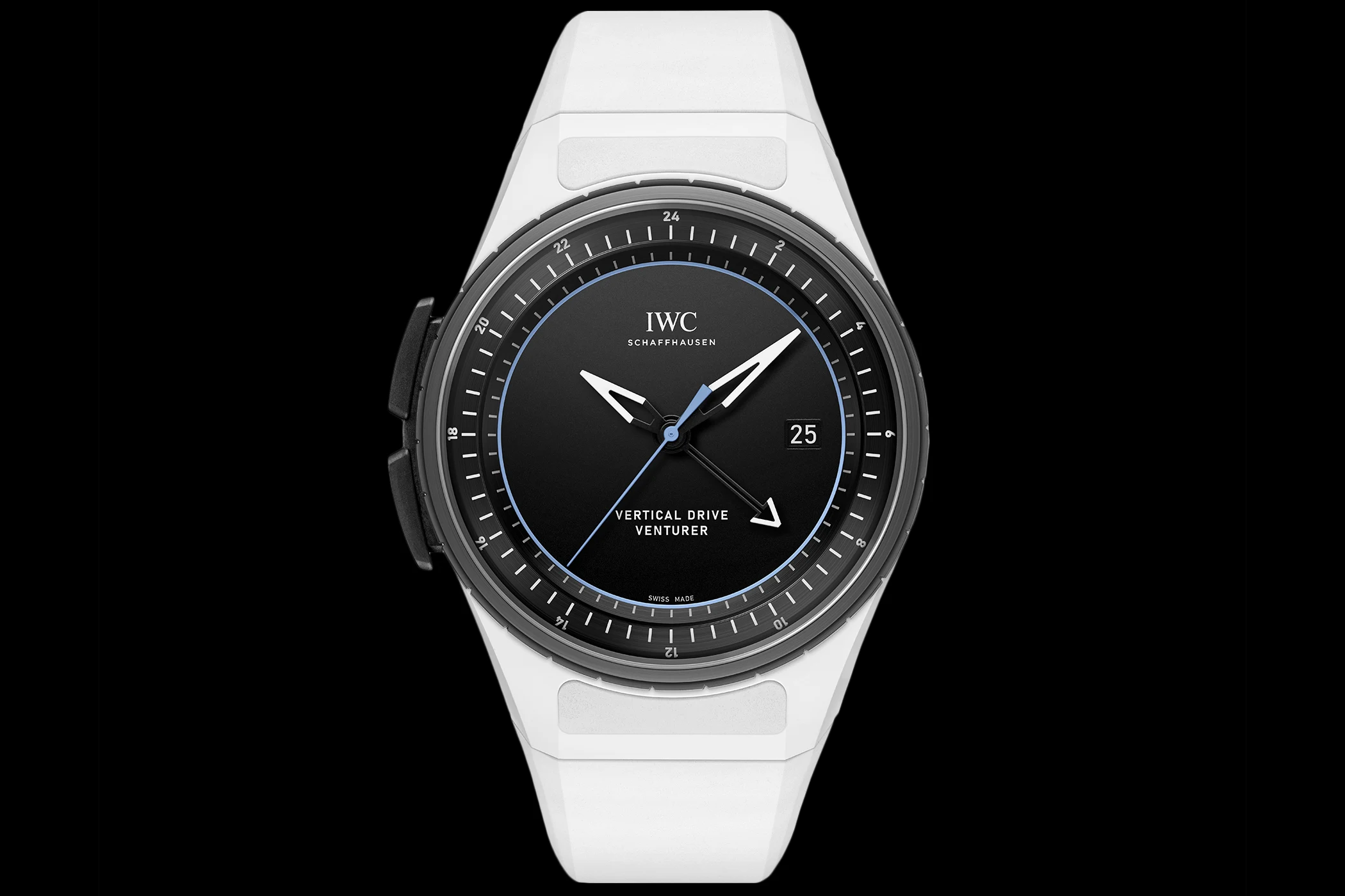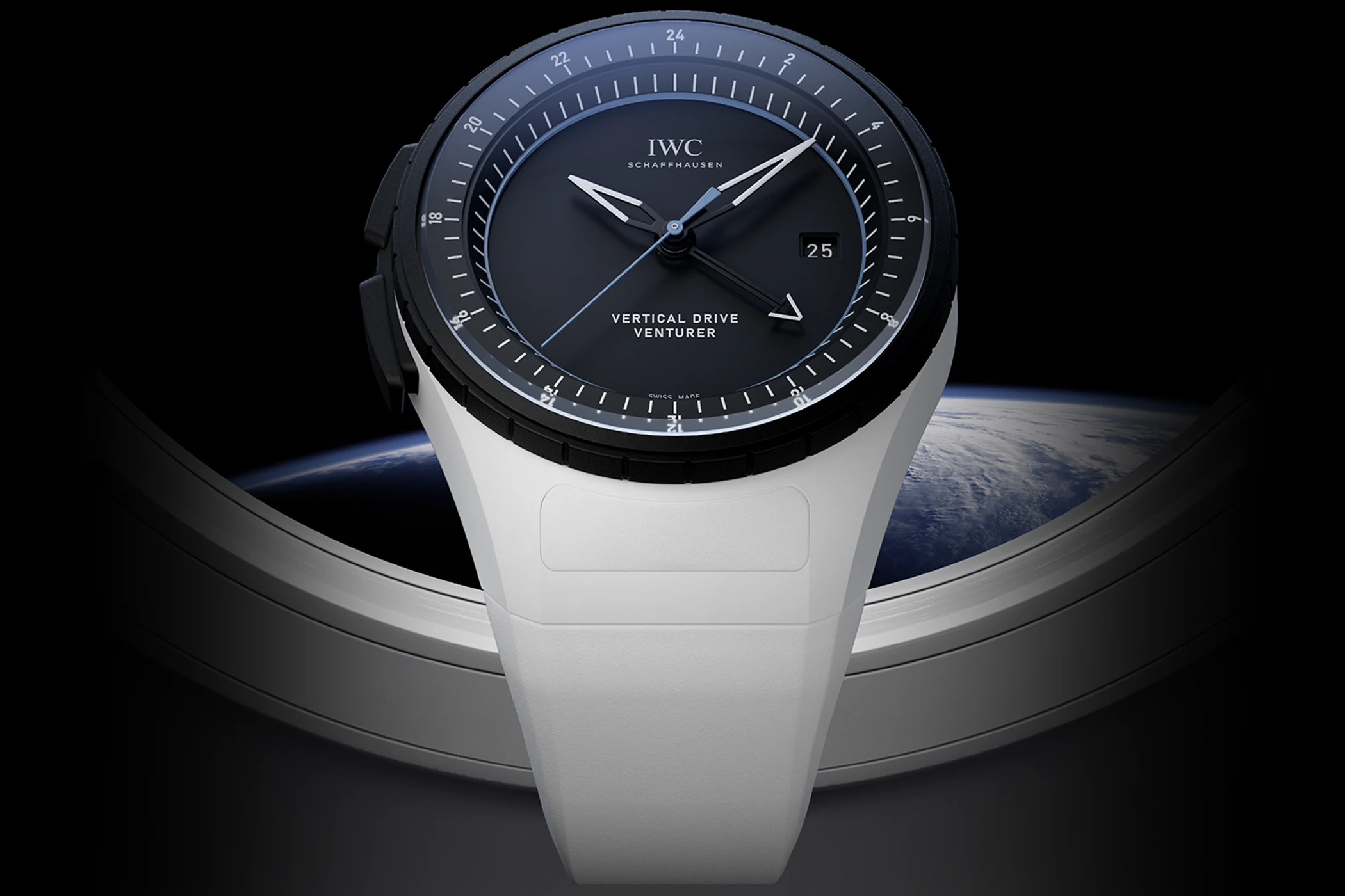 Erstes kommerzielles Ergebnis dieser Partnerschaft für IWC ist die Pilot’s Venturer Vertival Drive, kurz „Venturer“, was sich in „Abenteurer“ übersetzt. Sie ist zwar Teil der „Pilot’s Watches“-Kollektion, geht optisch und technisch aber komplett neue Wege. Das 44-Millimeter-Modell aus weißer Keramik und dem IWC-Werkstoff Ceratanium verzichtet auf die klassische Krone und wird stattdessen über einen Schieber am linken Gehäuserand sowie die Lünette mit Hilfe einer vertikalen Kupplung gestellt. Angetrieben wird die Venturer vom neuen Automatik-Kaliber 32722 mit 120 Stunden Gangreserve und integriertem GMT-Modul. Mithilfe des Schiebers soll es den Astronauten auch möglich sein, die Uhr mit Handschuhen auch während Weltraumspaziergängen außerhalb der Forschungsstation zu stellen. Wenn nötig können sie via Lünette das Werk aufziehen – IWC spricht deshalb von einem „hybriden“ Aufzugssystem der Automatikuhr – oder aber die verschiedenen Zeitzonen zu justieren.