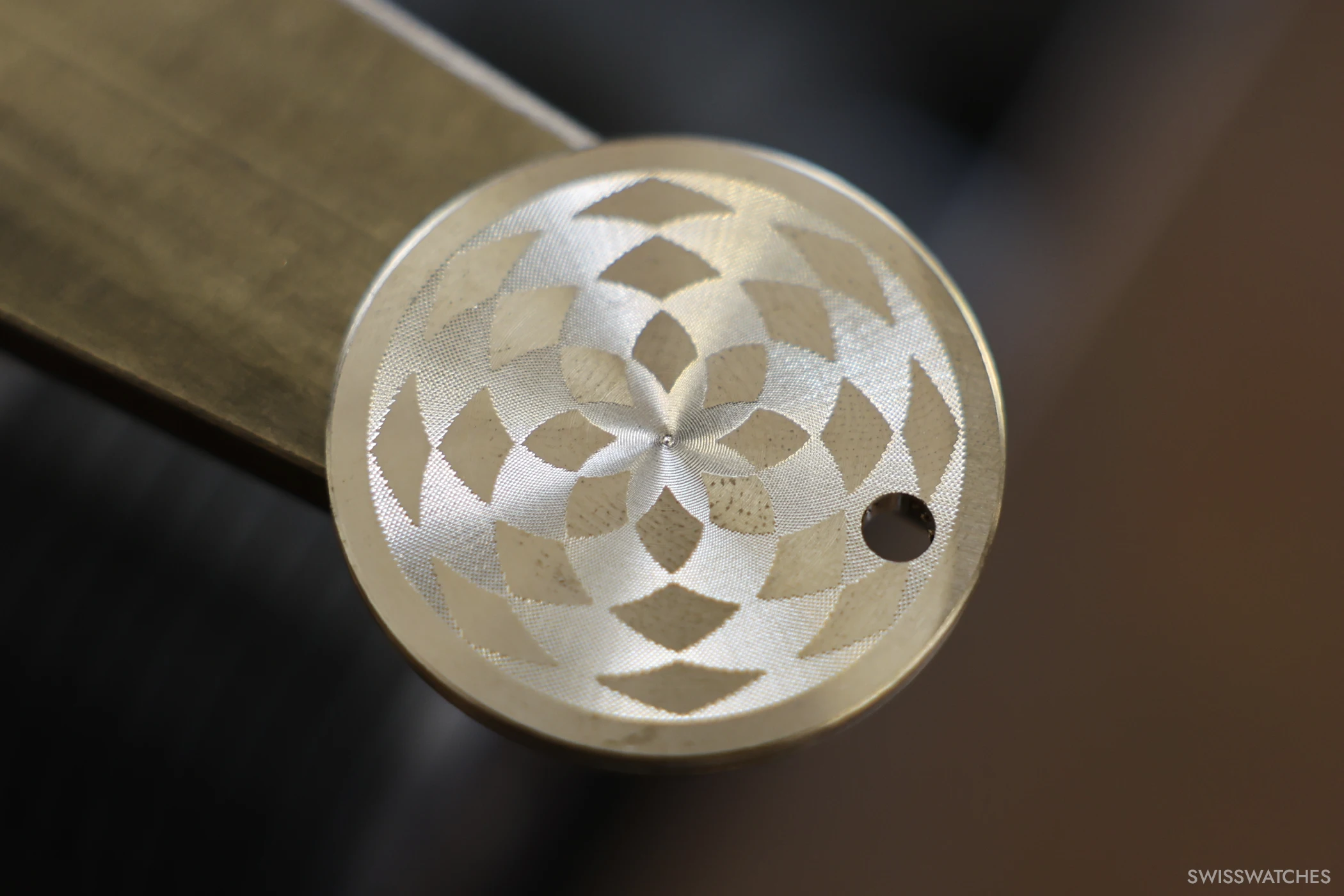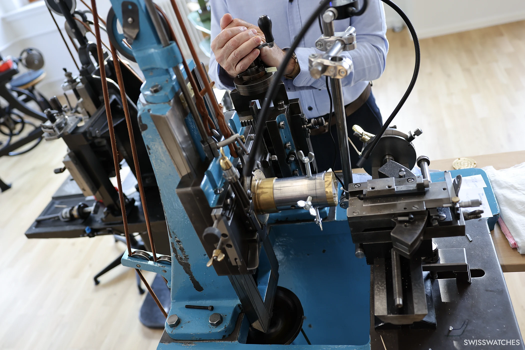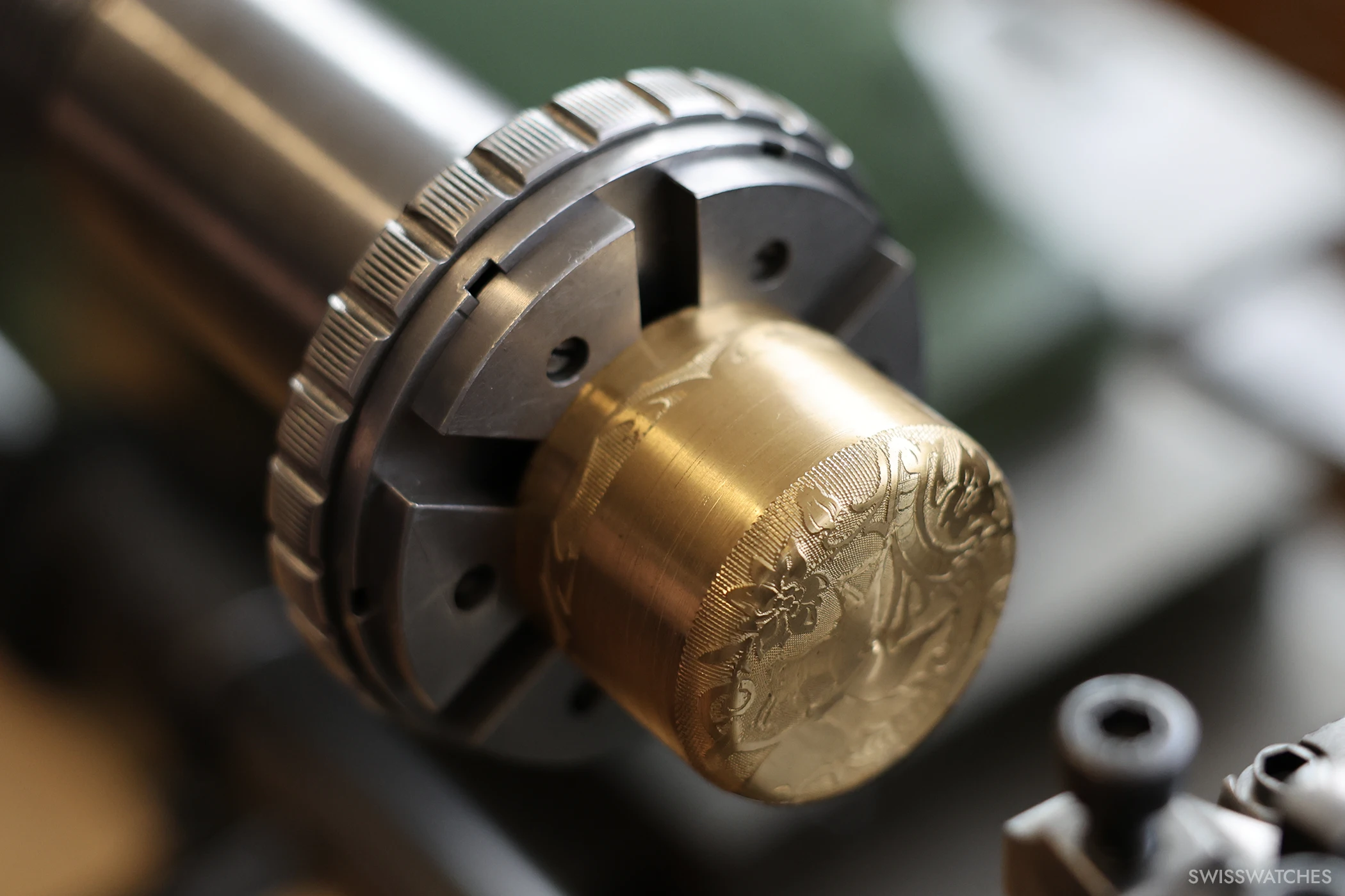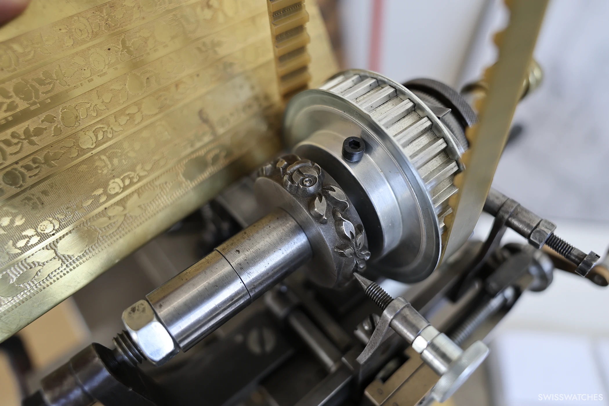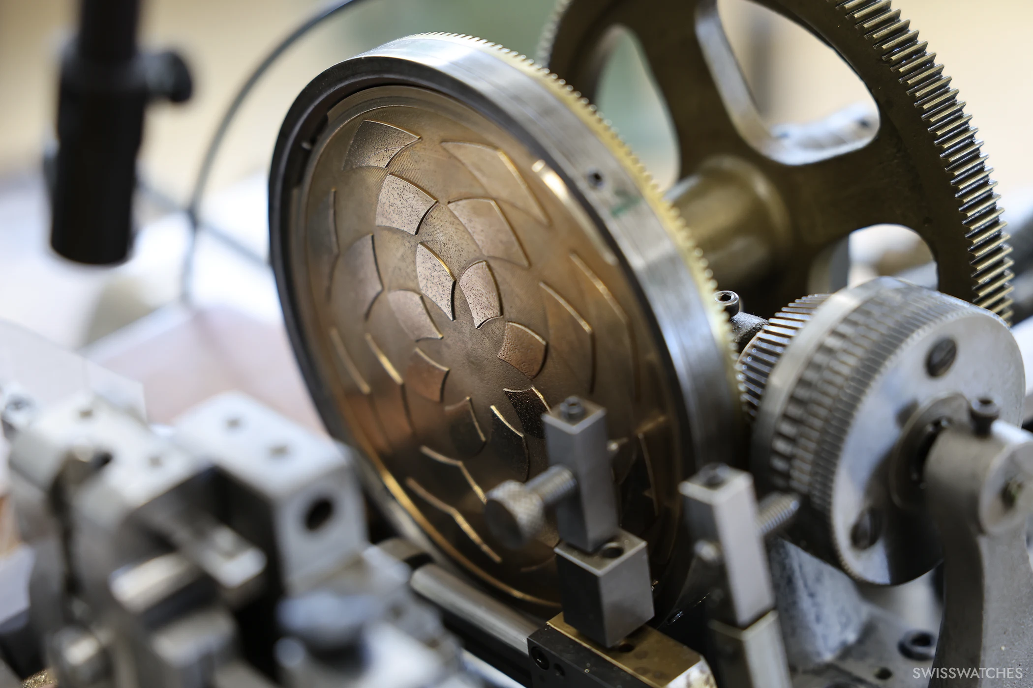 Wer schon mal eine Guillochiermaschine in Aktion erlebt hat, der weißt: Der Prozess des Guillochierens ist eine Symbiose aus mechanischer Präzision, menschlicher Intuition und Kreativität. Im Zentrum einer Rosettenmaschine (Rose Engine) befinden sich die sogenannten Rosetten – Nockenscheiben mit unterschiedlichen Profilen, die das gewünschte Muster bestimmen. Ein Taster folgt den Erhebungen und Vertiefungen der Rosette, während der Guillocheur das Werkstück rotiert und gleichzeitig den Stichel mit absolut gleichmäßigem Druck gegen die Oberfläche presst. Jede Unregelmäßigkeit im Druck oder in der Drehgeschwindigkeit würde zu einer sichtbaren Störung im Muster führen, was die Arbeit zu einer psychisch wie physisch extrem fordernden Tätigkeit macht.