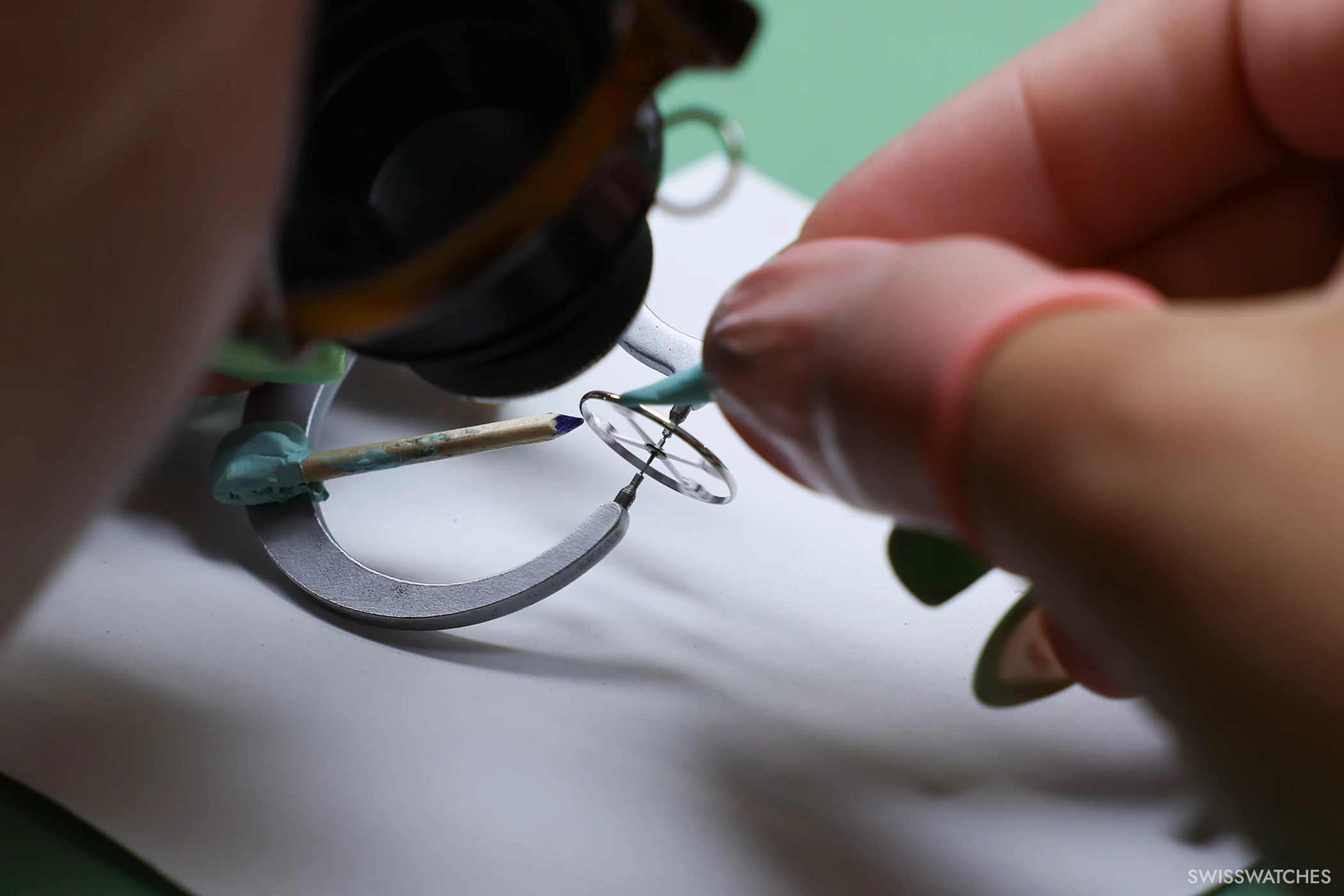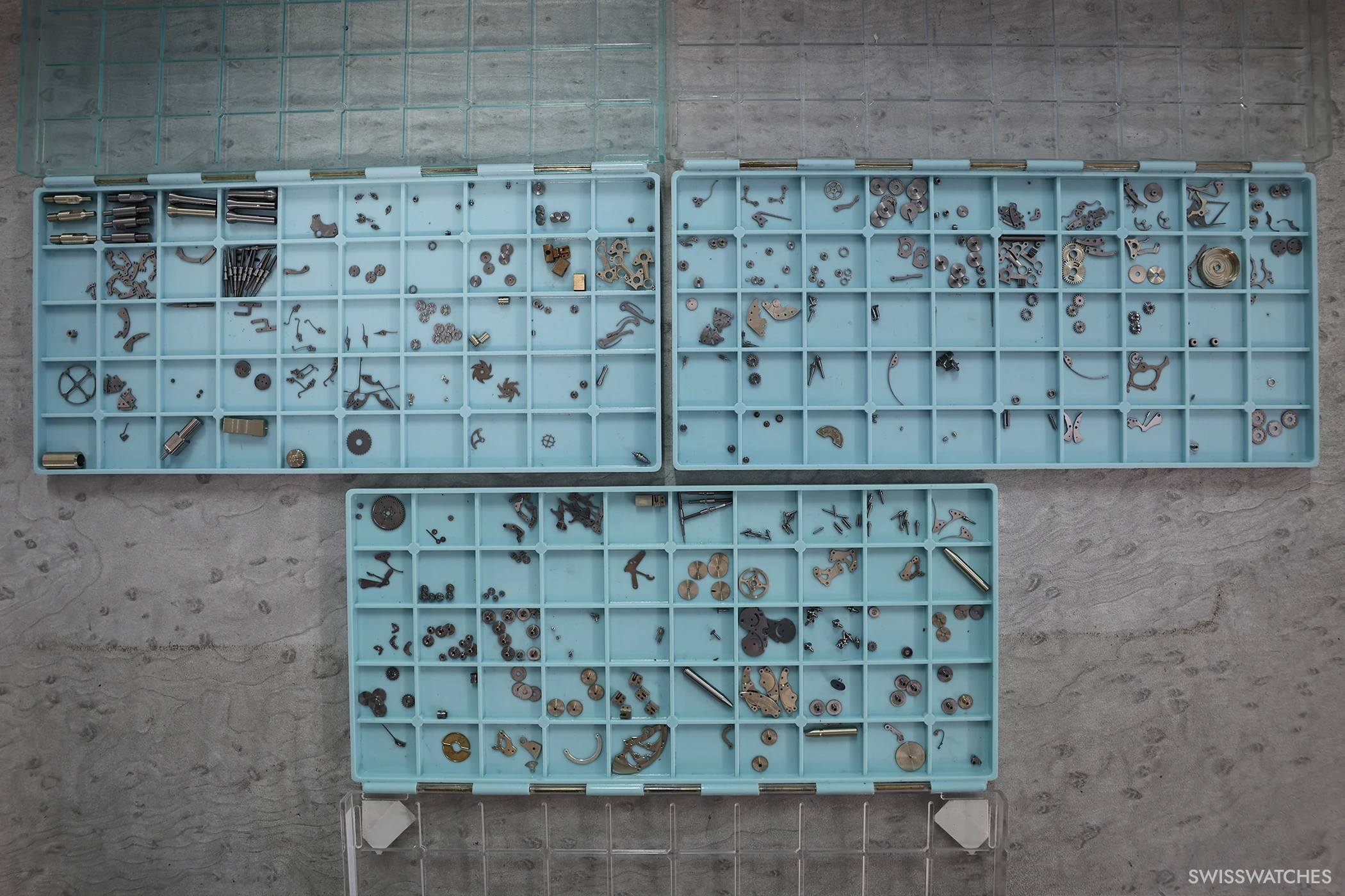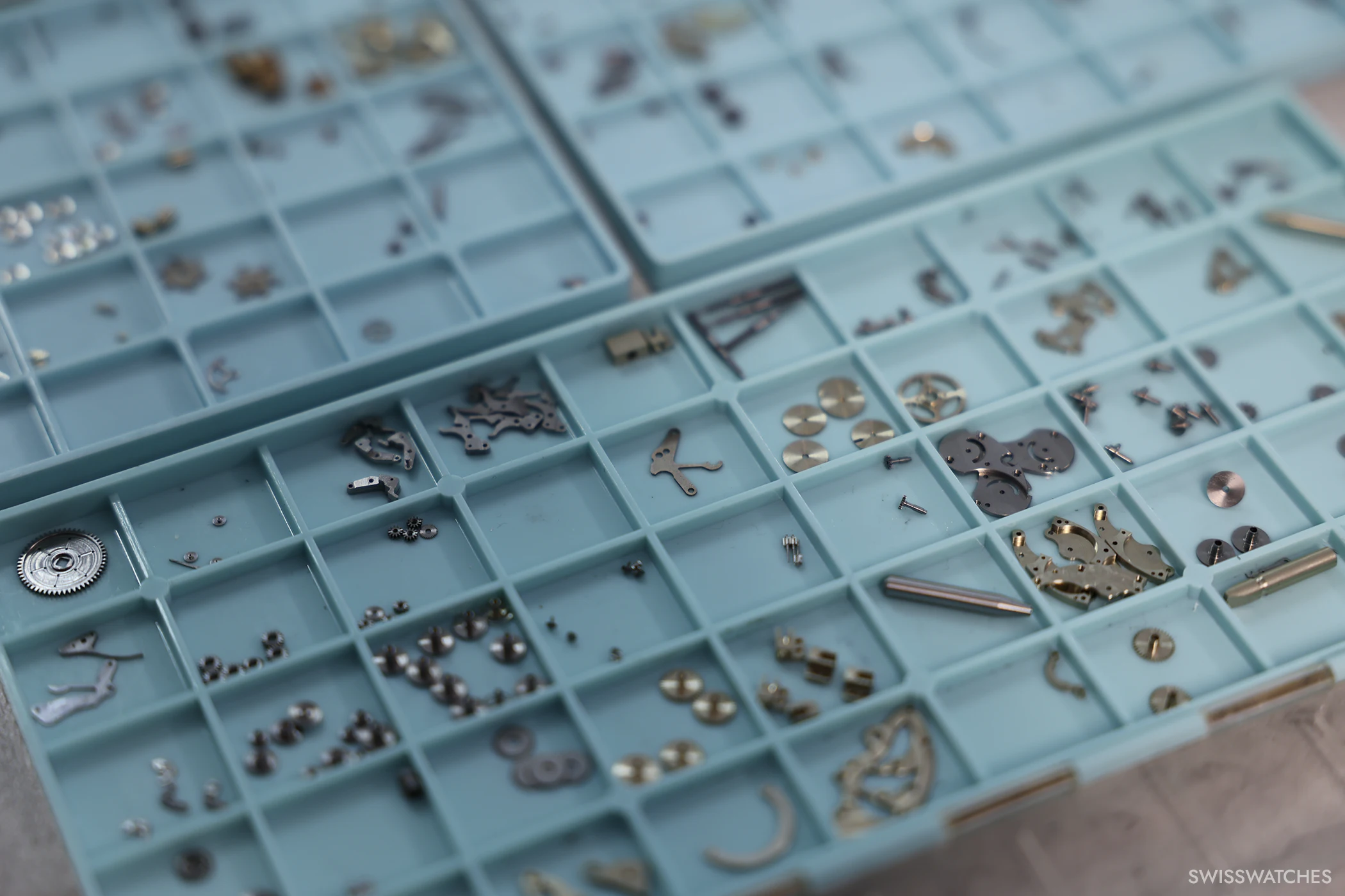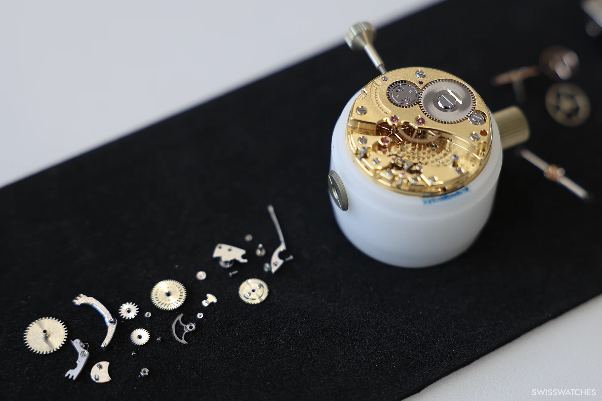 Die Montage einer Uhr erfolgt in zwei Phasen. Zuerst wird das Werk komplett zusammengesetzt, um die mechanische Funktion und die Gangwerte zu prüfen. Danach wird es wieder vollständig zerlegt, jedes Teil gereinigt und erst dann erfolgt die endgültige Montage mit anschließender Ölung. Dieser Prozess stellt sicher, dass keine mikroskopischen Späne oder Staubpartikel die langfristige Zuverlässigkeit beeinträchtigen.