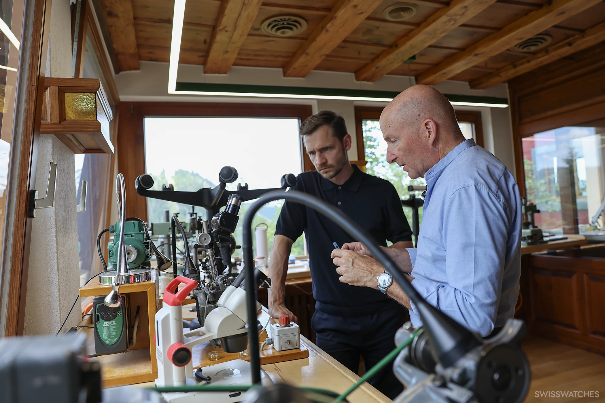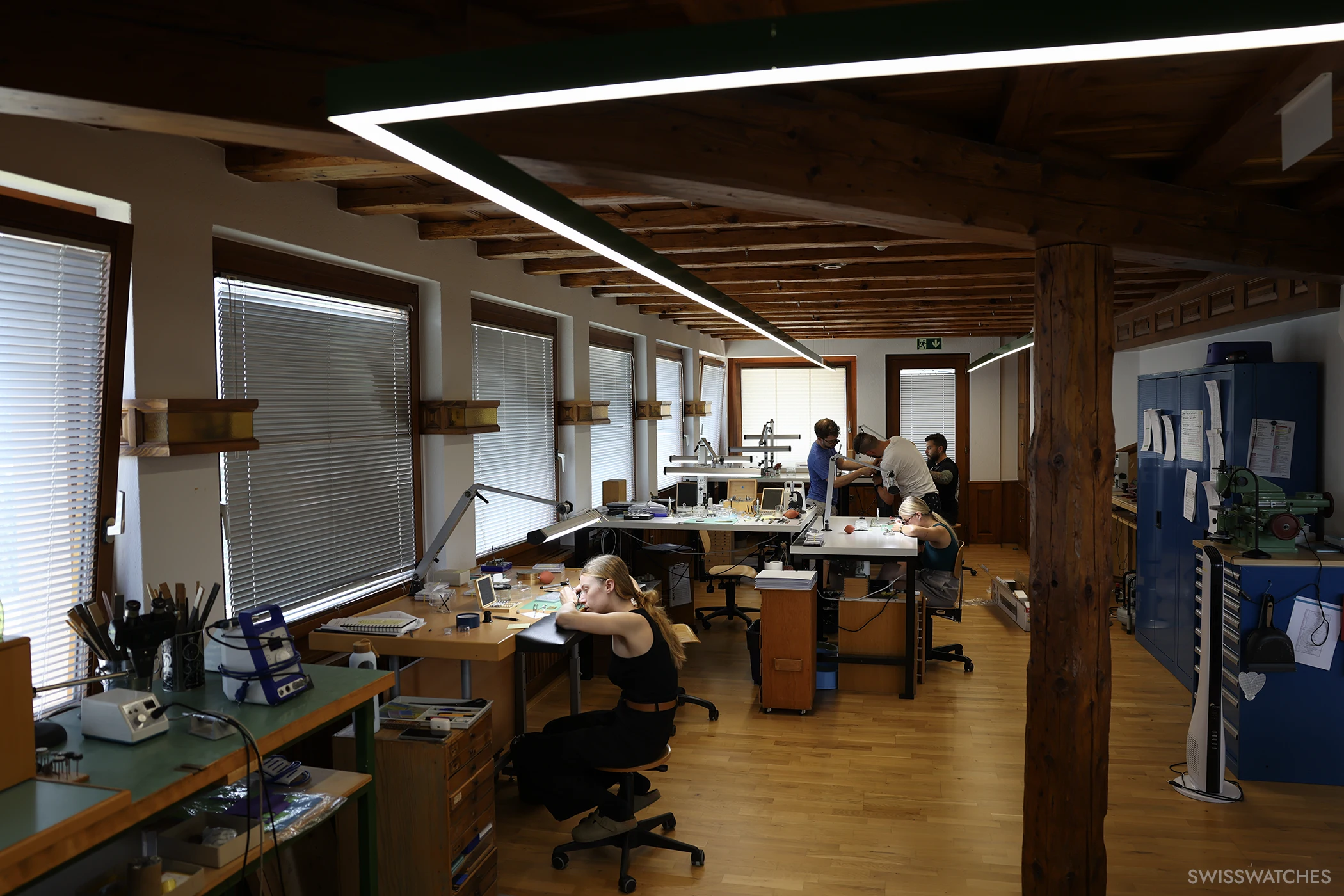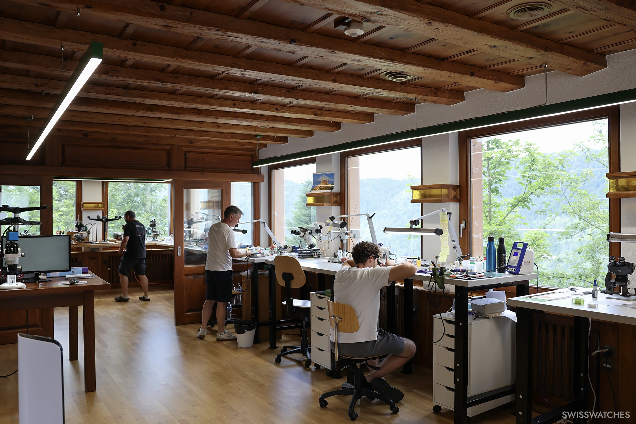Hier findet die eigentliche Montage, die Feinregulierung und die kunstvolle Endbearbeitung der Uhren statt. In den lichtdurchfluteten Räumen arbeiten rund 30 Uhrmacher und Dekorateure. Es ist bemerkenswert, wie viele junge Menschen hier arbeiten. Immerhin sind es Arbeiten, die absolute Ruhe und Konzentration erfordern, Tugenden, die man nicht gerade von jungen Menschen – vor allem im hier und jetzt – gewohnt ist. Aber es ist wahrscheinlich genau das, was den Reiz ausmacht für eine Generation, die sonst in einer atemberaubenden Geschwindigkeit durch die Welt surft. Und Kari Voutilainen? Der steht selbst fast täglich hinter der Werkbank, wo er sich auf die Entwicklung neuer Prototypen und die Arbeit an Einzelstücken konzentriert und natürlich seinen jungen Uhrmachern wie ein Mentor zur Seite steht.