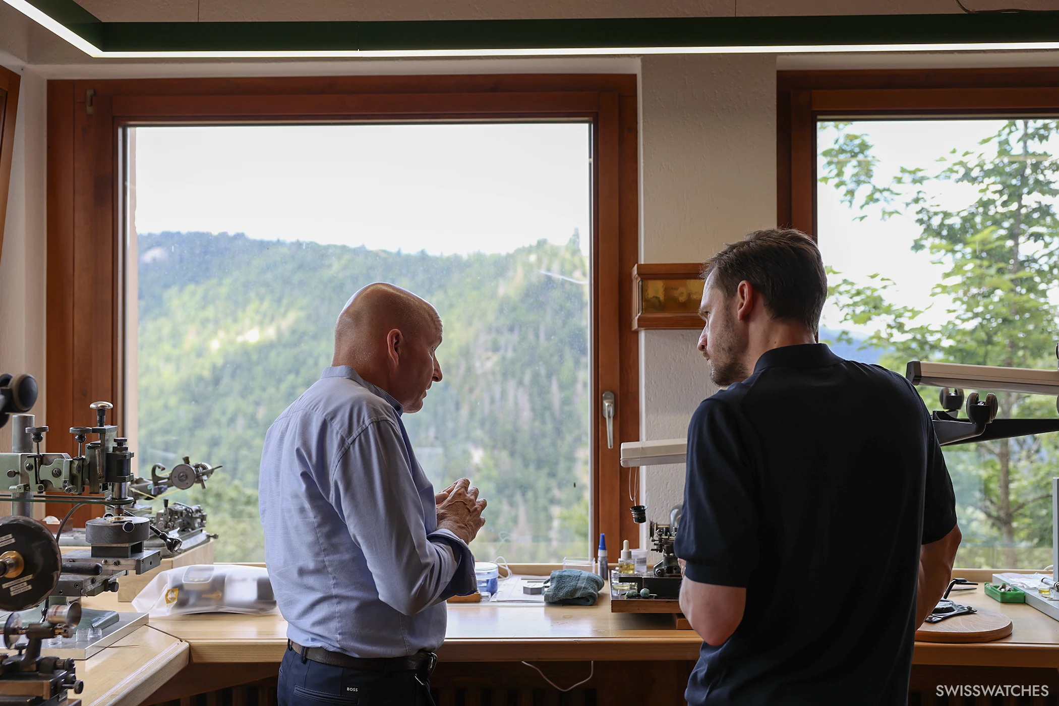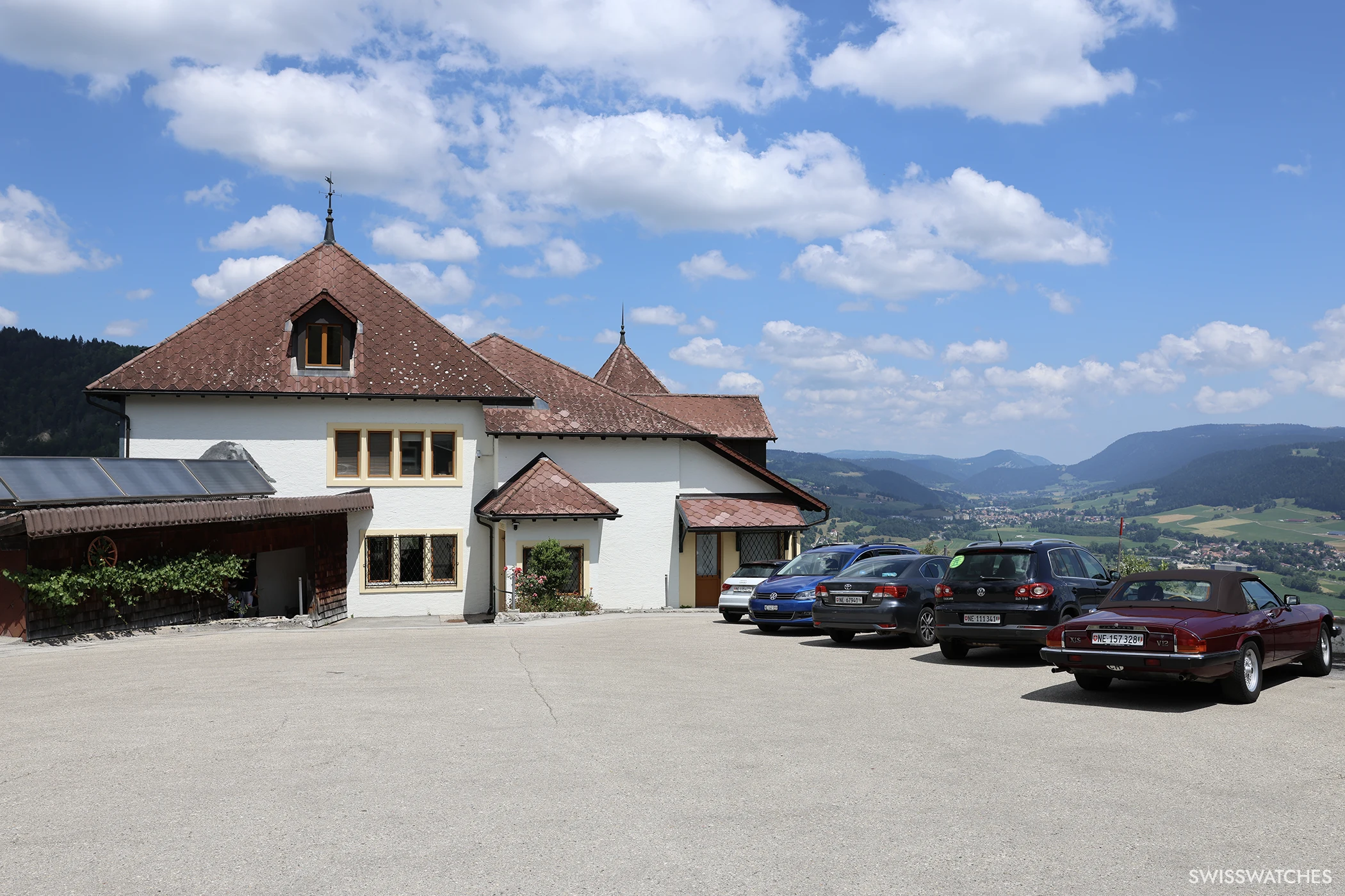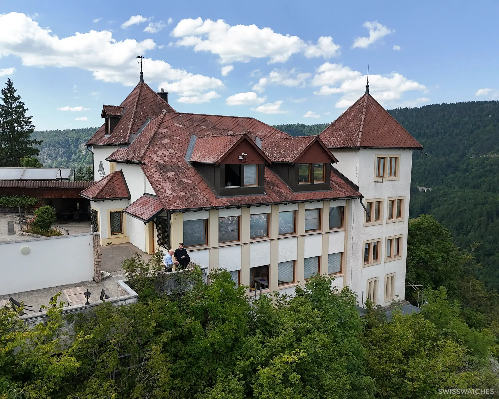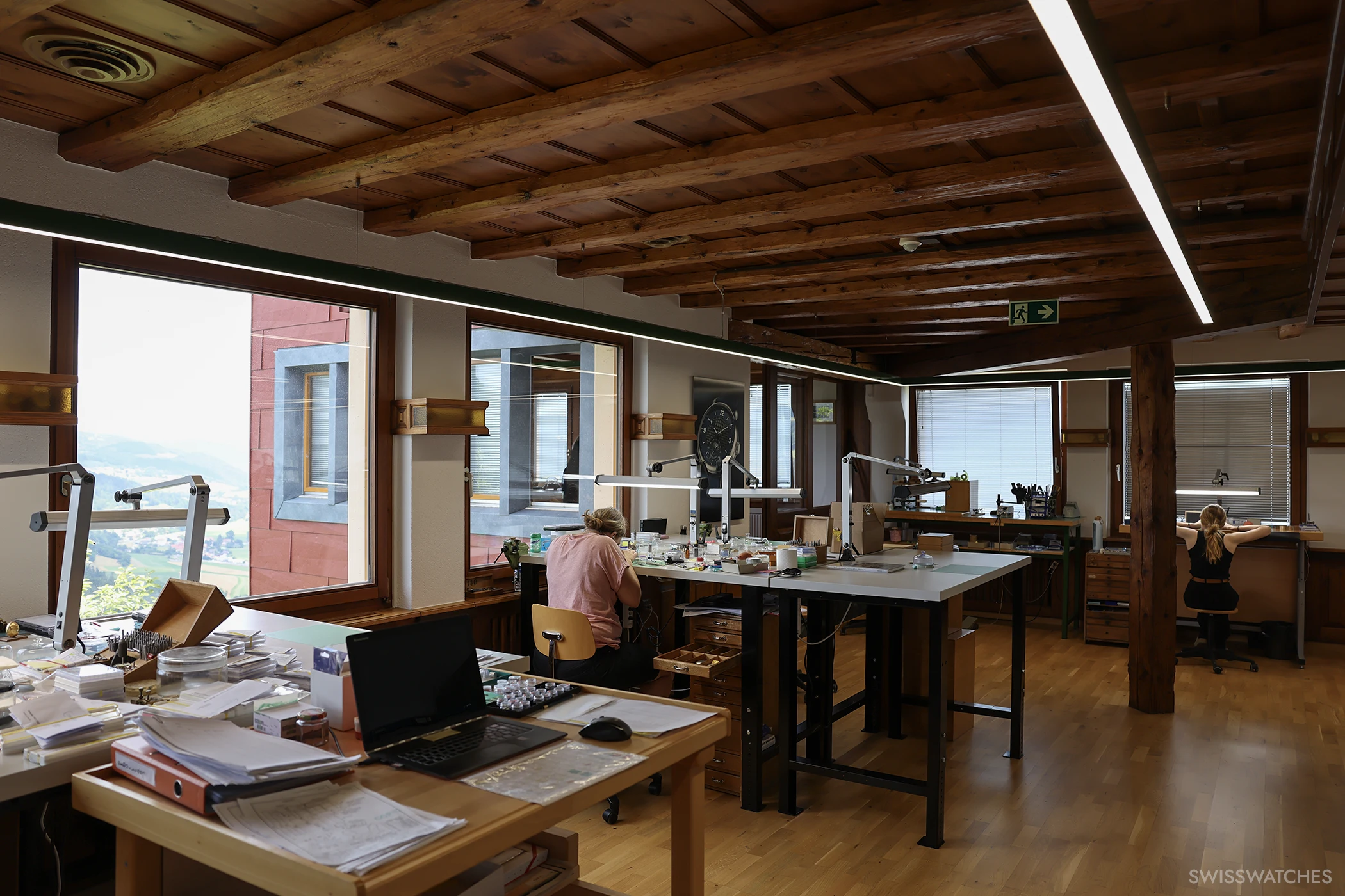 Wir springen in unsere Autos und folgen Kari Voutilainen zum „Le Chapeau de Napoléon“, seinem Bergatelier, gelegen auf fast 1.000 Metern Höhe an einem steilen Berghang oberhalb von Fleurier mit einem spektakulären Panoramablick über das gesamte Val-de-Travers. Der Name des Ortes rührt von der markanten Felsformation her, die an den Hut des französischen Kaisers erinnert. Kari Voutilainen kaufte und renovierte das Gebäude im Jahr 2021, um seiner wachsenden Belegschaft ein Arbeitsumfeld zu bieten, das Ruhe, Licht und Inspiration vereint.