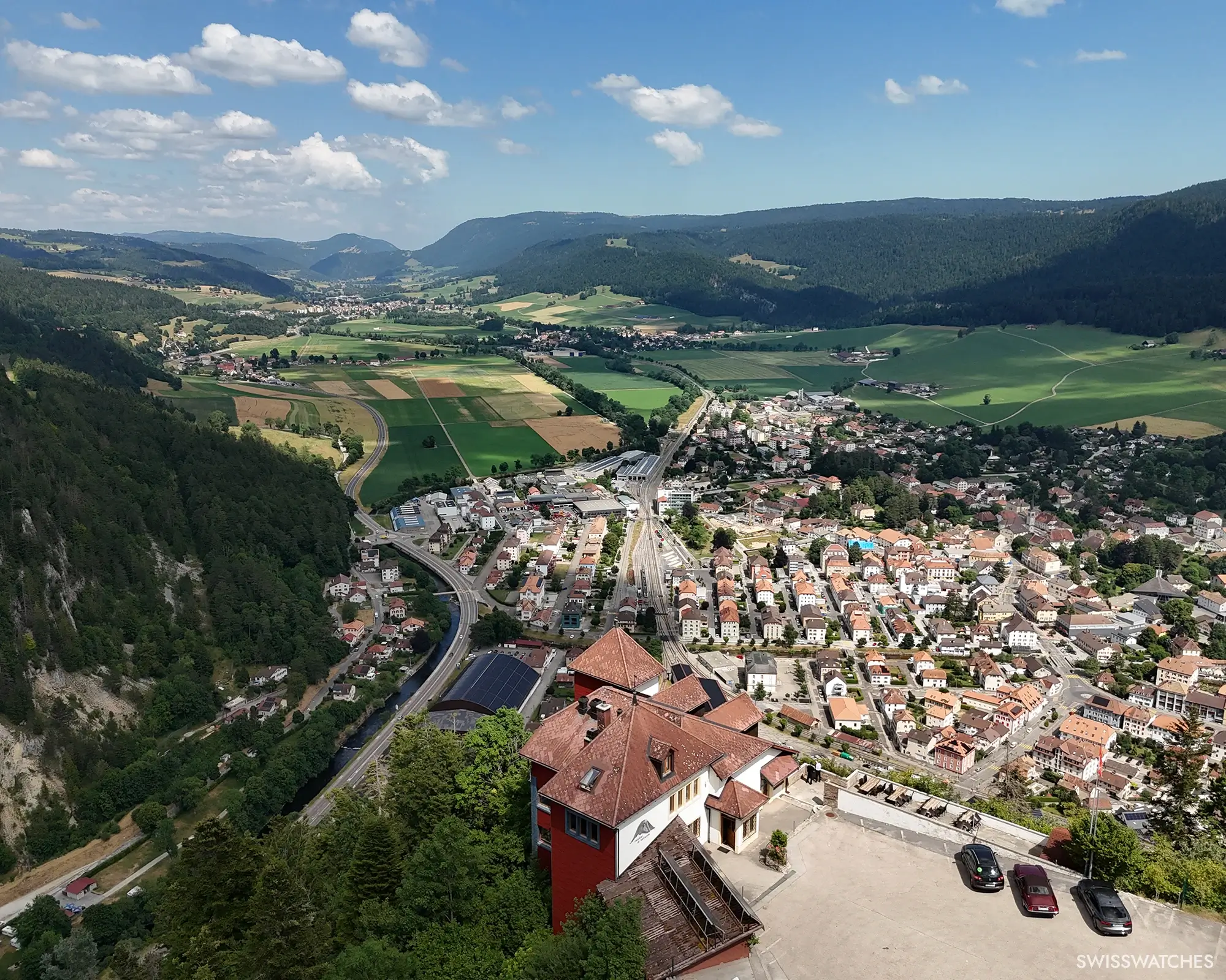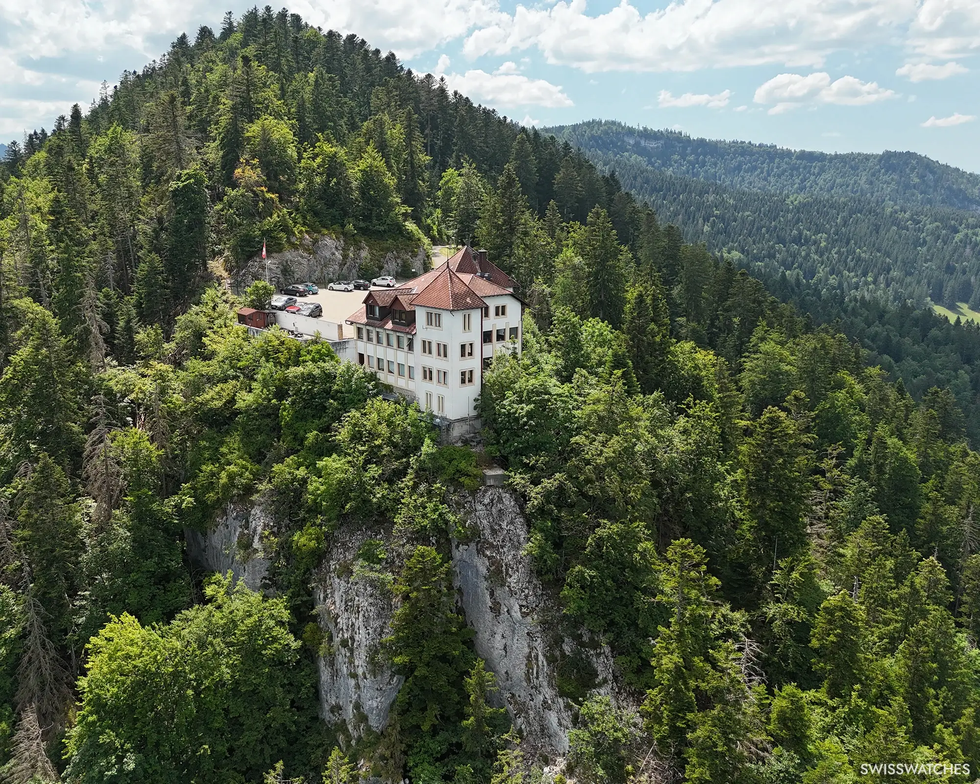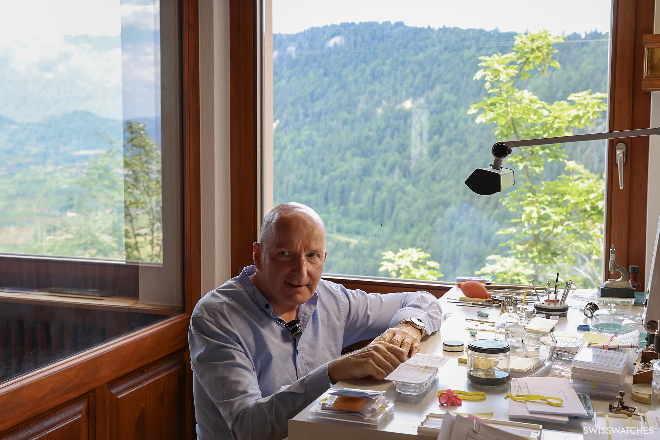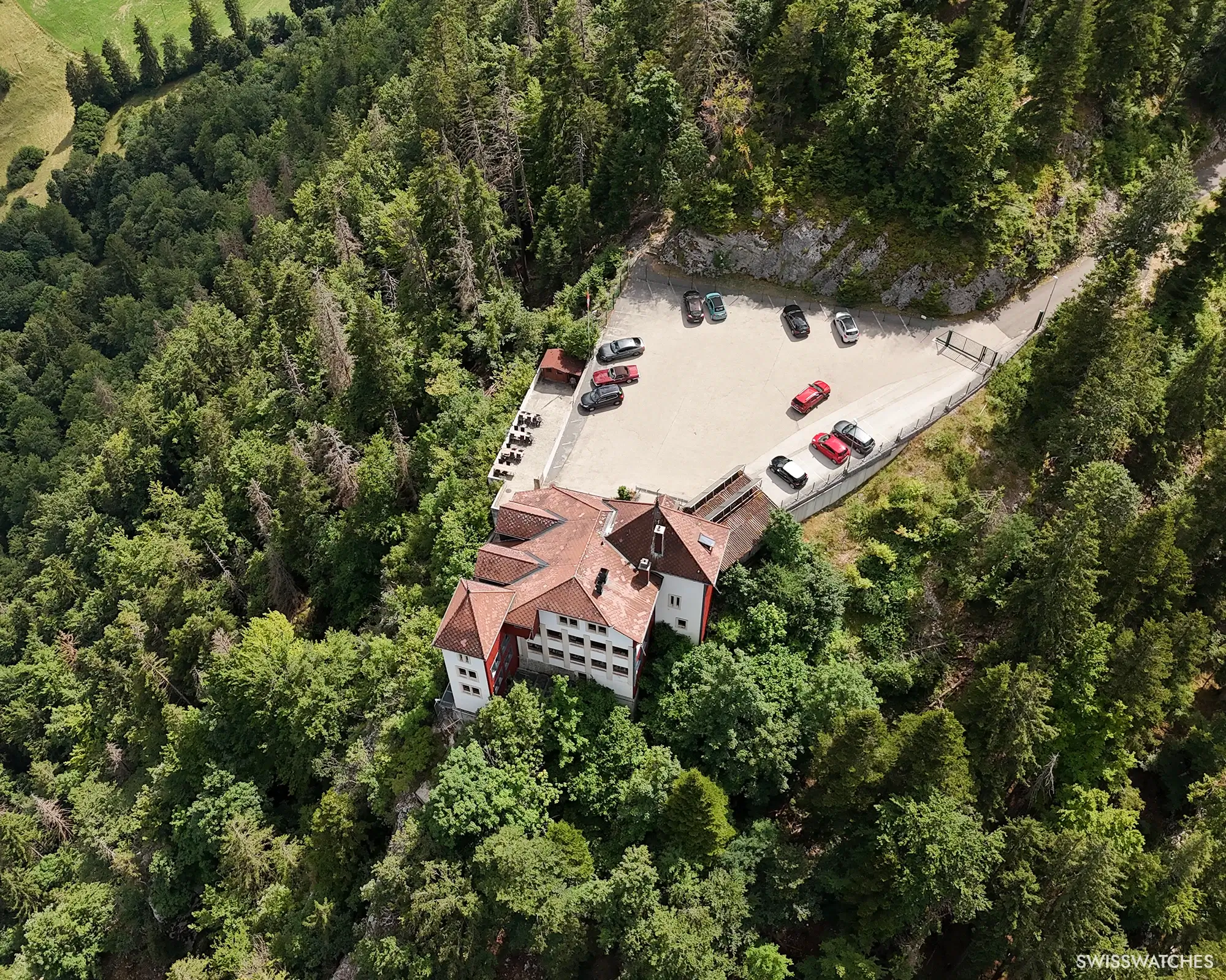 Wir springen in unsere Autos und folgen Kari Voutilainen zum „Le Chapeau de Napoléon“, seinem Bergatelier, gelegen auf fast 1.000 Metern Höhe an einem steilen Berghang oberhalb von Fleurier mit einem spektakulären Panoramablick über das gesamte Val-de-Travers. Der Name des Ortes rührt von der markanten Felsformation her, die an den Hut des französischen Kaisers erinnert. Kari Voutilainen kaufte und renovierte das Gebäude im Jahr 2021, um seiner wachsenden Belegschaft ein Arbeitsumfeld zu bieten, das Ruhe, Licht und Inspiration vereint.