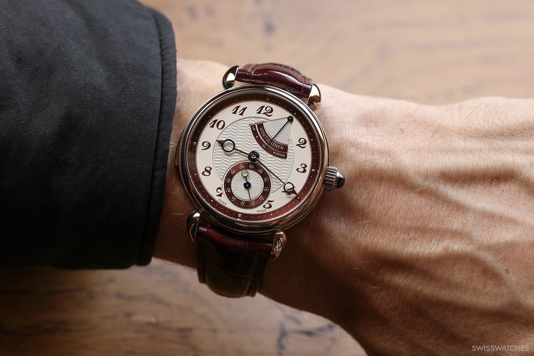 Noch radikaler ist das Modell Vingt-8 ISO. Hier rotieren die Minutenanzeige und der Stundenzeiger synchron. Dies bedeutet, dass die relative Position der Zeiger zueinander über den gesamten Tag hinweg die gleiche Bedeutung behält. Kari Voutilainen spielt hier mit der psychologischen Komponente der Zeitablesung. Nach der Theorie von Daniel Kahneman (System 1 vs. System 2) nutzen wir für gewöhnliche Uhren unser intuitives System 1. Anstatt die Zeit nur flüchtig zu erfassen, müssen bei der Vingt-8 ISO die Zeigerpositionen neu interpretiert werden, da sich der äußere Minutenring mit dem Stundenzeiger mitdreht. Das führt dazu, dass die Zeiger zur vollen Stunde immer übereinander und zur halben Stunde genau gegenüberstehen. Die Vingt-8 ISO zwingt uns dazu, System 2 zu aktivieren und bewusst über die Zeit nachzudenken, was die emotionale Bindung zum Zeitmesser verstärkt.