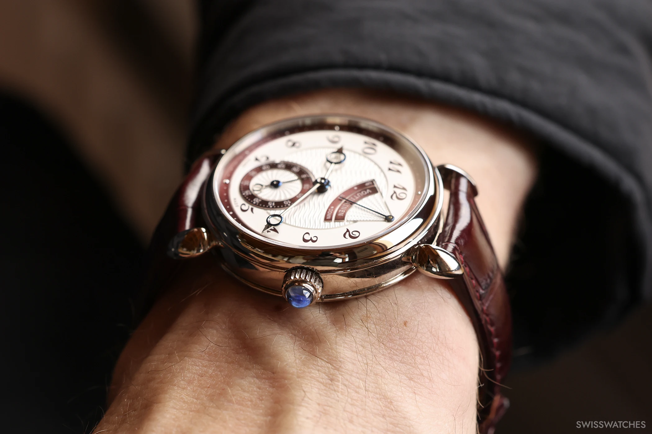 Die Unruh dieser Kaliber sind mit einem Durchmesser von 13.5 mm außergewöhnlich groß und besitzen eine hohe Trägheit, was sie weniger anfällig für Erschütterungen macht. Sie schlägt mit einer Frequenz von 2,5 Hz (18.000 Halbschwingungen pro Stunde), was den Uhren das beruhigende, langsame Ticken historischer Chronometer verleiht.