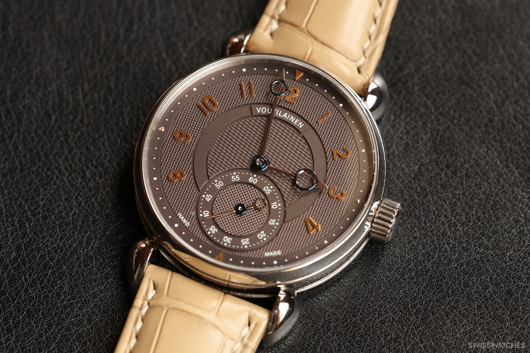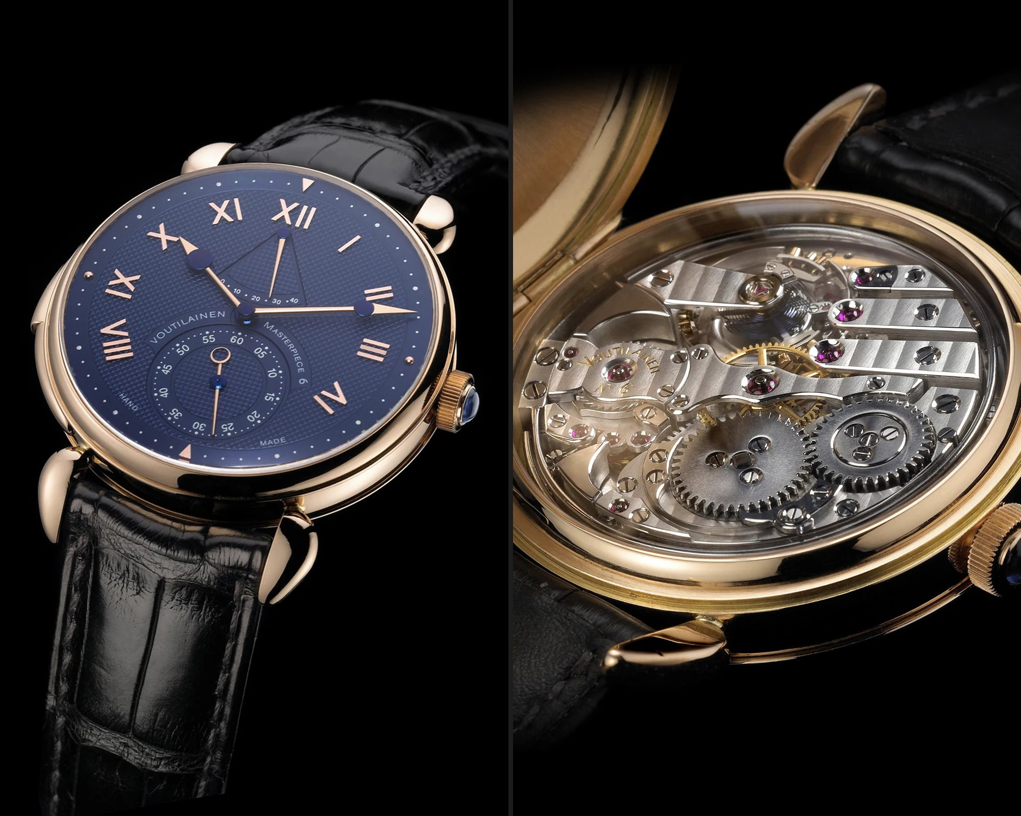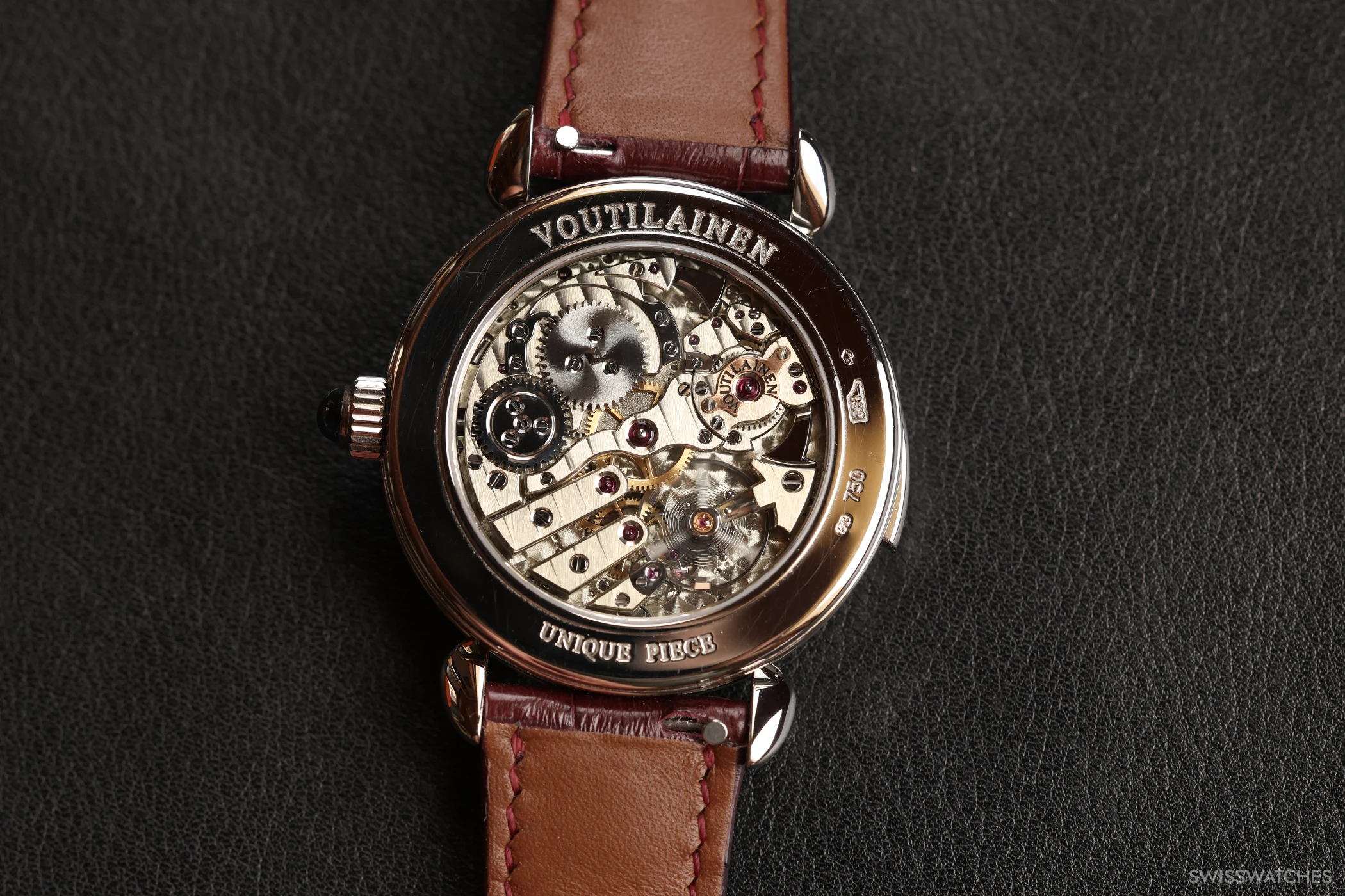 Neben den technischen Finessen zeichnen sich Voutilainens Uhren durch originelle Anzeigenkonzepte aus. Seine dezimale Minutenrepetition (Masterpiece 6) ist eine logische Konsequenz aus der menschlichen Wahrnehmung. Anstatt die Zeit in den unhandlichen 15-Minuten-Schritten (Viertelstunden) der traditionellen Uhrmacherei zu schlagen, nutzt sie das Zehnersystem. Ein Beispiel: Um 4:37 Uhr ertönen vier tiefe Töne für die Stunden, drei Doppel-Töne für die Zehner-Minuten und sieben hohe Töne für die Einzelminuten.