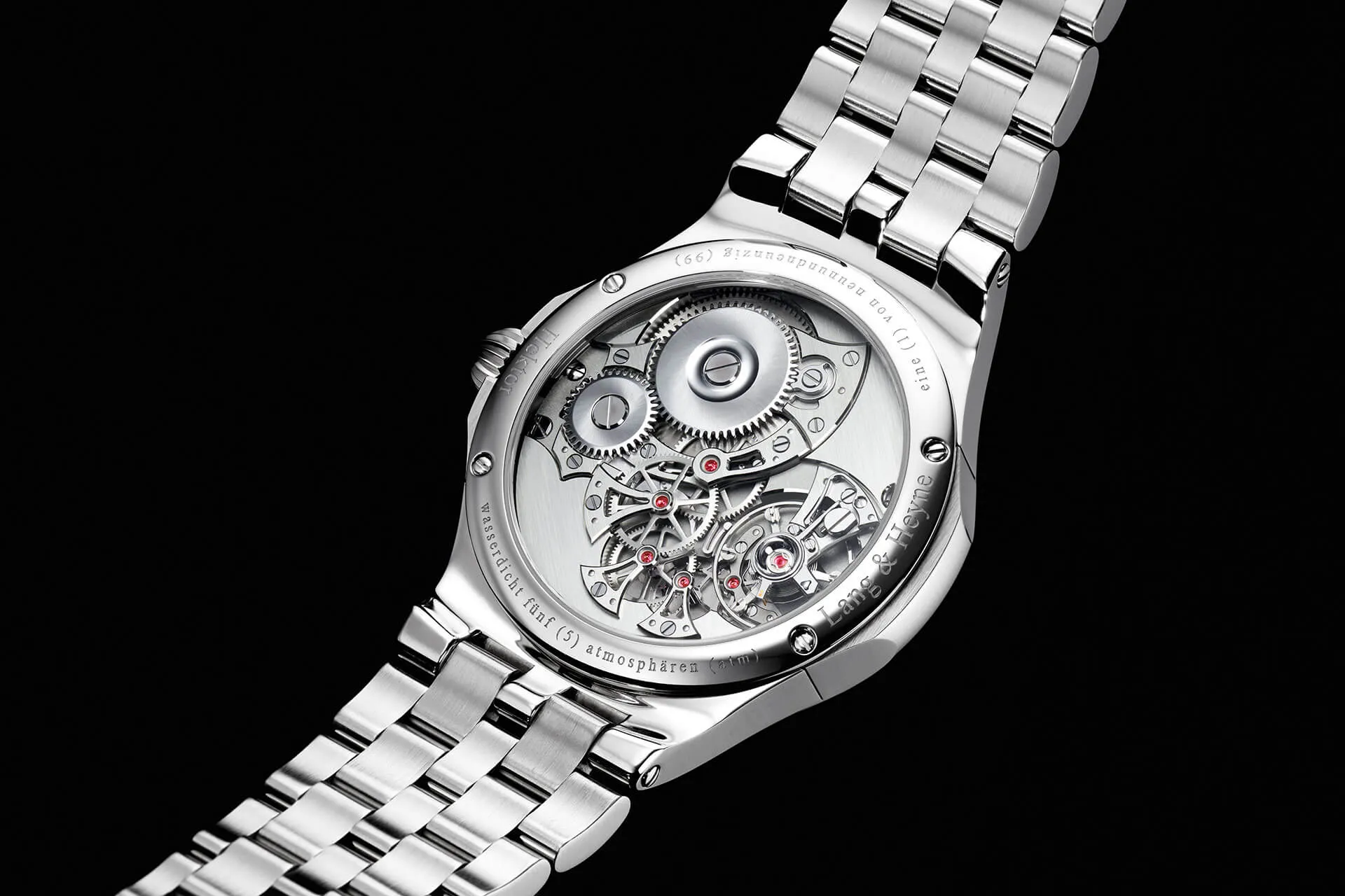 Dreht man die Uhr um, kann man durch den Saphirglasboden das große Werk betrachten. Das Kaliber LH 33.2-2 mit Handaufzug hat der Mitgründer der Manufaktur, Marco Lang, ursprünglich für den zur Marke gehörenden Werkehersteller Uhren-Werke Dresden (UWD) entwickelt. Die Idee war, deutschen Marken ein einheimisches Kaliber anbieten zu können. Allerdings führte der aufwendige Aufbau als Klobenwerk und der hohe händische Einsatz bei Montage, Einstellung und Verzierung zu einem recht hohen Preis. Zudem fällt die Nachfrage nach Handaufzugswerken im Gegensatz zu Automatikwerken überschaubar aus. So hatte das Werk nur seltene Gastspiele, beispielsweise in einer limitierten Golduhr von Sinn.