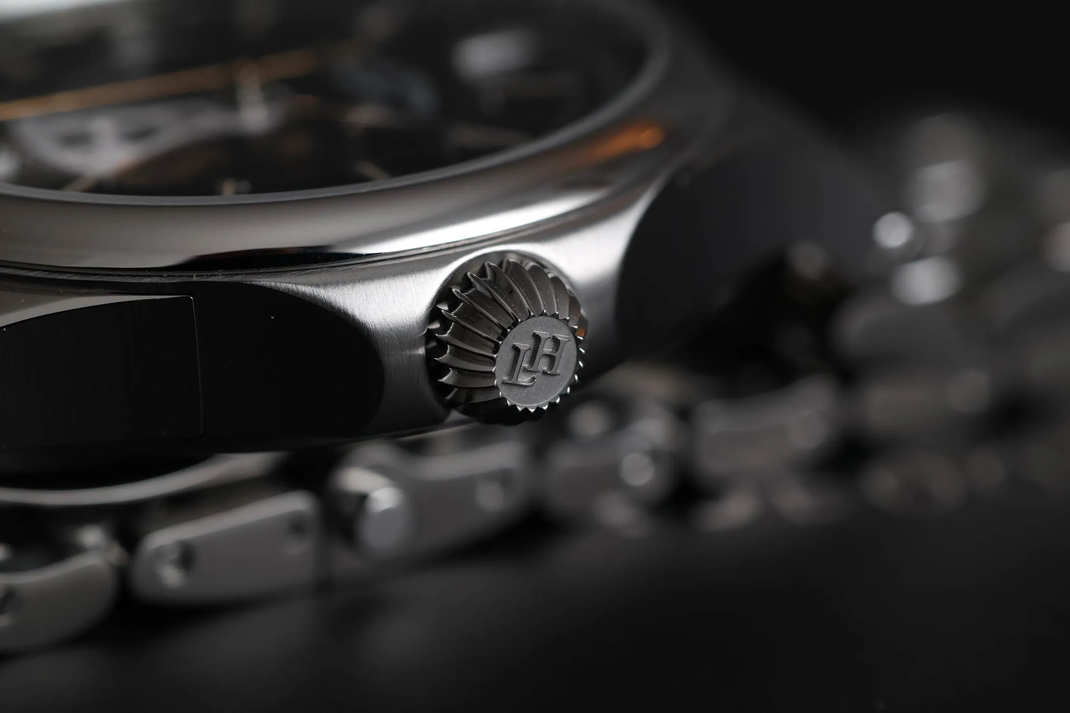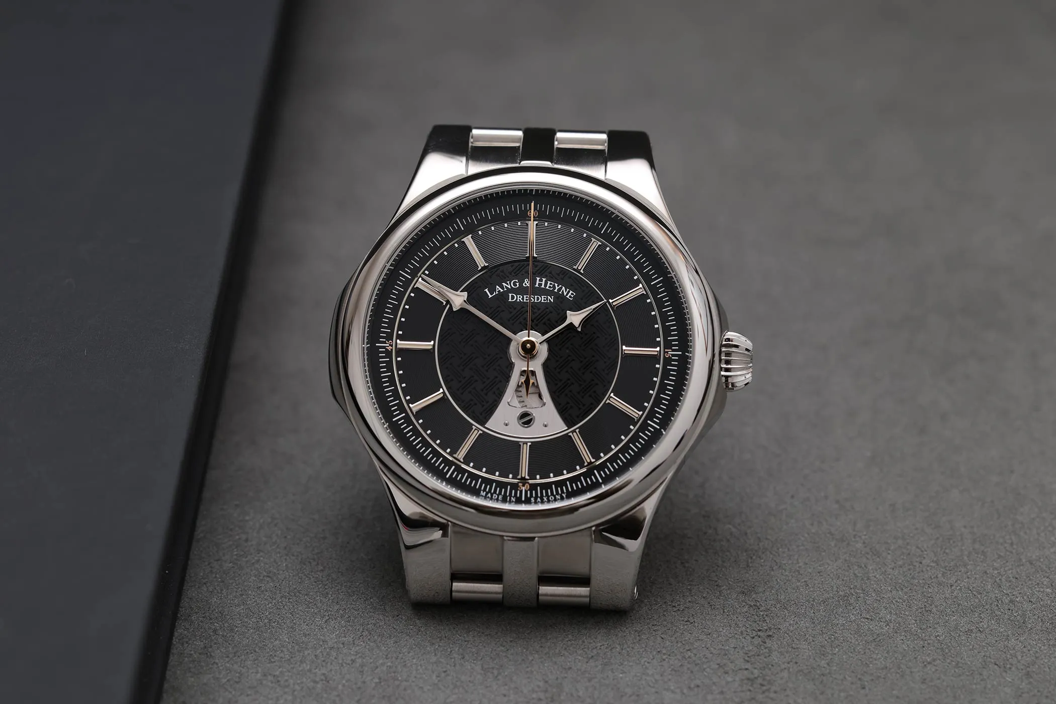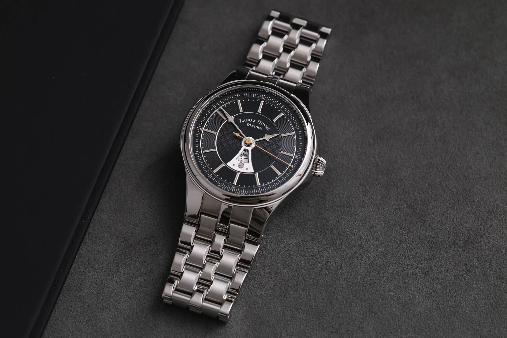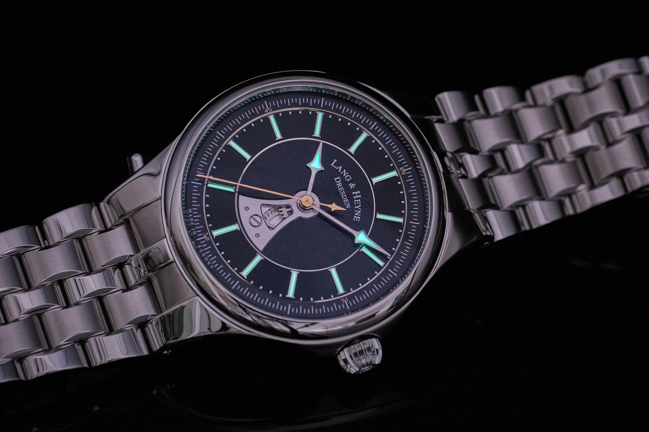 Das Edelstahlgehäuse mit Kronenschutz und das integrierte Edelstahlarmband machen die Uhr robust, vor allem im Vergleich zu einem kratzempfindlichen Goldgehäuse. Dank der erhöhten Wasserdichtigkeit bis 5 bar kann der Träger auch mit der Uhr baden gehen. Zudem sorgt die Leuchtmasse auf Indexen und Zeigern für einfache Ablesbarkeit im Dunkeln, was den handgravierten Goldzeigern und gebläuten Stahlzeigern der anderen Modelle vorenthalten bleibt. Die Hektor ist also für den modernen Alltag gerüstet. Eine reine Toolwatch will die Hektor jedoch ebenso wenig sein wie eine klassische Lang & Heyne im Stahlgehäuse. Sie setzt mit einem besonderen Handaufzugskaliber und charakterstarkem Design mit sichtbarer Mechanik auf der Zifferblattseite auf Eigenständigkeit.