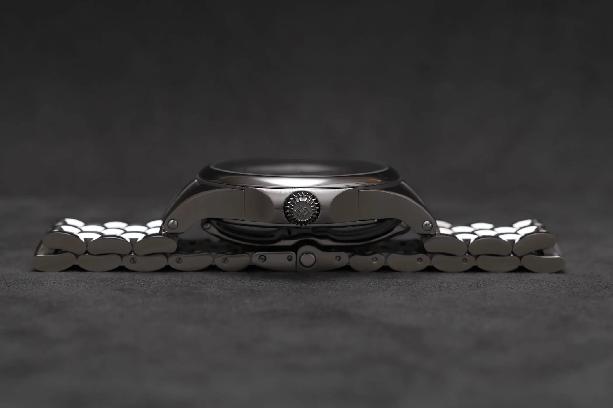 Statt römischer Zahlen, wie sonst oft, gibt es aufgesetzte Indexe mit Leuchtmasse, die durch ihre Form mit den Serifen aber etwas an eine römische Eins erinnern. Liebe zum Detail zeigen auch die anderen Elemente des Zifferblatts: Es ist dreifach abgestuft. Außen unter der gedruckten Sekundenskala ist die Oberfläche matt. Dann, durch einen silbernen Ring getrennt, weist der Ring unter den aufgesetzten Stundenindexen Rillen auf. Der innere Teil mit dem Kloben zeigt feinere Rillen und ein Reliefmuster aus dem stilisierten „H“, das die Marke für die Hektor entworfen hat und das auch die Schatulle ziert.
