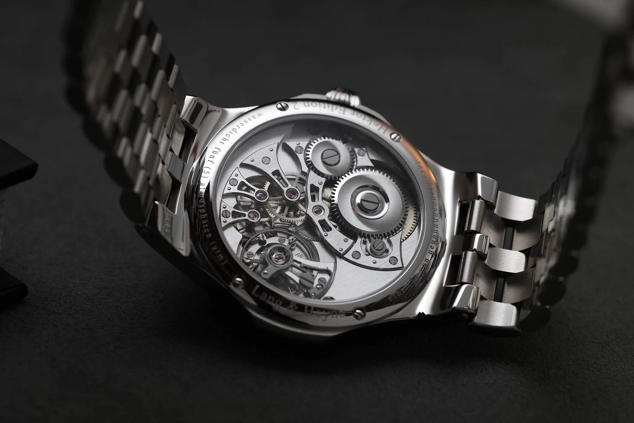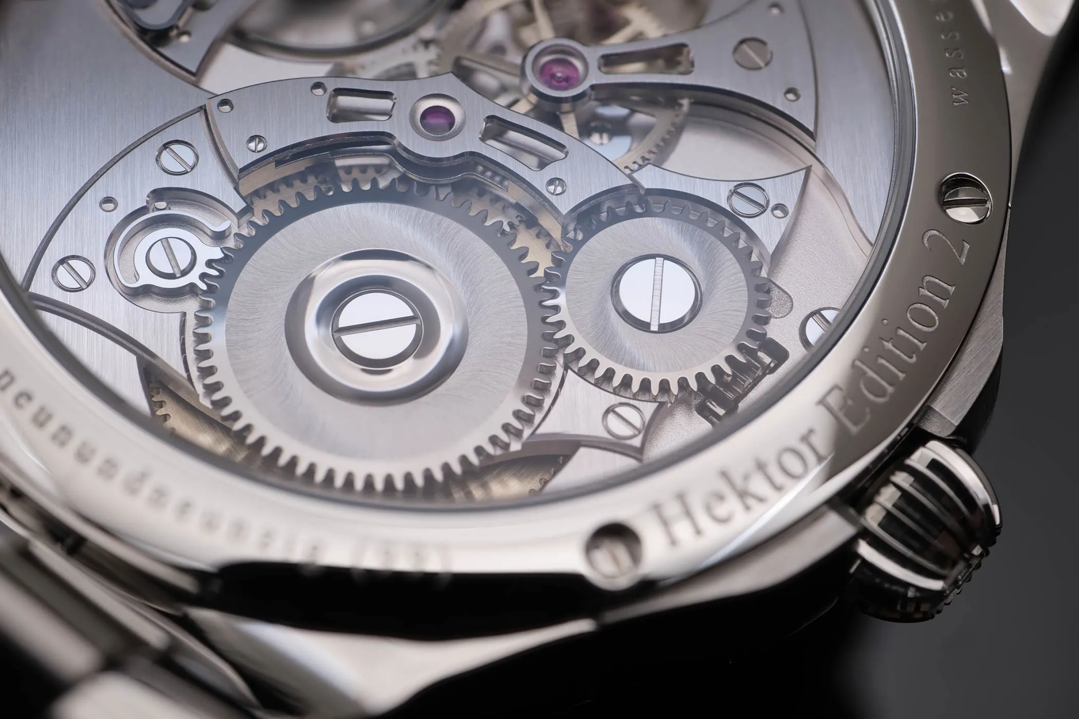 Von der ersten Hektor unterscheidet sich das Werk der Edition II, das jetzt den Zusatz „-2“ trägt, durch eine neu gestaltete Sekundenradbrücke, die den Sekundenradkloben ersetzt. Lang & Heyne hat auch die Rückerfeinregulierung überarbeitet: Mit dem Rücker wird nun der Abfallfehler eingestellt. Die flache Unruhspirale kann entsprechend frei atmen. Feinreguliert wird über sechs Masseexzenter auf dem großen Unruhreif. Dieser oszilliert mit 21.600 A/h und kann über das Ziehen der Krone gestoppt werden. Neu ist auch das Räderwerk in Neusilber, das sich mit seinem wärmeren Farbton von den rhodinierten Werkteilen aus Messing absetzt.