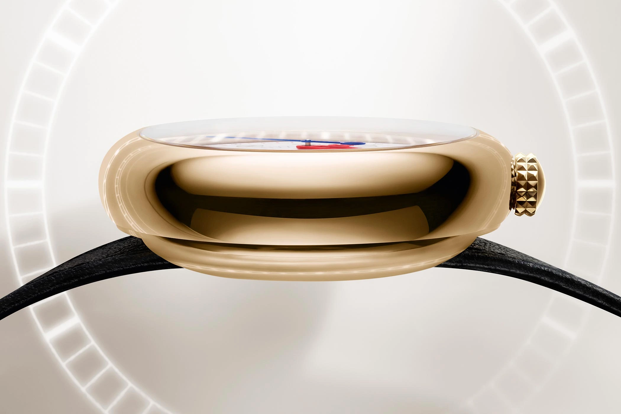 Wie ähnelt oder unterscheidet sich die neu aufgelegte Monterey von ihren historischen Vorläufern? Zunächst einmal hat die Uhr eine neue Gehäusegröße von 39 mm und ist aus 18 Karat Gelbgold gefertigt. Sie behält die charakteristische Kieselsteinform bei, die durch die spiegelpolierte Wölbung und Aulentis ungewöhnliche Gehäusekonstruktion entsteht, sowie eine Krone bei 12 Uhr, die an Taschenuhren erinnert.