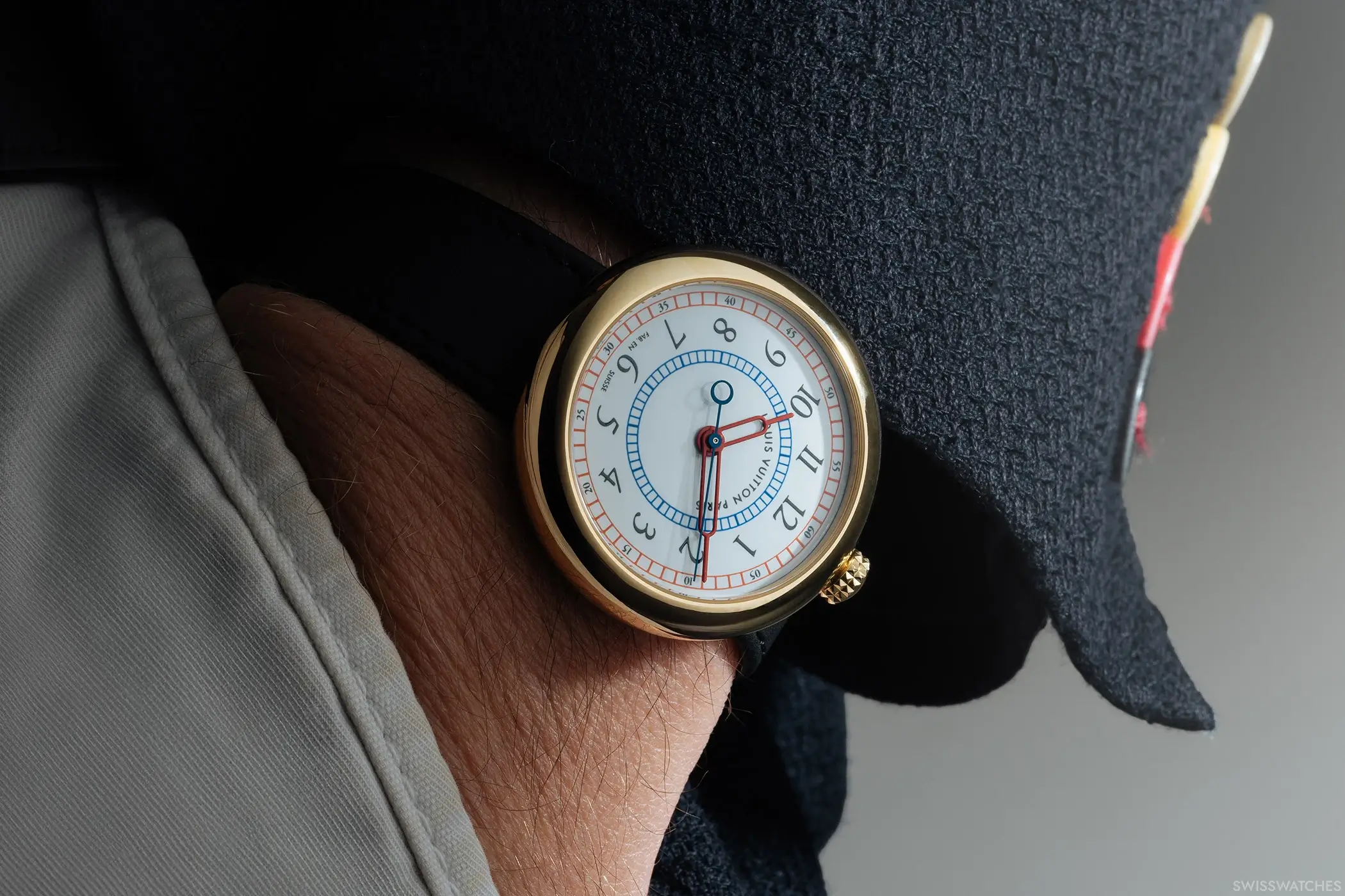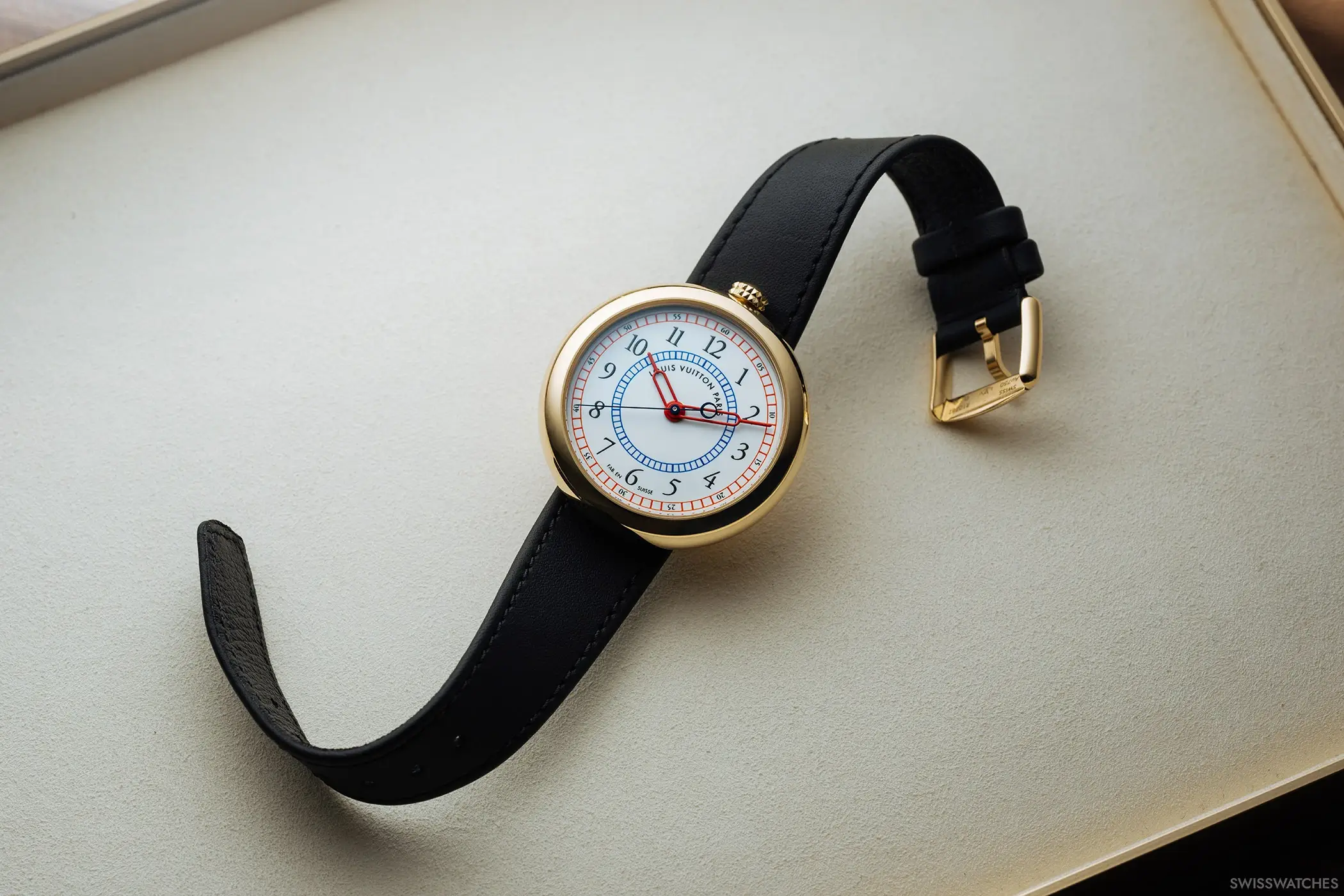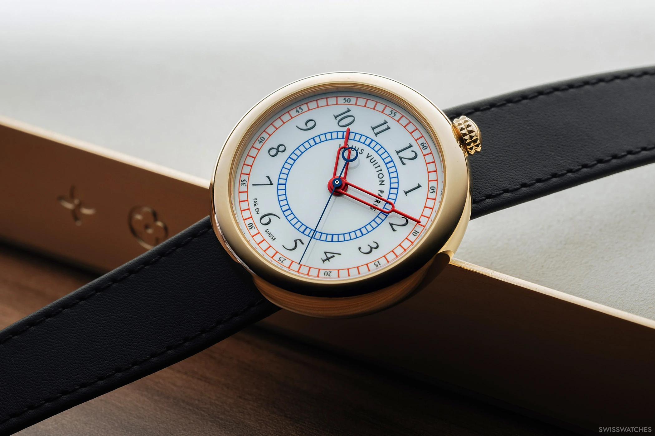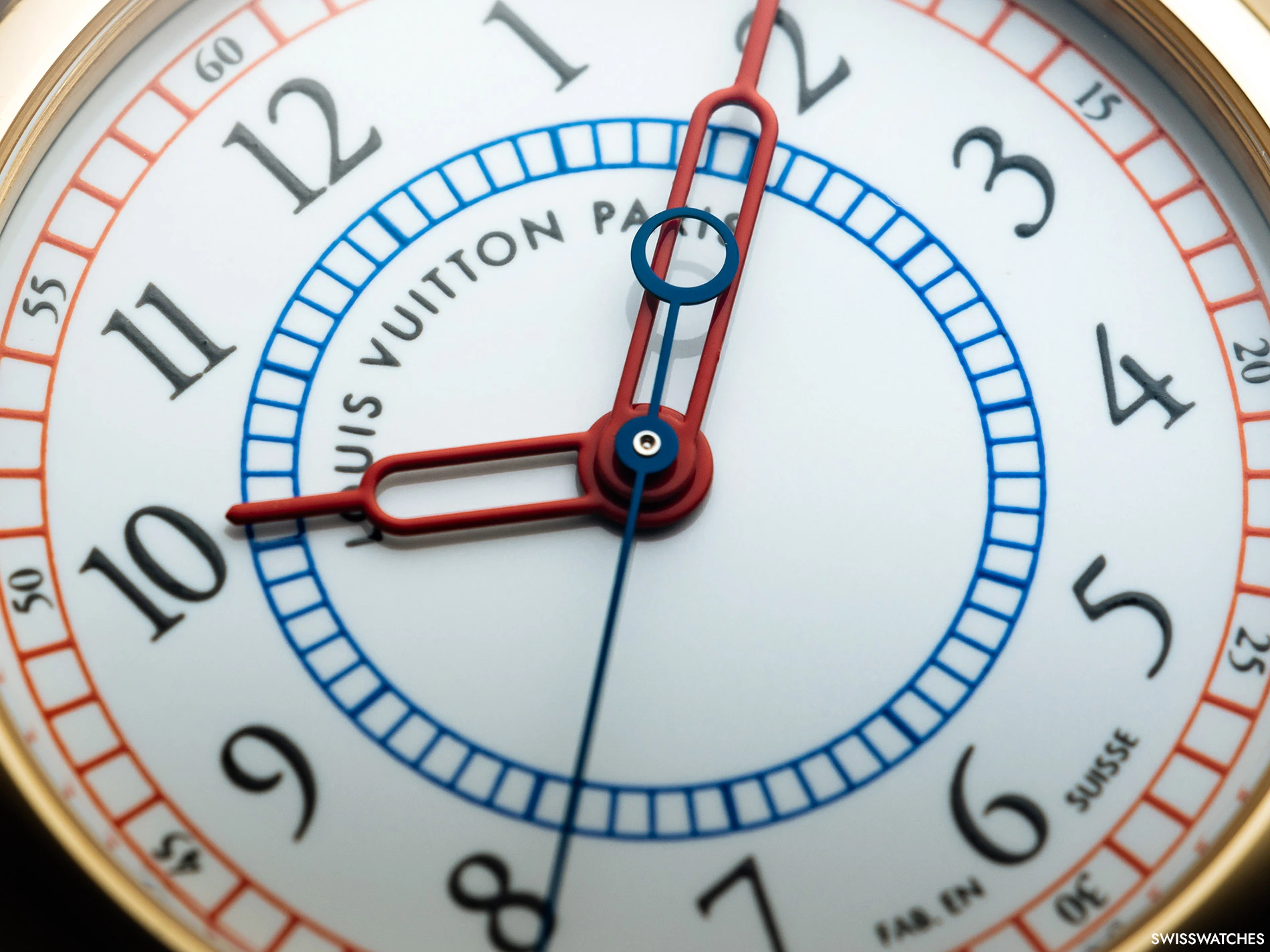 Die Farben finden sich auch in den passenden Zeigern aus Weißgold wieder – sie sind spritzenförmig und mit rotem Lack eingefasst – sowie in einem Sekundenzeiger aus gebläutem Stahl, die zusammen an die Originalmodelle erinnern. Die beiden Signaturen „FAB. EN SUISSE“ und, etwas prominenter, „LOUIS VUITTON PARIS“ runden das Zifferblatt ab und bekräftigen die doppelte Identität der Uhr: Schweizer Uhrmacherkunst und Pariser Stil.