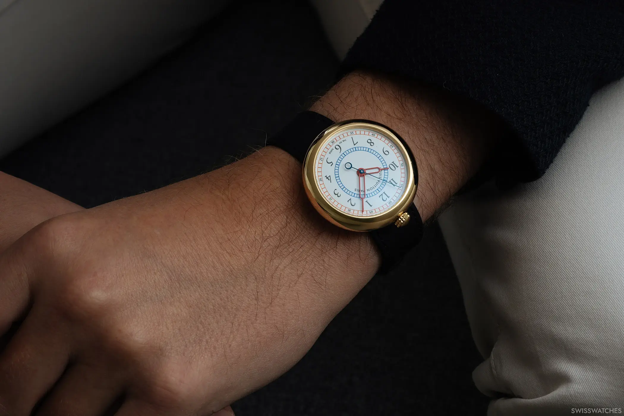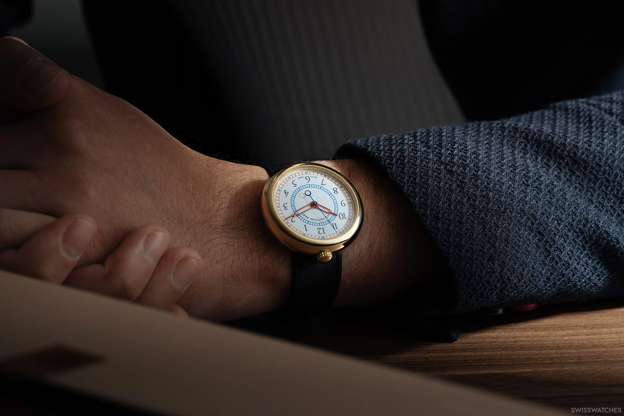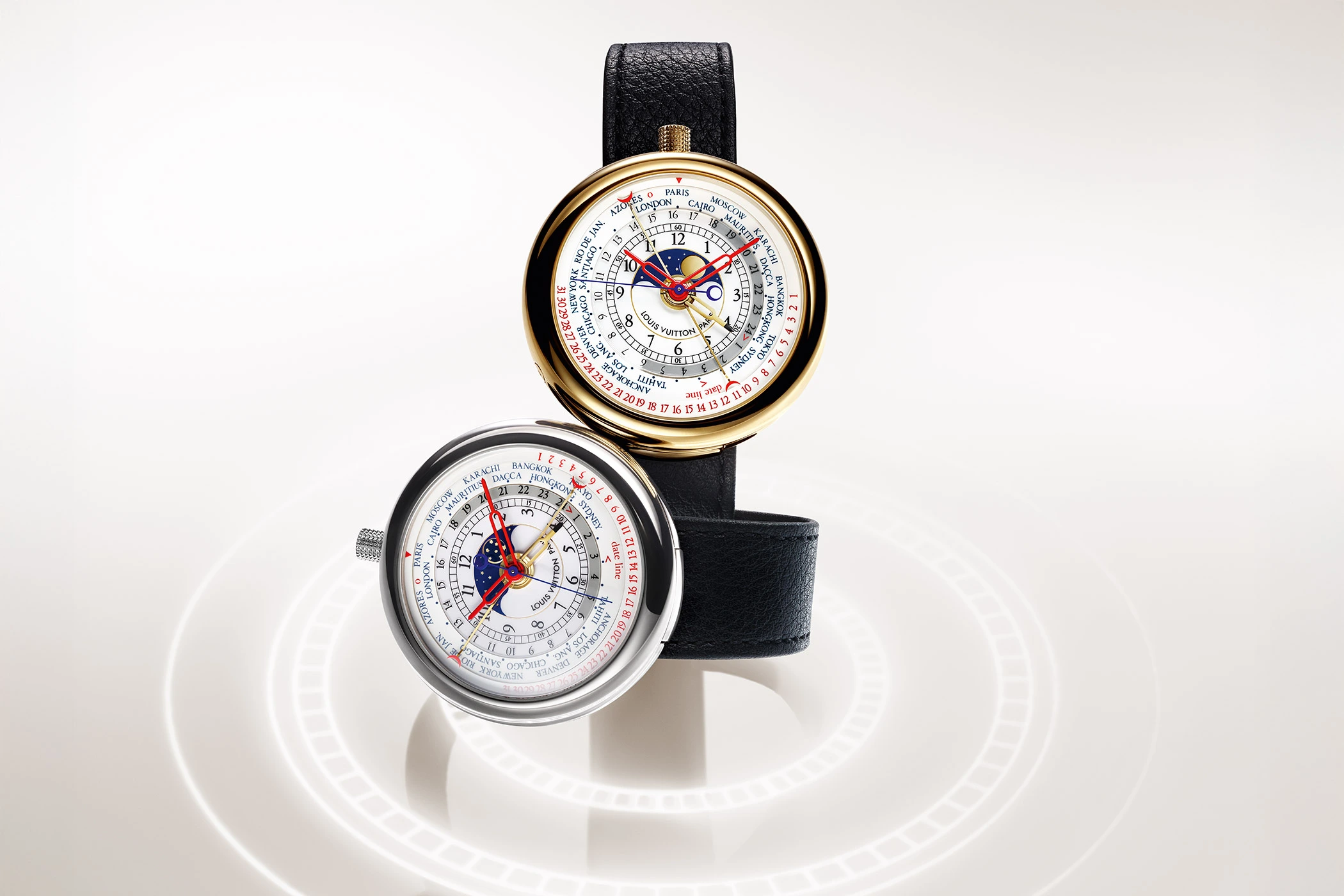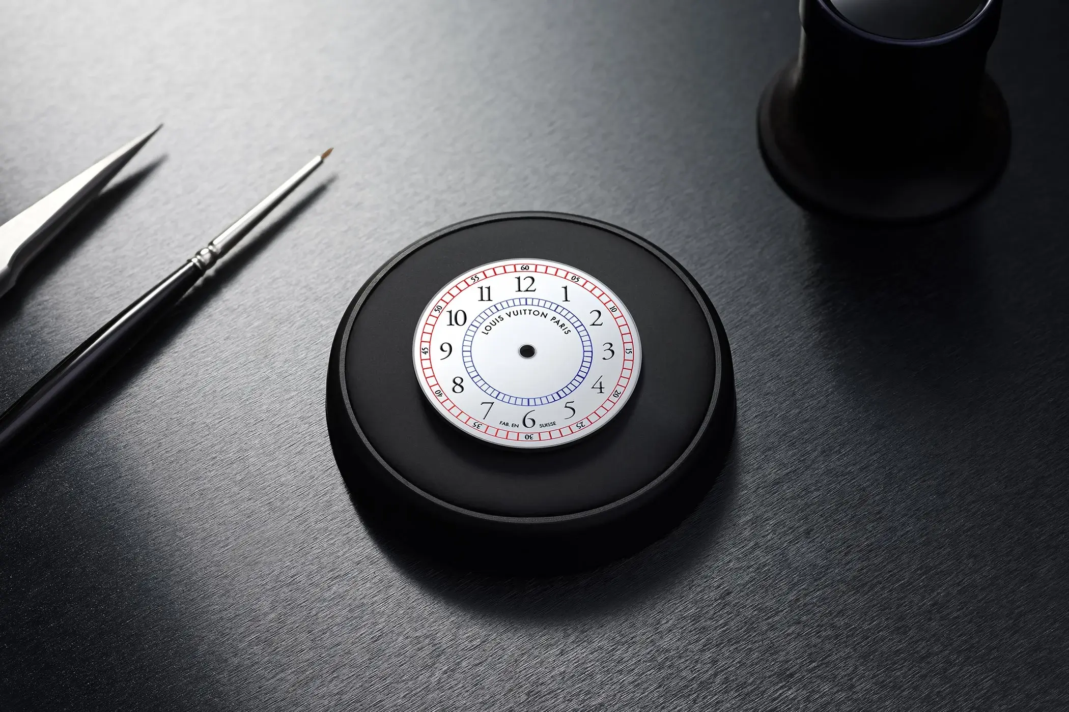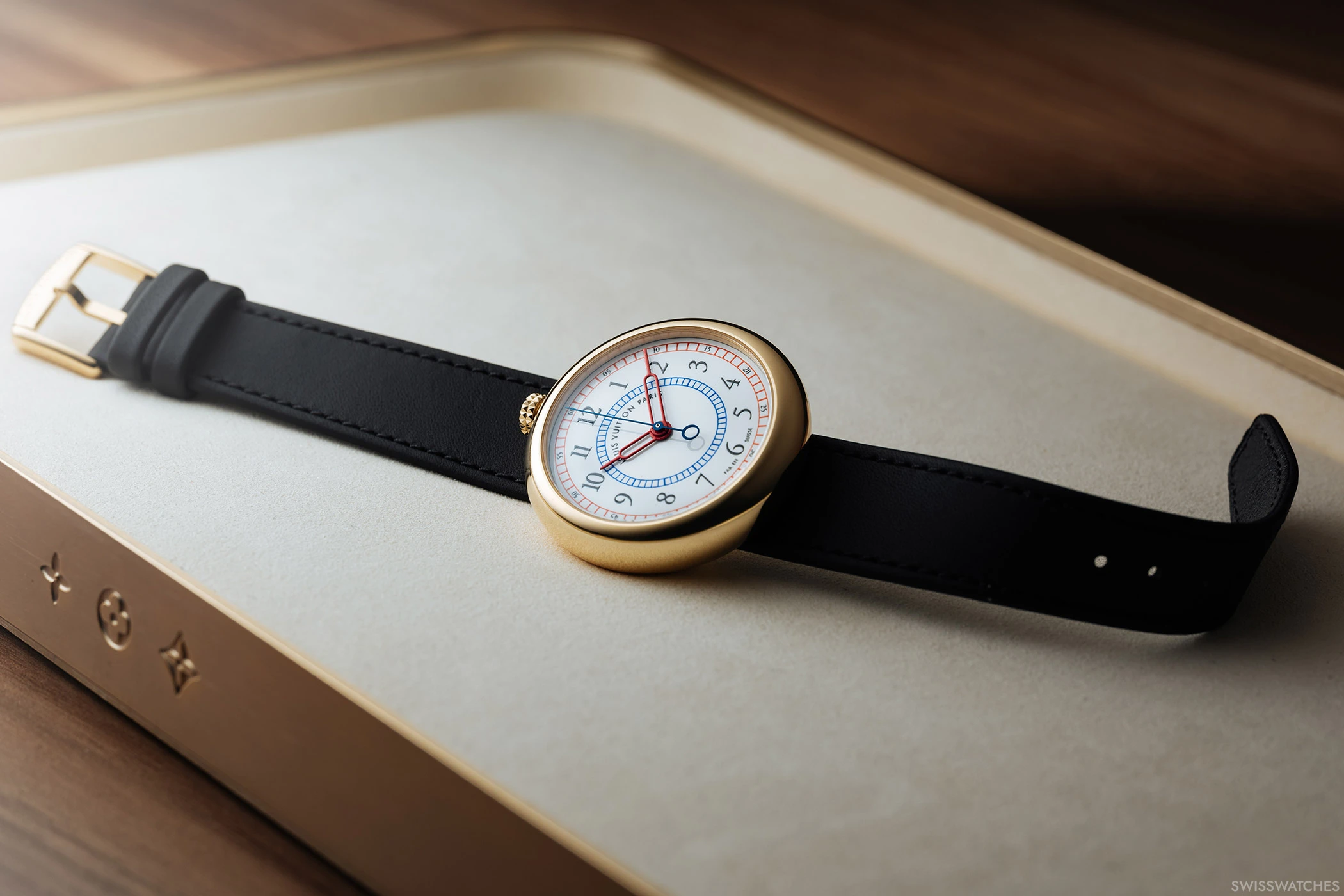 Die Farben finden sich auch in den passenden Zeigern aus Weißgold wieder – sie sind spritzenförmig und mit rotem Lack eingefasst – sowie in einem Sekundenzeiger aus gebläutem Stahl, die zusammen an die Originalmodelle erinnern. Die beiden Signaturen „FAB. EN SUISSE“ und, etwas prominenter, „LOUIS VUITTON PARIS“ runden das Zifferblatt ab und bekräftigen die doppelte Identität der Uhr: Schweizer Uhrmacherkunst und Pariser Stil.