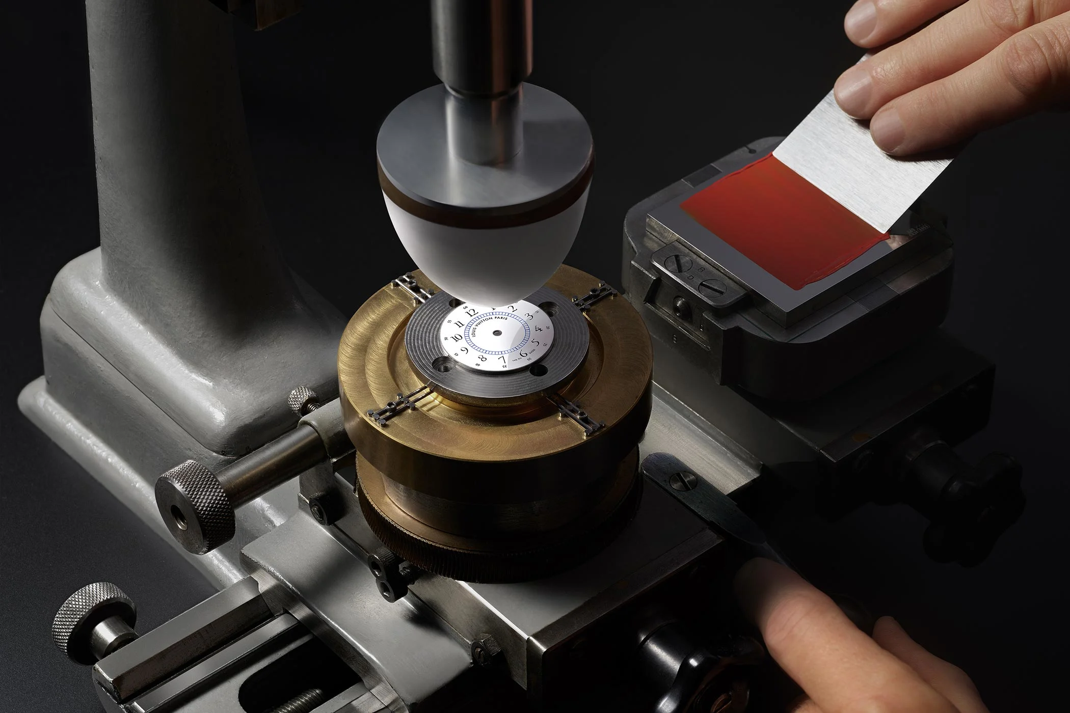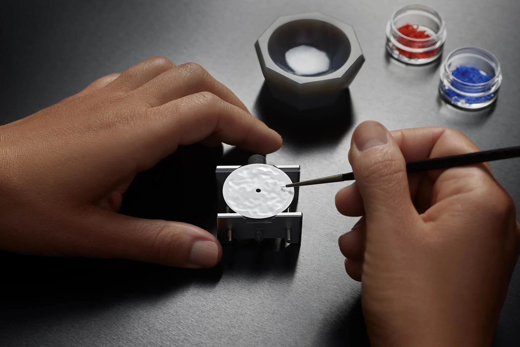 Anschließend wird das Zifferblatt mit Papierglas poliert, um eine makellos glatte Oberfläche zu erzielen, bevor es langsam bei 720 °C gebrannt wird – ein Vorgang, der zehnmal wiederholt wird, um den weichen, opalartigen Glanz zu erzielen, der für echtes, von Hand aufgetragenes Emaille charakteristisch ist. Erst dann beginnt der Stempelvorgang: Das gemahlene Emaillepulver in Blau-, Rot- oder Schwarztönen wird zu einer glatten, pastösen Konsistenz gemischt, die sich ideal für präzises Emaille-Stempeln eignet. Im Laufe von zwei akribischen Stunden werden die charakteristischen Grafiken des Zifferblatts aufgebaut, wobei jede Farbe sorgfältig maschinell angepasst wird, um den gewünschten Farbton, die gewünschte Tiefe und das gewünschte Volumen zu erzielen. Für jeden Farbton sind insgesamt acht Anwendungen erforderlich – vier bei 460 °C gebrannt, gefolgt von weiteren vier bei 600 °C.