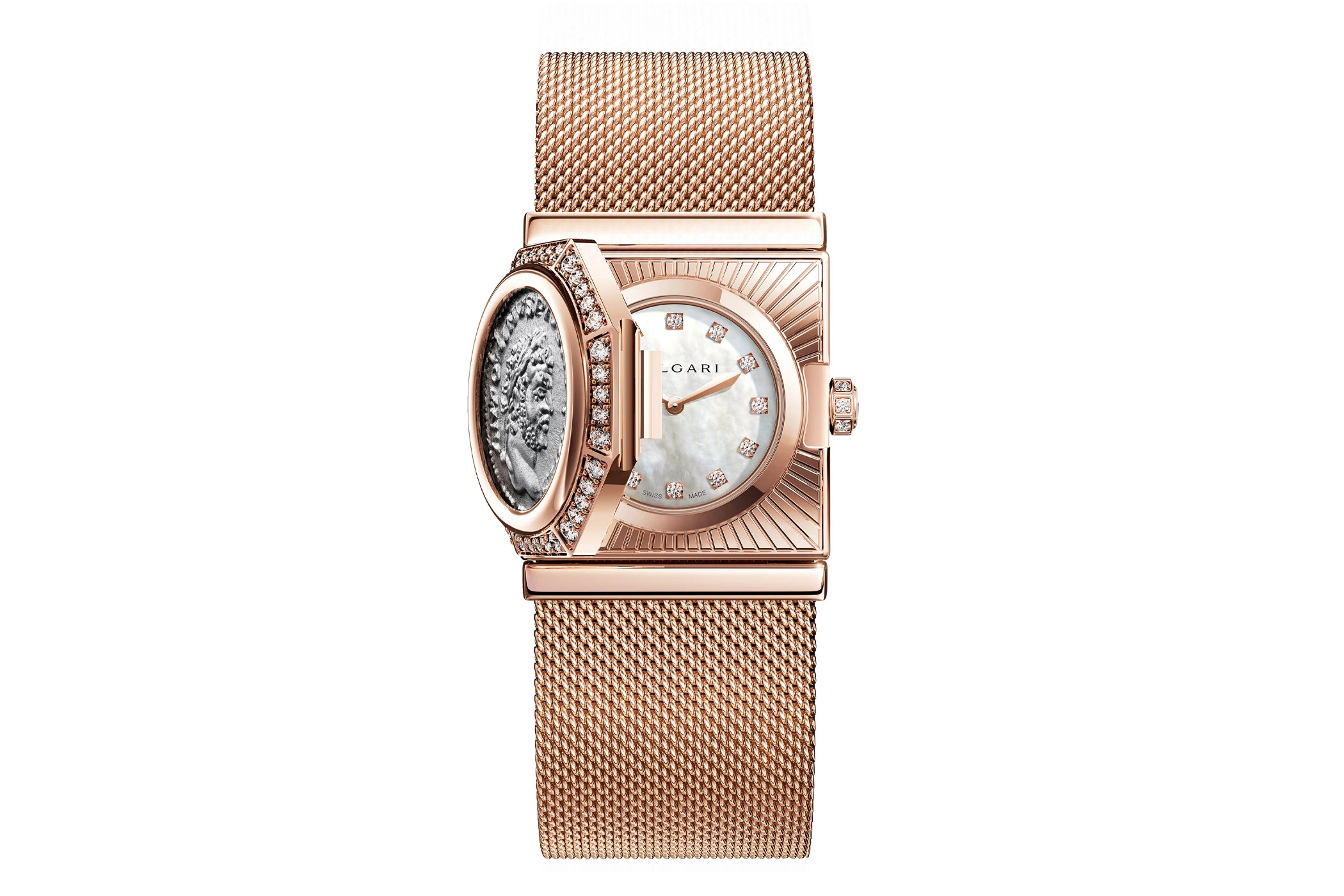 Die Münze, mit der Bulgari seine Wurzeln in der ewigen Stadt feiert, dient als aufklappbarer Deckel für das runde Zifferblatt aus weißem Perlmutt im Roségold-Gehäuse. Für reichlich Funkeln sorgen die zwölf Diamantindizes, 40 Brillanten auf dem achteckigen Münzdeckel sowie weitere Diamanten auf der Krone. Rosévergoldete Zeiger offenbaren bei geöffneter Uhr die präzise Zeit.