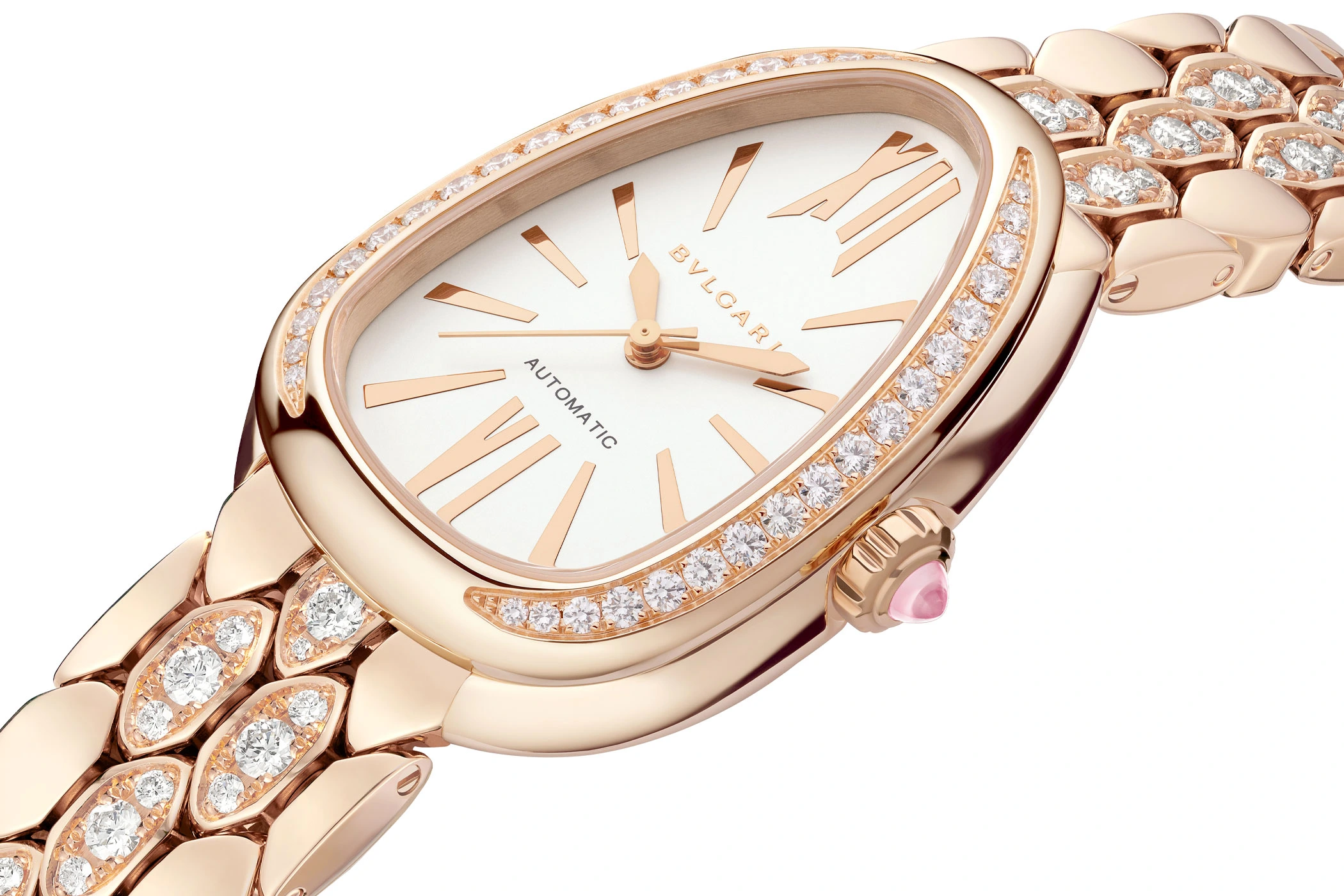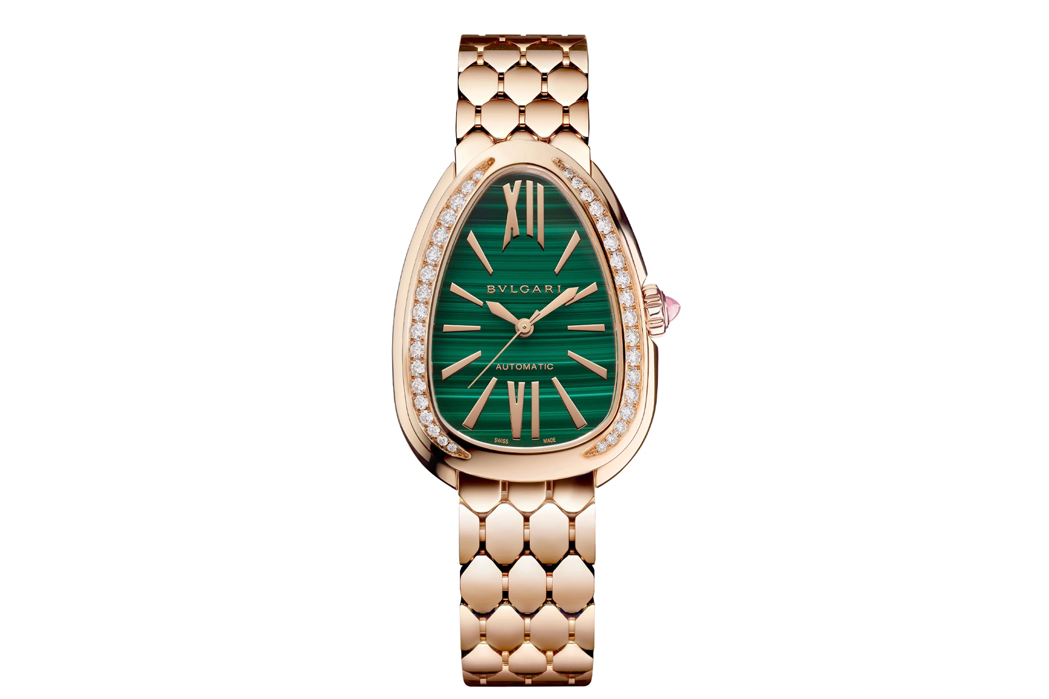 Die Opalin-Version der neuen Serpenti Seduttori Automatic verfügt über ein Armband aus sechseckigen, schuppenartigen Elementen, das mit 117 Brillanten besetzt ist. Die Malachit-Variante hingegen setzt auf Roségold pur als eleganten Gegenpart.