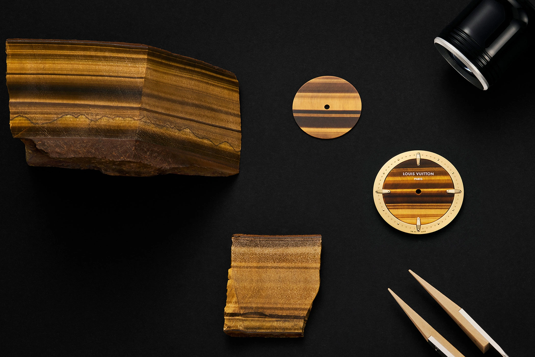 Das Tigerauge kommt bei der auf 30 Exemplare limitierten Tiger’s Eye nicht nur für das Zifferblatt zum Einsatz, sondern auch für Teile des Gehäuses. Viel Feingefühl ist erforderlich, um zum Beispiel natürliche Einschlüsse zu erkennen, welche die gesamte Konstruktion schwächen könnten. Zudem werden die von Hand polierten Tigeraugen-Elemente hinsichtlich Farbharmonie und Ausrichtung der Bänderung sorgfältig zu perfekten Paarungen kombiniert.