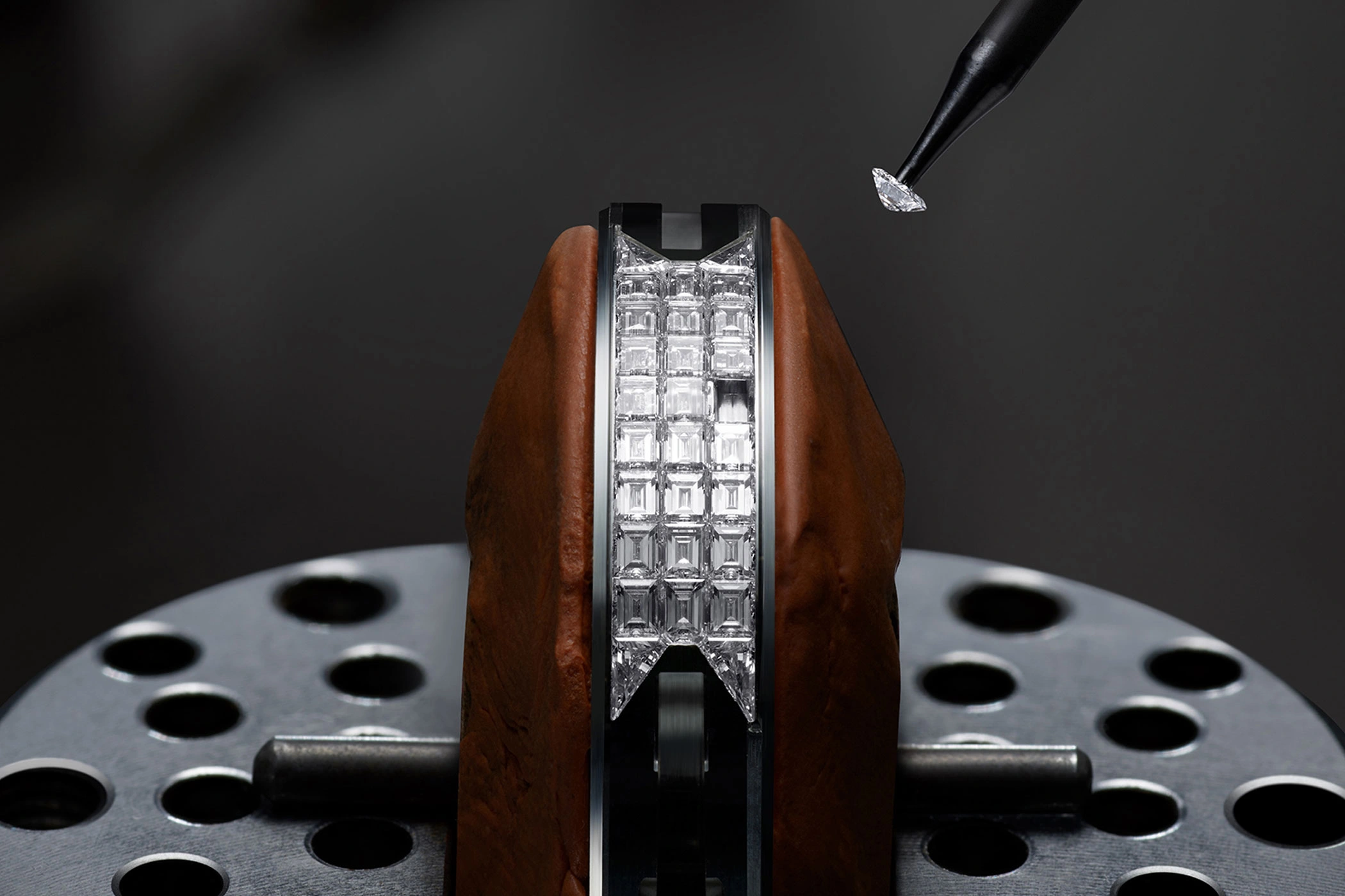 Letztere Variante setzt beim schützenden, bis fünf bar wasserdichten 40-Millimeter-Gehäuse auf Roségold. Zum Zifferblatt mit Aventurin und Diamant hingegen gesellt sich standesgemäß ein Platingehäuse, welches dank des Besatzes mit 170 Diamanten – ebenfalls im Baguetteschliff – einen Millimeter mehr beim Durchmesser aufweist. Auch hier verweist ein safranfarbener Saphir im Gehäuseboden auf die Verwendung des Edelmetalls. Elf weitere Diamanten befinden sich auf der Platin-Faltschließe des blauen Kalbslederbandes.