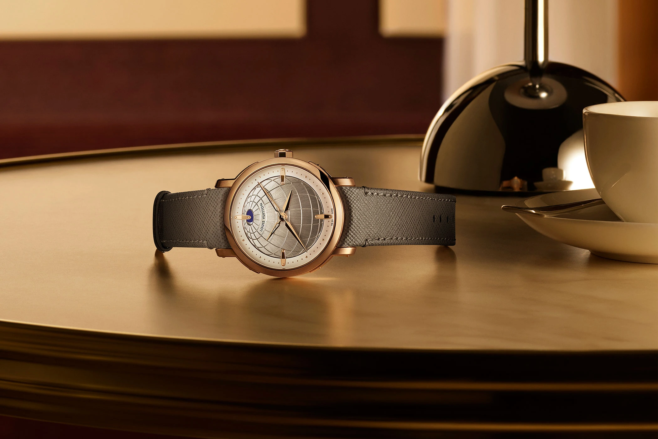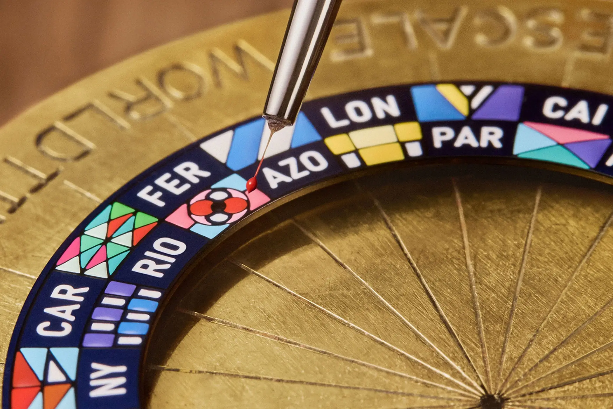 Der Clou: Die Escale Twin Zone verfügt über zwei Zeigersätze, die auf einer einzigen Achse angeordnet sind – eine Konstruktion, die bei GMT-Uhren selten zu finden ist. Hinzu kommt ein unabhängig verstellbarer Minutenzeiger, der eine minutengenaue Anpassung in allen Zeitzonen ermöglicht, auch in solchen mit nicht standardmäßigen Abweichungen. Die Justierung erfolgt über die zweistufige Krone. Die massiven Zeiger zeigen die Ortszeit an, die skelettierten die Heimatzeit. Die Tag/Nacht-Anzeige befindet sich oben auf dem gravierten Globus.