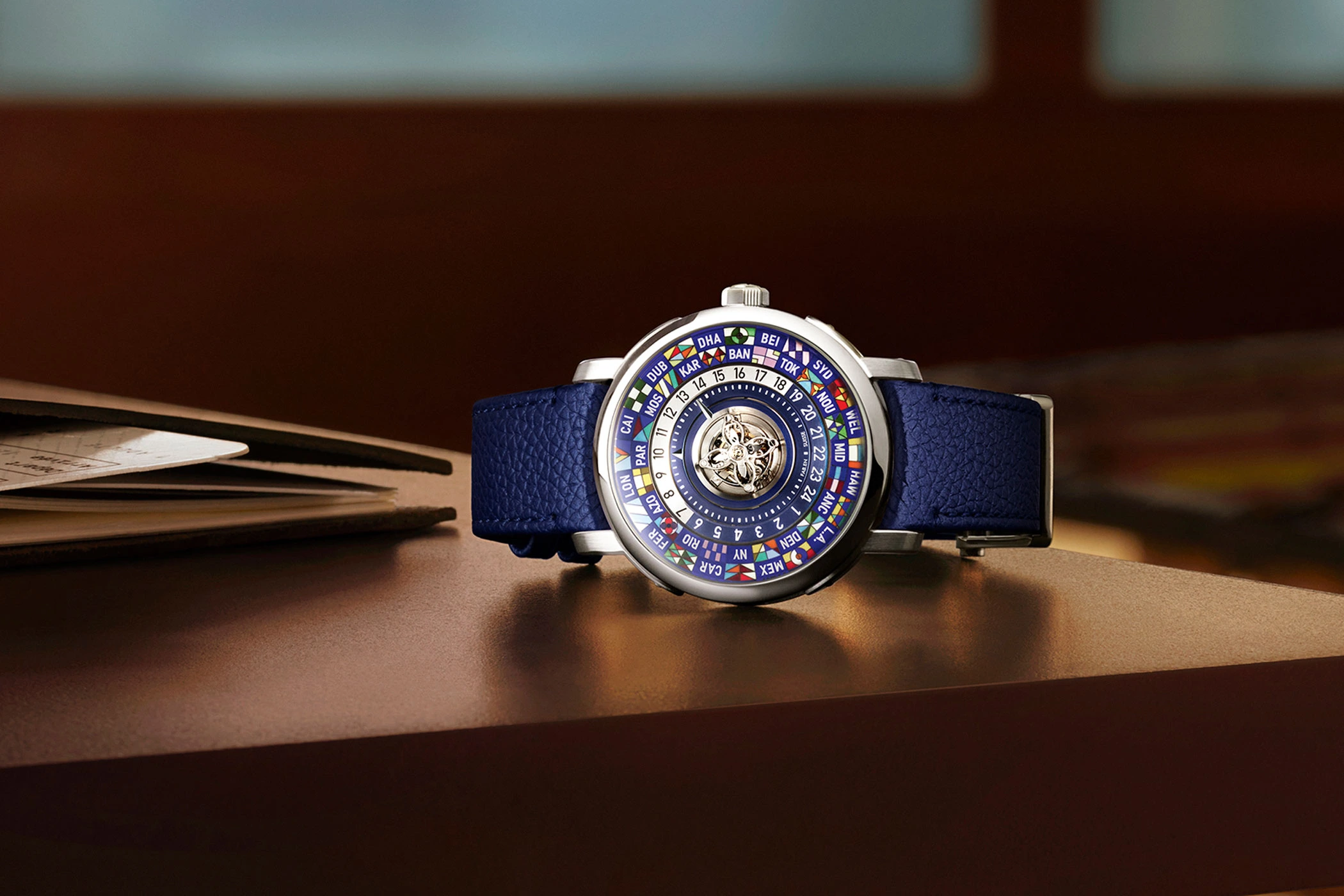Die Escale Worldtime zeigt 24 Zeitzonen an und kehrt in diesem Jahr mit zwei Platinmodellen zurück. Ein safranfarbener Saphir im Gehäuseboden verweist auf das Debüt des Edelmetalls in dieser Kollektion. Hingucker auf dem Zifferblatt mit springender Stundenscheibe ist der miniaturisierte, mit 35 Farben von Hand bemalte Weltzeitring. Für Orientierung sorgen der Minutenzeiger sowie der Indikator für die Referenzzeit aus Weißgold.