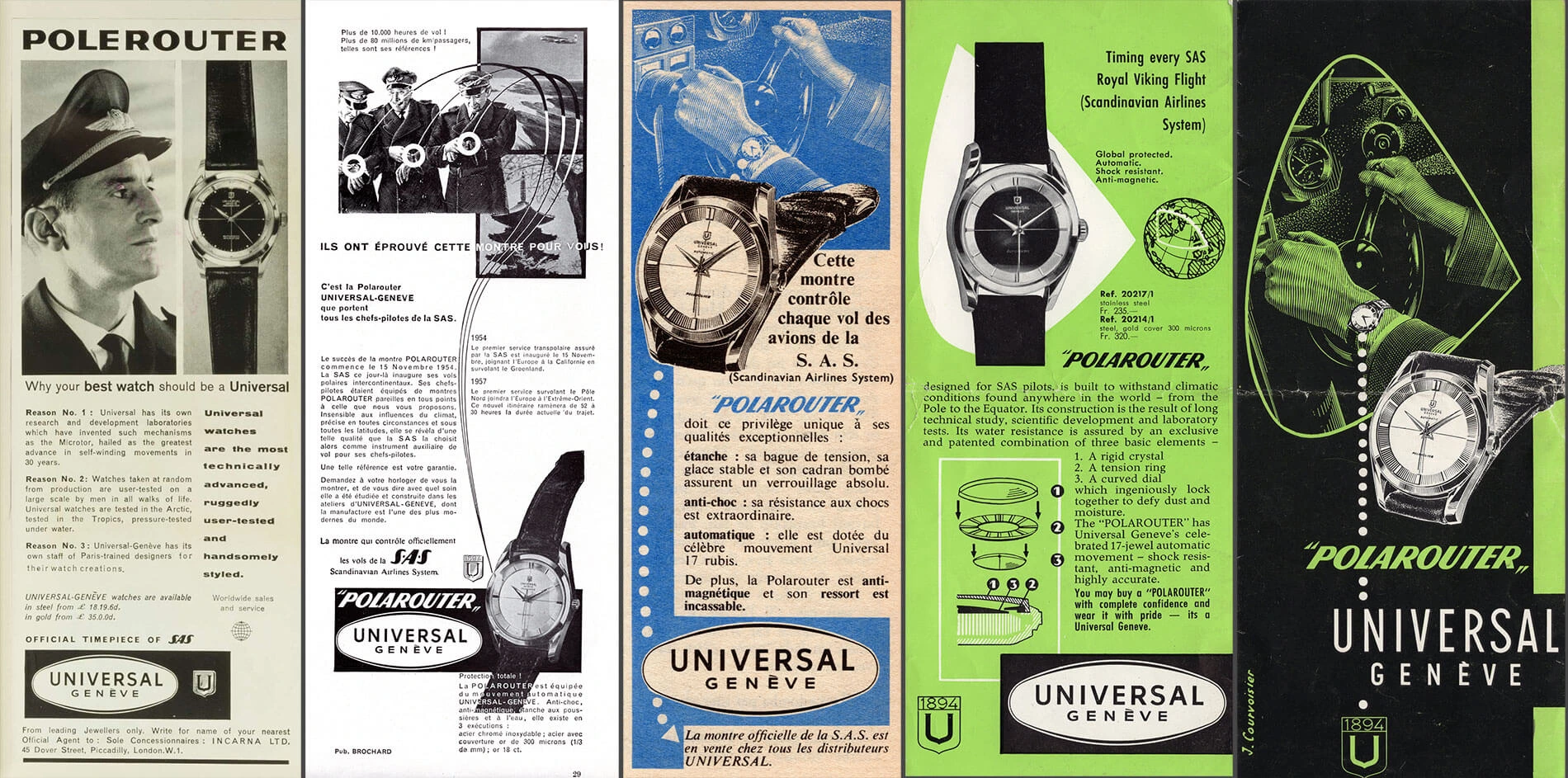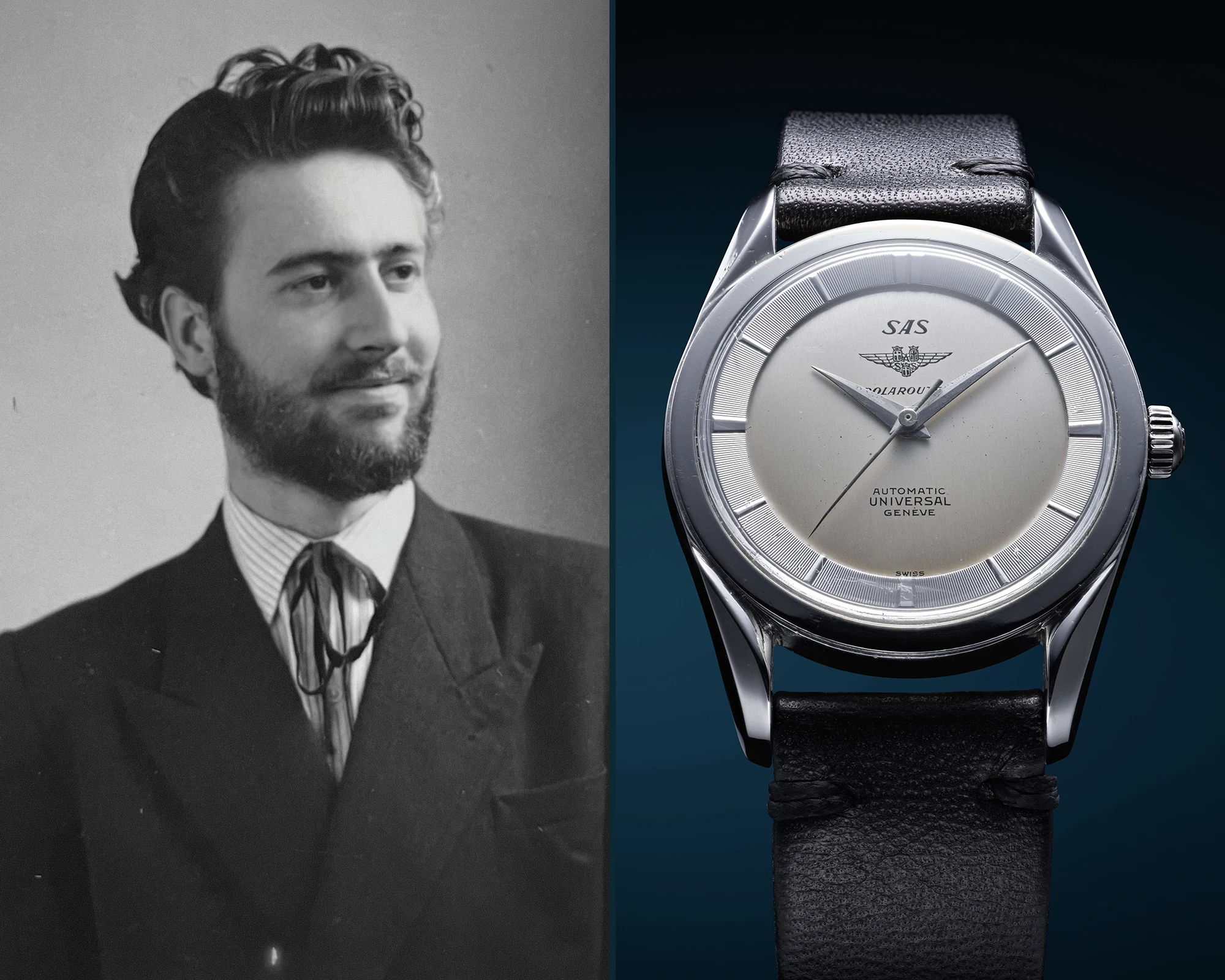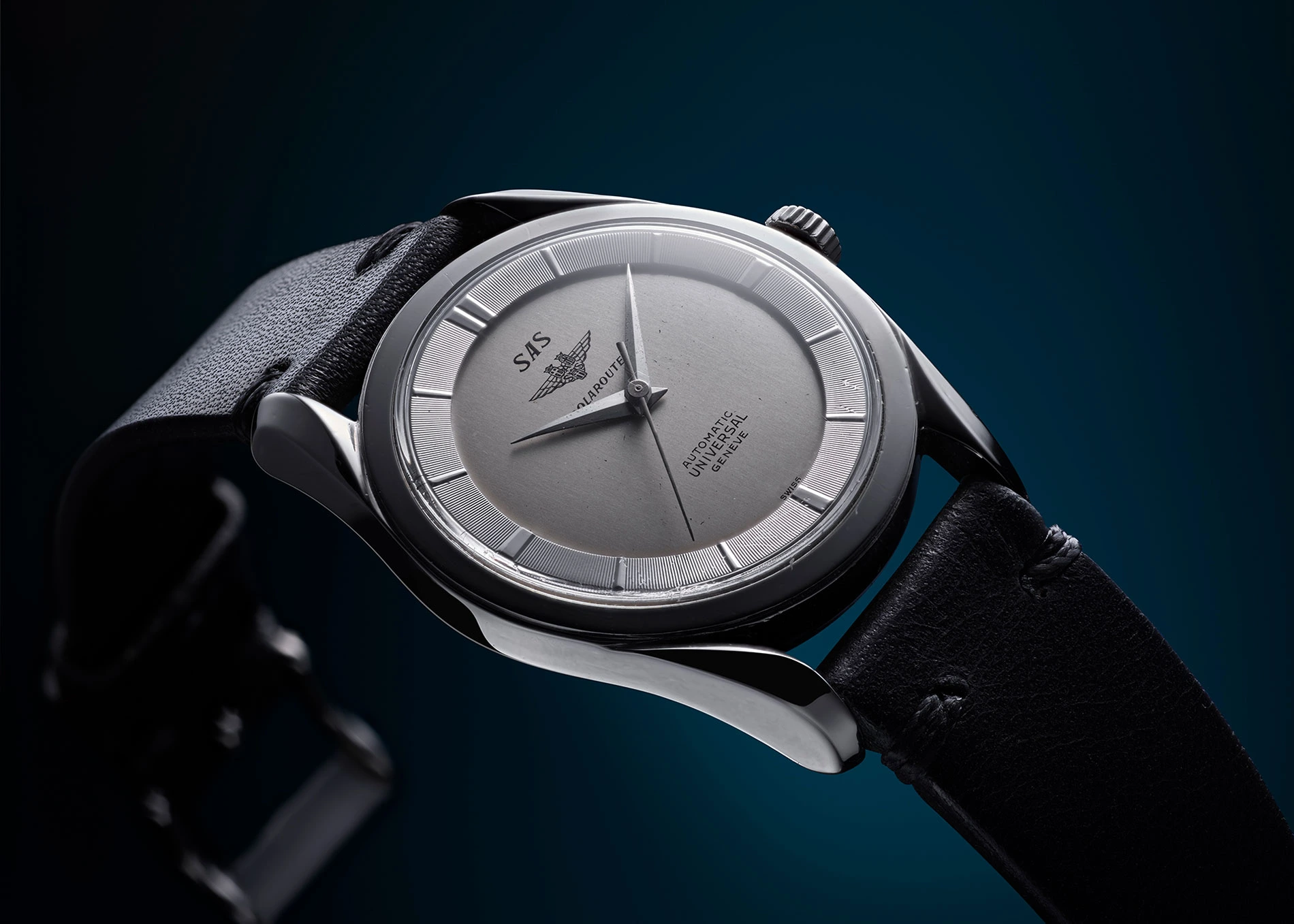 Die Geschichte von Universal Genève (UG) geht bis ins Jahr 1894 zurück, und schnell erarbeiteten sich Ulysse-Georges Perret und Numa-Emile Descombes, die Gründer des Hauses, einen hervorragenden Ruf. Die Universal Genève Polerouter aber ist eine Schöpfung der 1950er Jahre, sie wurde ursprünglich auf Wunsch der Fluglinie Scandinavian Airlines (SAS), gebaut. Für den ersten Transatlantikflug über den Nordpol von Kopenhagen nach Los Angeles wollte die Fluglinie eine verlässliche Uhr für die Piloten ihrer Douglas DC-6B, und „UG“ erschien den Airline-Verantwortlichen als der beste Partner. Dort wiederum wandte man sich an Gérald Genta, der das markante Design der Uhr entwickelte – wobei die ersten Modelle der Universal Genève Polerouter allerdings noch ohne das inzwischen typische „Fadenkreuz“ auf dem Zifferblatt an die Piloten übergeben wurde.