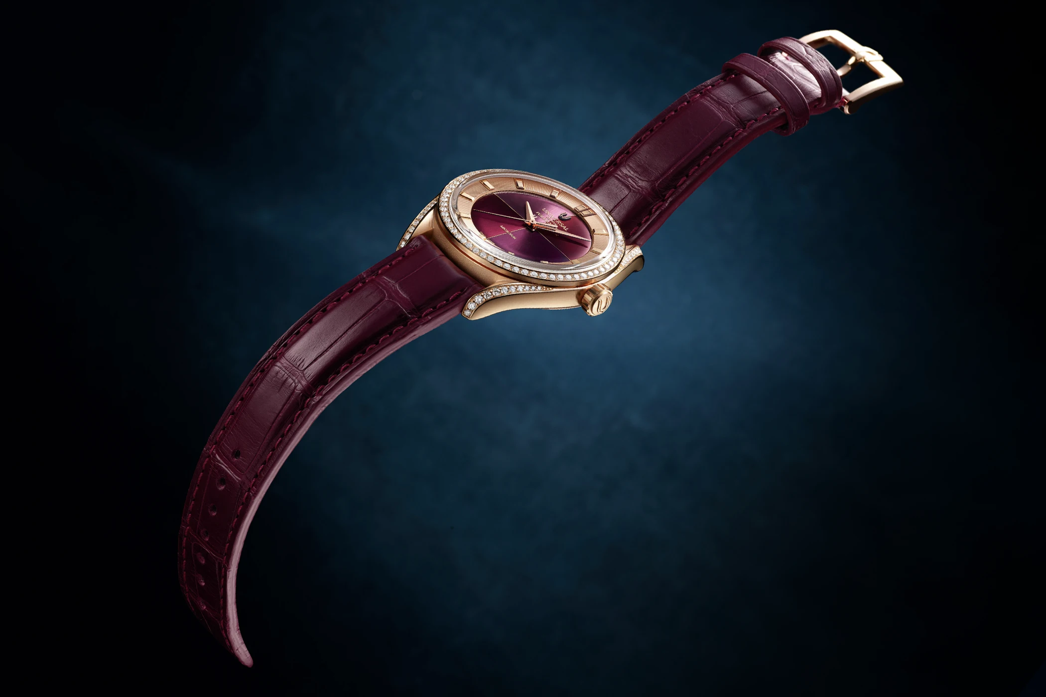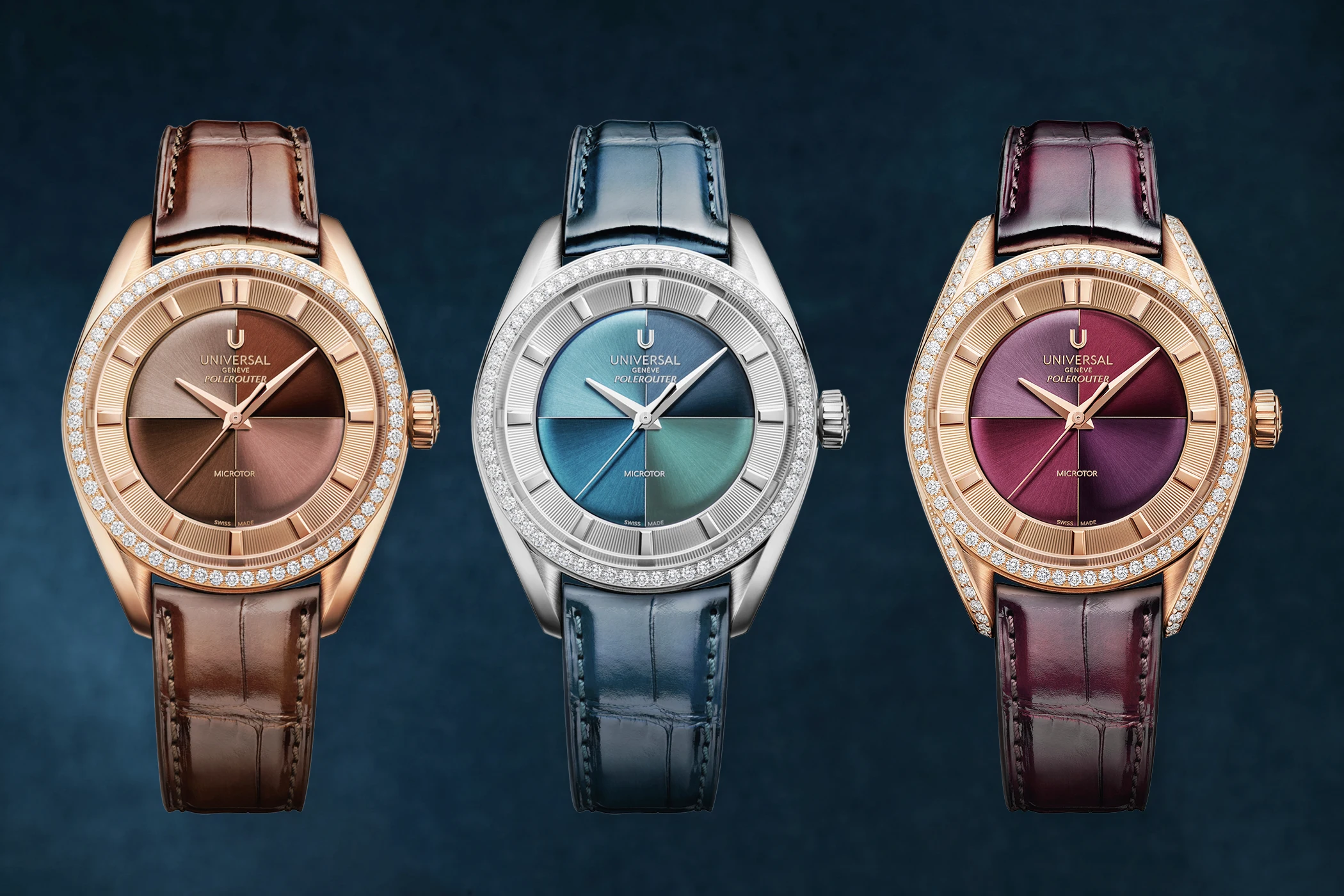 Capsule, also eine kleinere und zeitlich begrenzte Kollektion, sind die drei Polerouter Camaïeu. Deren Name bezieht sich auf eine raffinierte Maltechnik, die bei dem durch das typische Polerouter-Fadenkreuz in vier Viertel aufgeteilte Zifferblatt für Inspiration sorgte: Jedes Viertel hat einen etwas anderen Farbton, bei der Stahlvariante mit Diamantlünette sind es beispielsweise vier Schattierungen die unter dem Namen „Aqua Mint“ zusammengefasst werden (UGPO011). Hinzu kommen roségoldene Versionen mit „Toffee“-braunen Tönen (UGPO010) und eine „Berry“-rote Farbwelt (UGPO012).