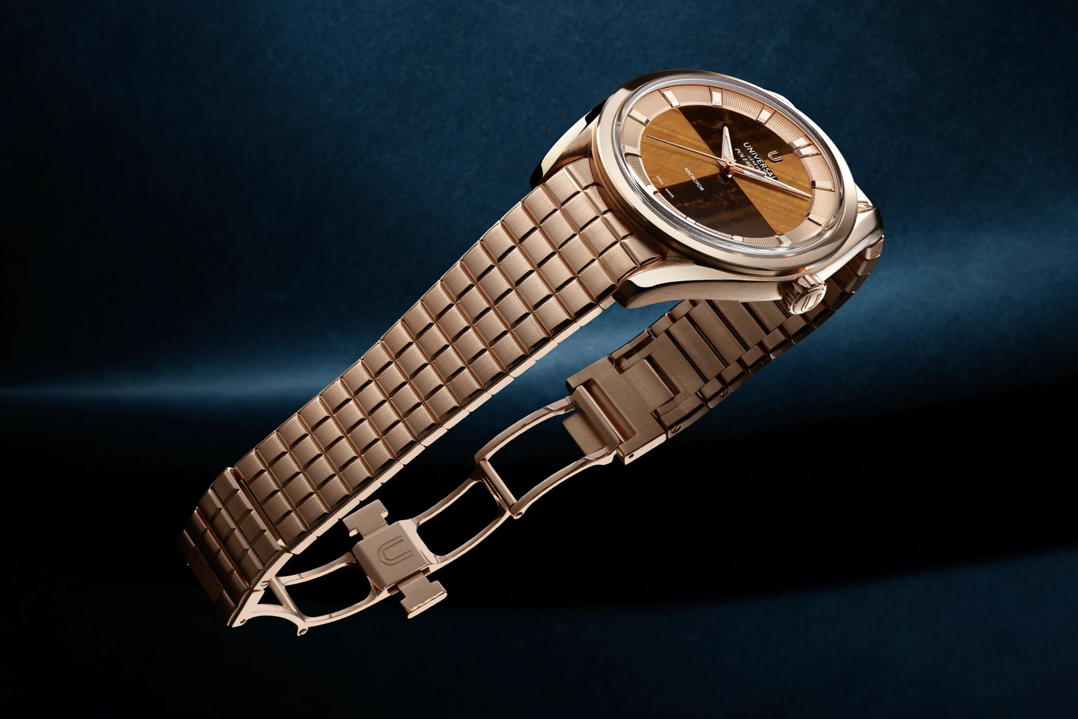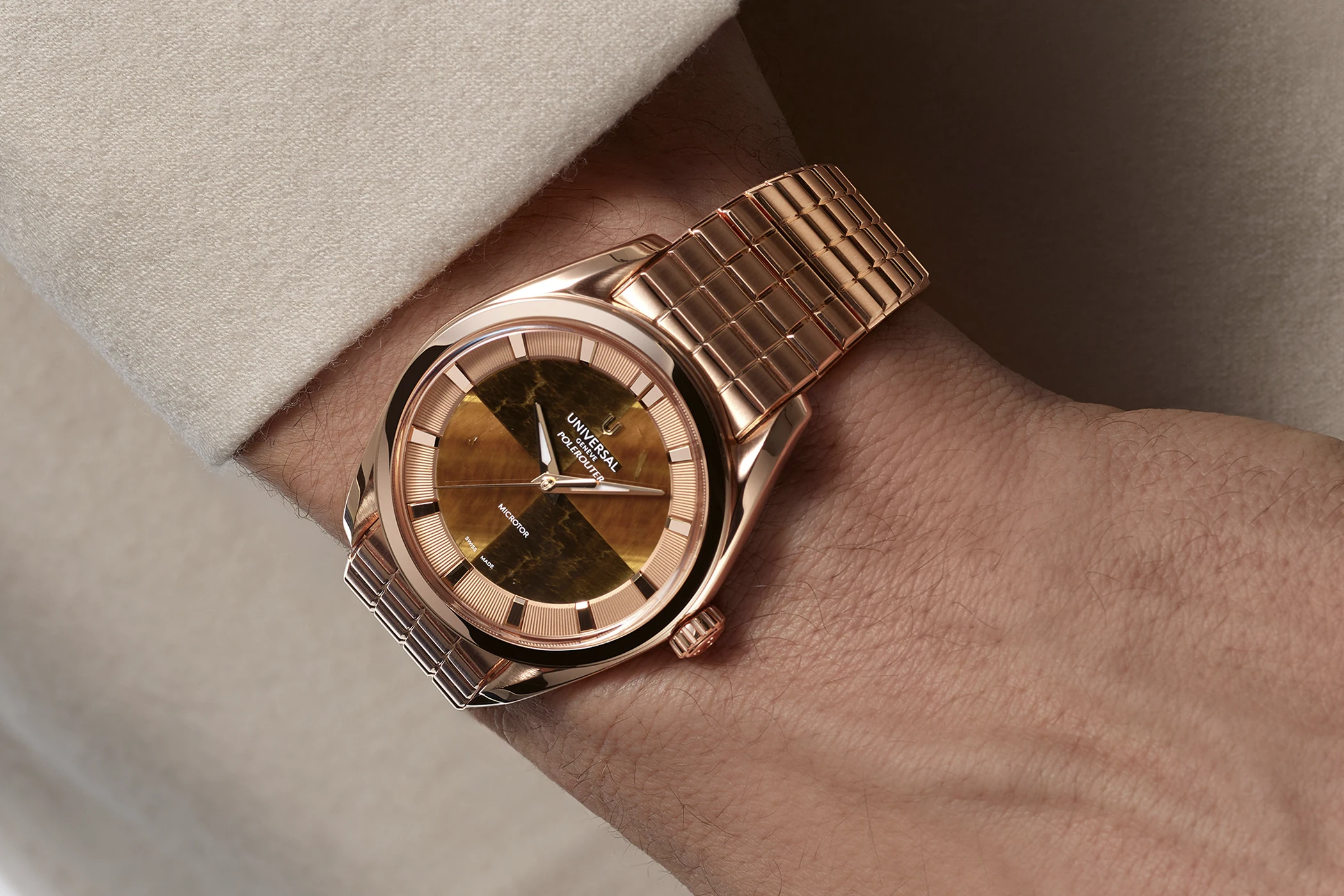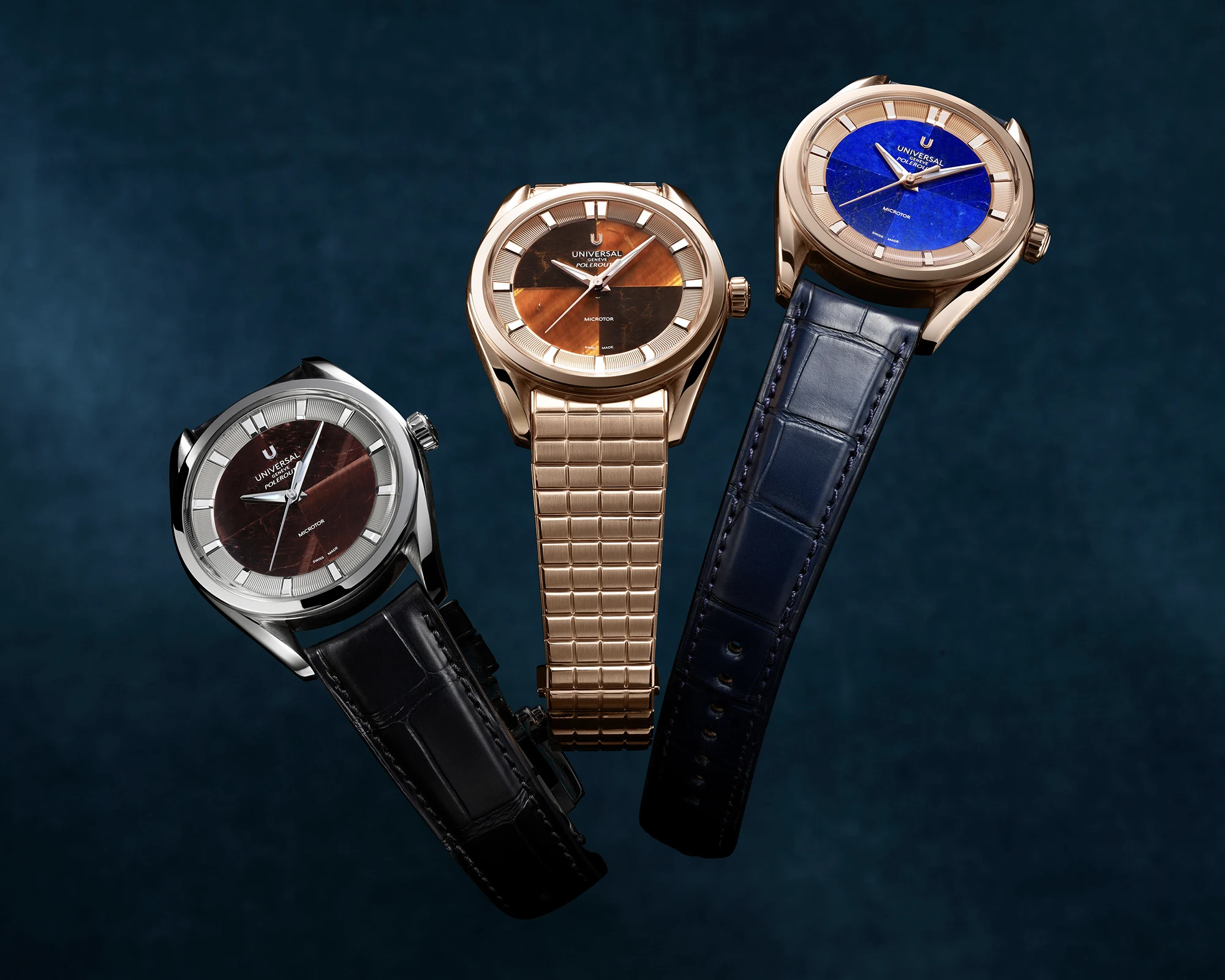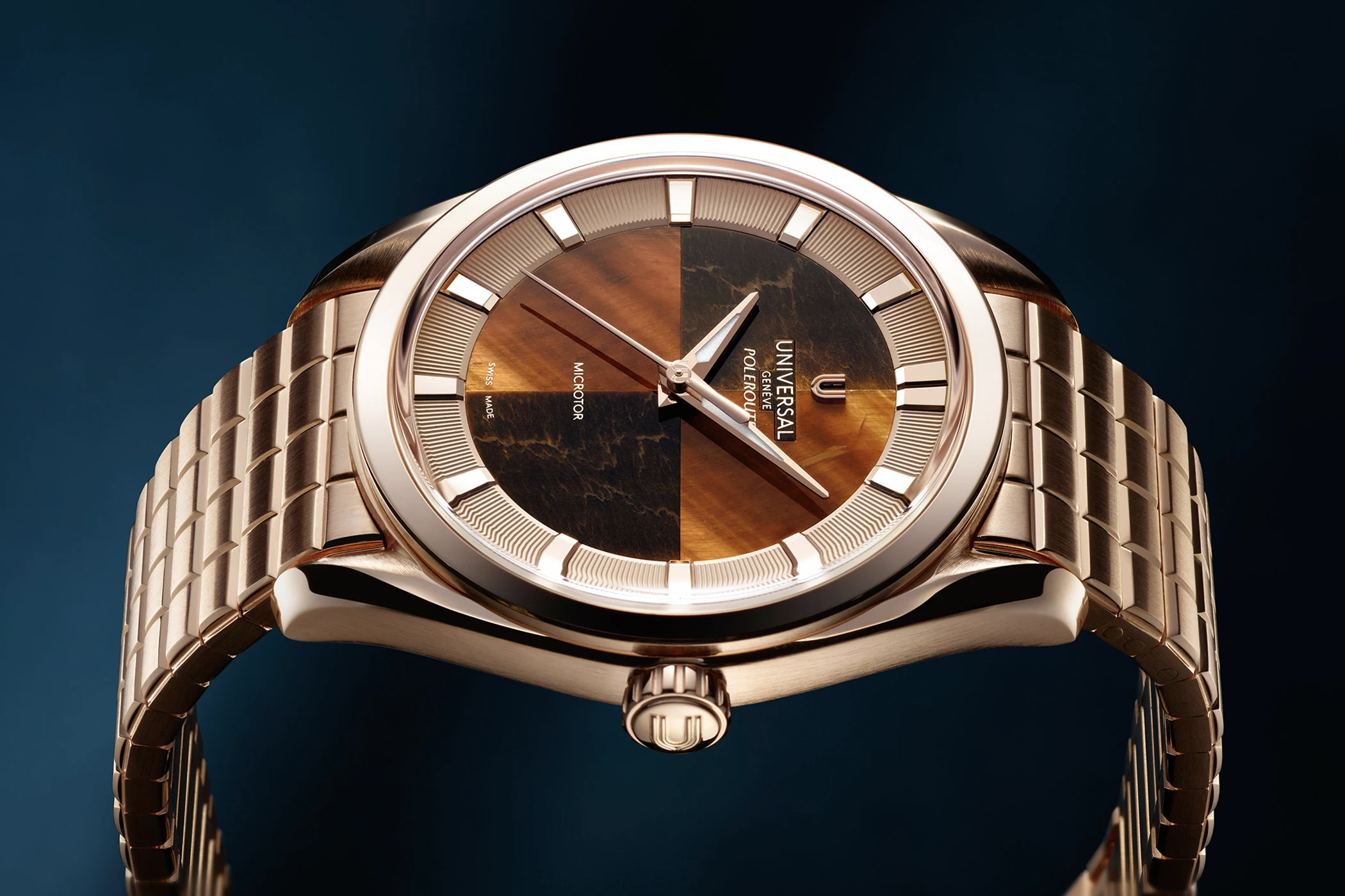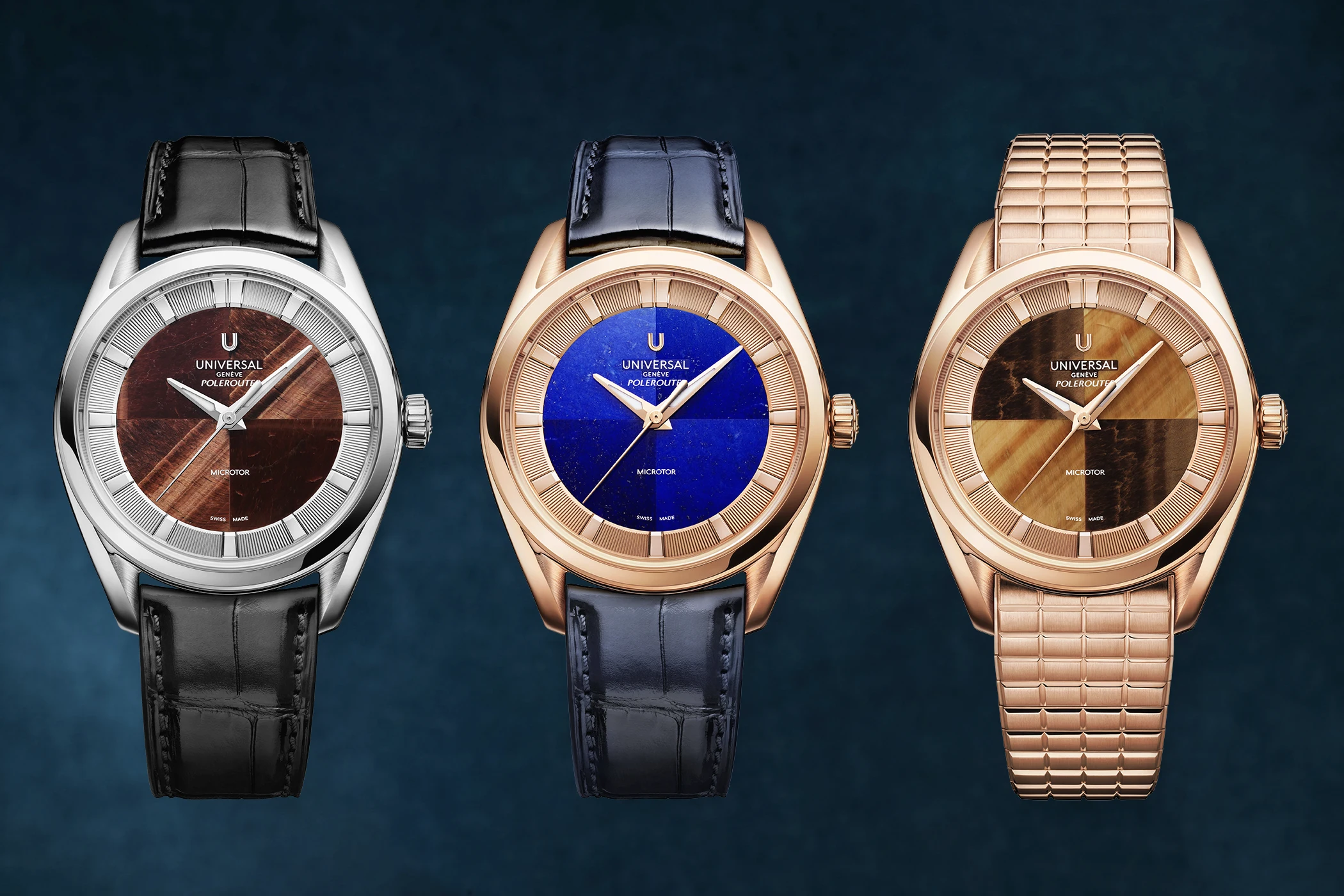 Noch eine Nuance modischer präsentieren sich die drei Geschwister aus der Capsule-Kollektion: Da ist zum einen die Stahlvariante mit rötlich-braunem Steinblatt aus Bullenauge (UGPO004), und dann die beiden Roségold-Modelle der Universal Genève Polerouter, einmal mit einem Blatt aus tiefblauem Lapislazuli in Kombination mit einem blauen Lederarmband (UGPO005) sowie die wohl lauteste Polerouter in diesem Format: Ausgestattet ist sie mit einem Blatt aus Tigerauge und einem massiv-roségoldenen Armband (UGPO005). Auf die Datumsanzeige wird hier verzichtet, was die Uhren trotz ihrer exotischen Steinblätter noch etwas purer und klarer wirken lässt.