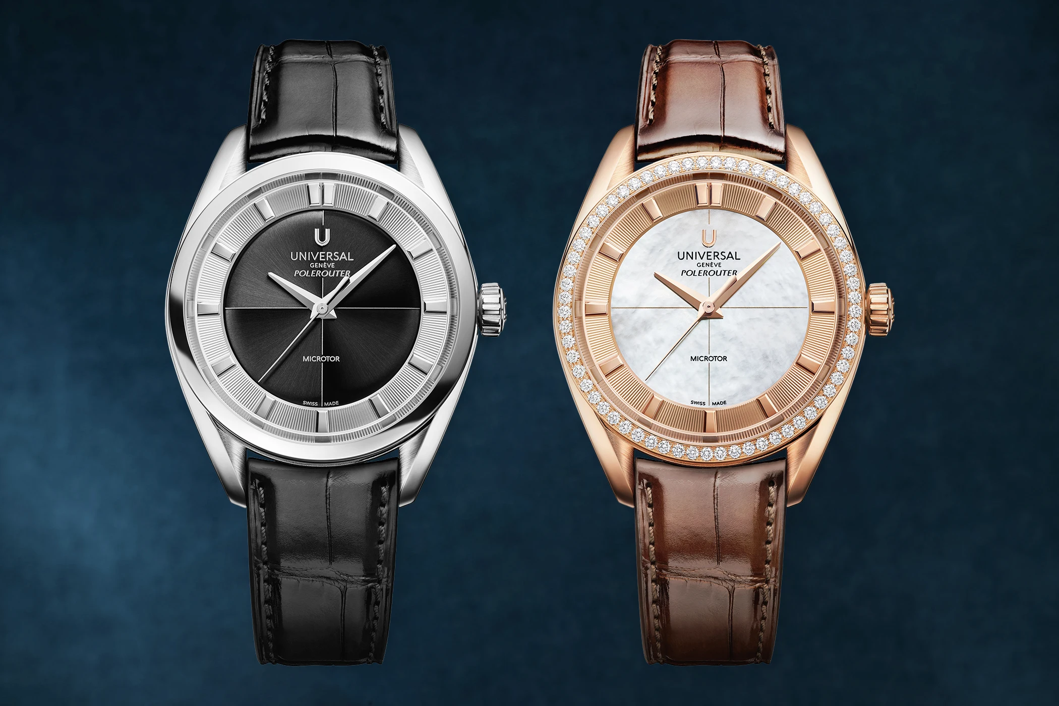 Zur Prêt-à-Porter-Hauptkollektion gehört dabei natürlich die 39-Millimeter-Stahl-Version der Universal Genève Polerouter mit blauem Blatt und viergliedrigem Metallarmband (UGPO001), sie erinnert besonders an die historischen Polerouter-Modelle und hat einen besonderen Vintage-Chic. Die Drei-Zeiger-Uhr mit Datumsanzeige gibt es ebenfalls in Stahl mit schwarzem Blatt und schwarzem Lederarmband (UGPO003) oder in Roségold mit braunem Zifferblatt (UGPO002). Die vermeintlich schlichten Zifferblätter der Universal Genève Polerouter Modelle sind dabei die stillen Stars: Sie sind sowohl mit Sonnenschliff satiniert als auch einem kreisförmigen Bürstenschliff versehen. Diese doppelte Veredelung schafft eine beeindruckende Tiefe und sorgt für Reflexe, in denen sich die Betrachter ewig verlieren können.