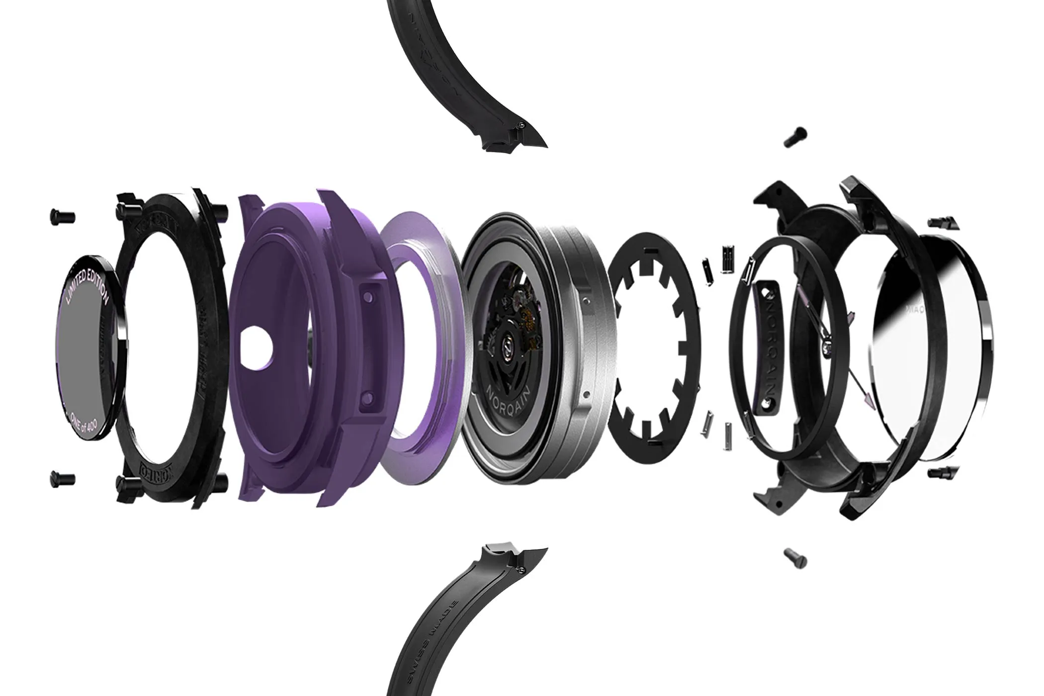Das violette Kautschukarmband greift die Farbe des Mittelsegments im Gehäuse auf und sorgt in Kombination mit der leichten Materialwahl für hohen Tragekomfort. Norqain bietet zwei Schließenvarianten an: eine klassische Dornschließe aus schwarzem Norteq oder eine DLC-beschichtete Titan-Faltschließe mit schwarzer Norteq-Platte.