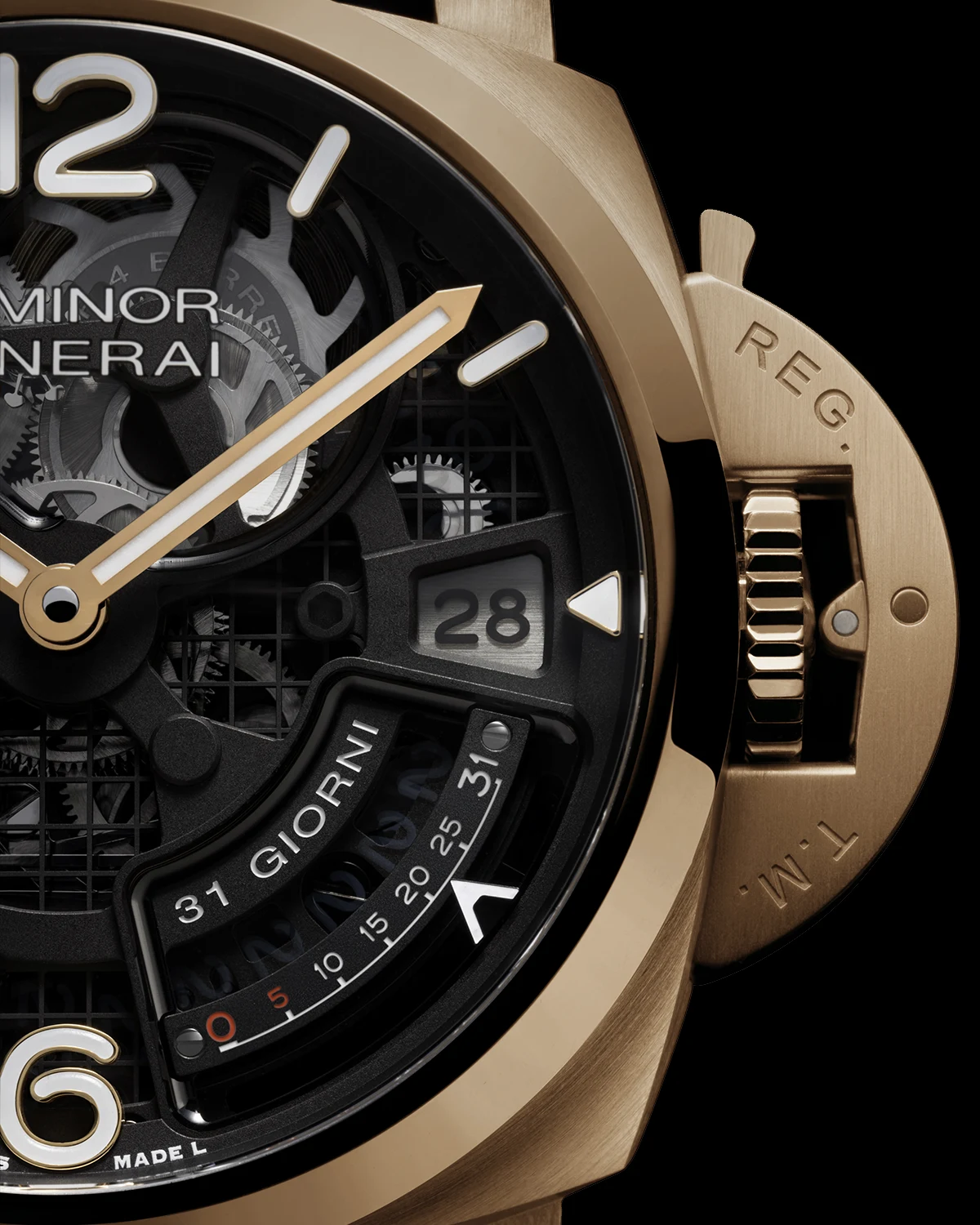 Auch optisch bleibt die Uhr klar als Panerai erkennbar. Die 44 Millimeter große Luminor wird in der bekannten, hauseigenen Panerai Goldtech Legierung gefertigt, einer hauseigenen Legierung aus Gold und Kupfer mit Zusätzen von Platin und Silber. Das sorgt für den warmen, rötlichen Ton des Gehäuses. Dazu kommt ein offen gestaltetes Zifferblatt, das Teile des Werks sichtbar macht, ohne die typische Luminor-Optik zu verlieren. Die skelettierte Konstruktion, die gebogene Gangreserveanzeige am Rand des Kalibers und die polarisierte Datumsanzeige bei 3 Uhr geben der Uhr Tiefe, ohne überladen zu wirken. Für die Ablesbarkeit setzt Panerai auf weißes Super-LumiNova X2 auf Zeigern und Indizes.