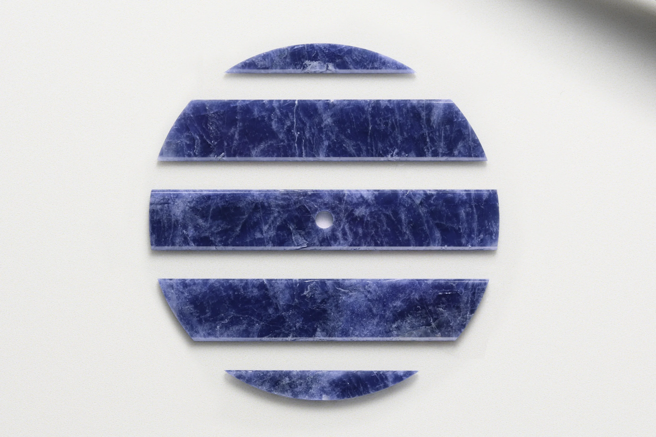 Bei der Polo 79 ist dies besonders komplex, da das Zifferblatt durch die Godronierungen in mehrere Segmente unterteilt ist. Entsprechend müssen die Edelsteine individuell zugeschnitten werden. In der aktuellen Kollektion war die Polo 79 bislang mit Onyx- oder Lapislazuli-Zifferblatt erhältlich. Nun ergänzt Sodalith als seltener Schmuckstein das Portfolio. Ihm werden symbolisch Klarheit, innere Ruhe und Selbstvertrauen zugeschrieben.