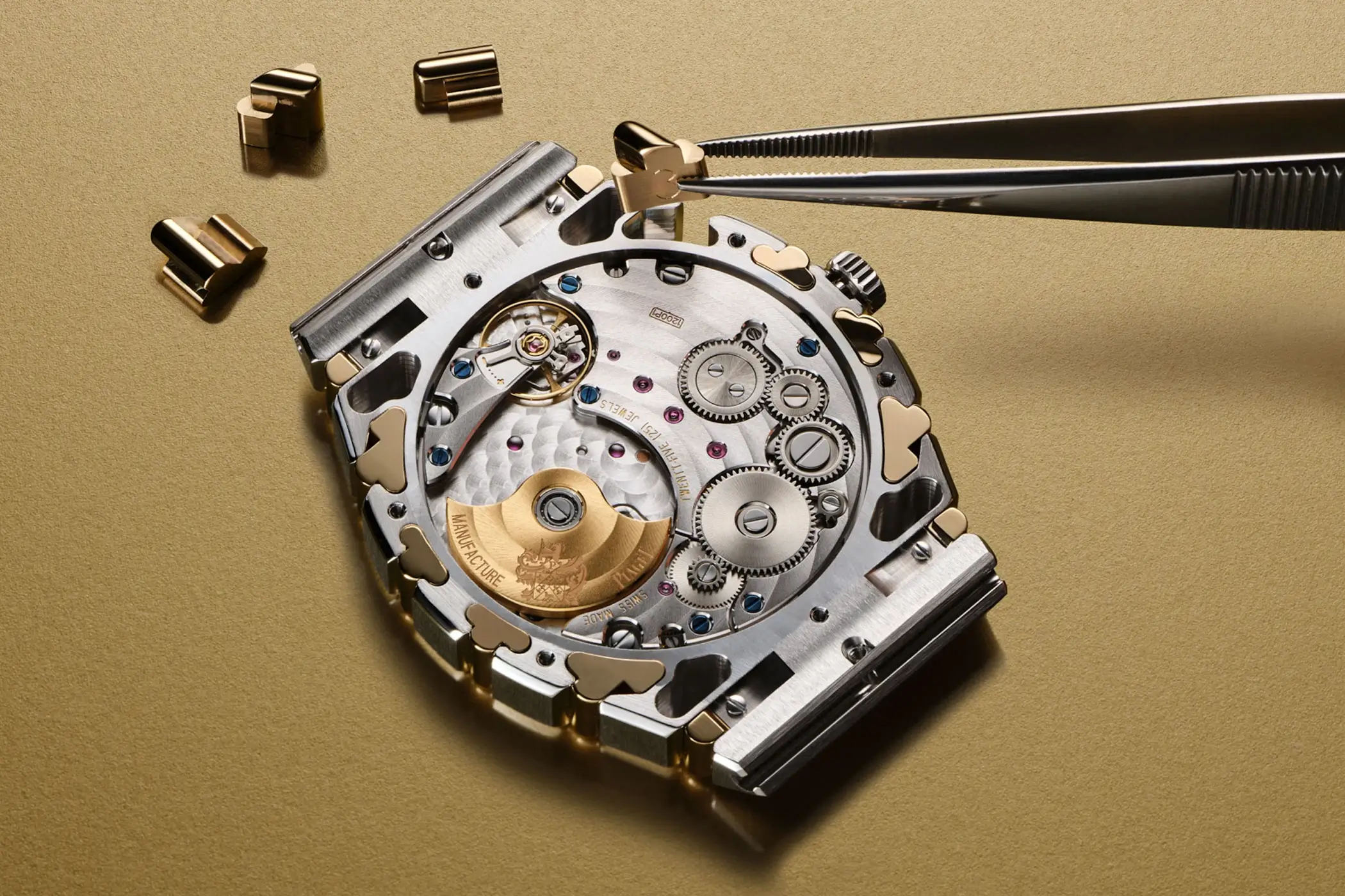 Weniger stattlich, denn technisch raffiniert erweist sich das Innenleben der Piaget Polo 79 Two-Tone. Das Kaliber 1200P1 mit Mikrorotor misst 29,9 Millimeter im Durchmesser und lediglich 2,35 Millimeter in der Höhe. Damit gehört es zu den ultraflachen Automatikantrieben von Piaget. Es oszilliert mit gemäßigten 3 Hertz (21.600 Halbschwingungen pro Stunde) und bietet eine 44-stündige Gangreserve.