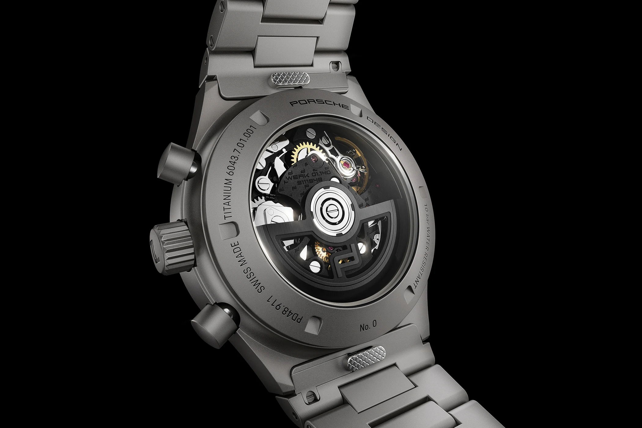 Mit einem glasperlengestrahlten Titangehäuse und Titanarmband verleiht Porsche Design auch der Chronograph 1 – All Titanium Numbered Edition jene Eigenschaften, die bereits bei der IWC Porsche Design Titan Chronograph aus dem Jahr 1981 zum Tragen kamen: eine geringe Dichte, hohe Festigkeit, eine ausgeprägte Korrosions- und Temperaturbeständigkeit sowie amagnetische und hautverträgliche Eigenschaften. Das Gehäuse des Porsche Design Chronograph 1 – All Titanium Numbered Edition verfügt über einen Durchmesser von 40,80 mm bei einer Höhe von 14,15 mm, während die verschraubte Krone und die Chronographendrücker ebenfalls aus Titan gefertigt sind. Dreht man die Uhr um, erblickt man durch den Saphirglasboden das Porsche Design Kaliber WERK 01.140 mit seinem schwarz-grauen Aufzugsrotor mit Porsche Design Logo. Umrandet wird der Saphirglasboden von der fortlaufenden Nummerierung des jeweiligen Exemplars sowie dem Verweis auf die Wasserdichtigkeit des Gehäuses bis 100 Meter.
